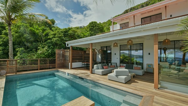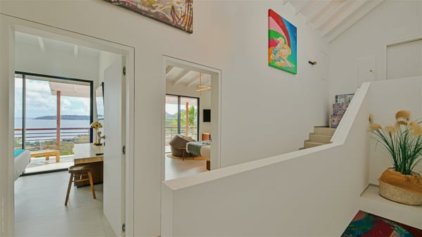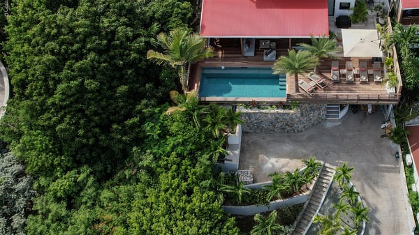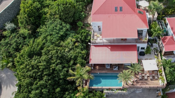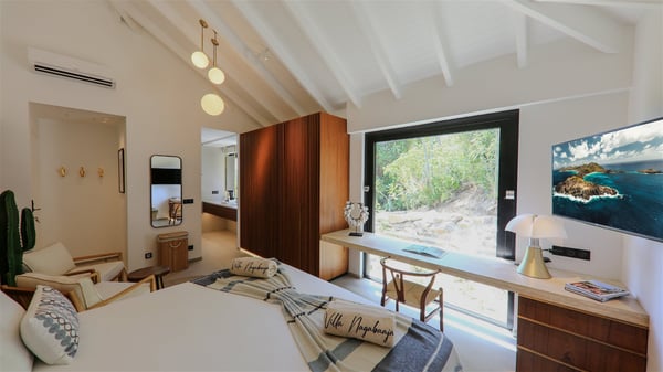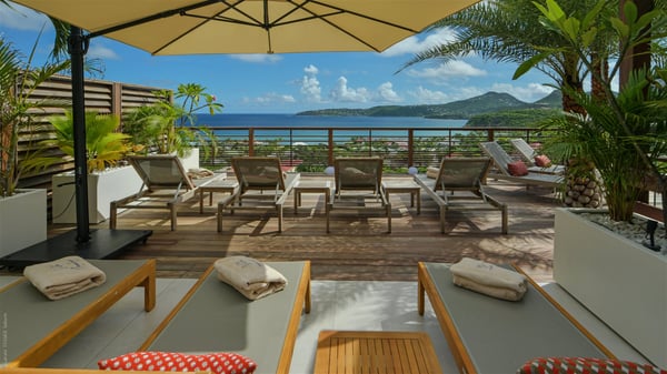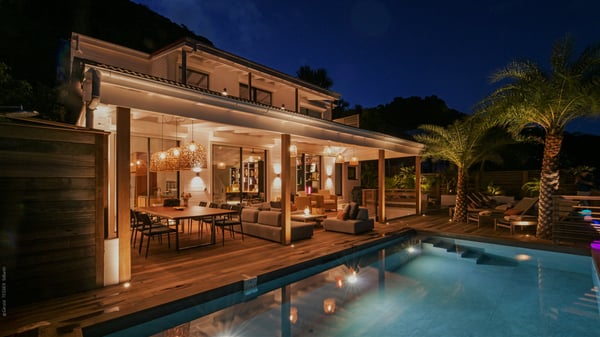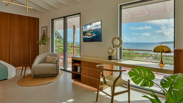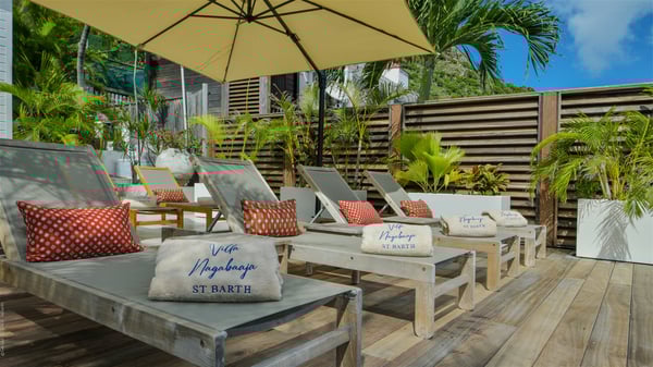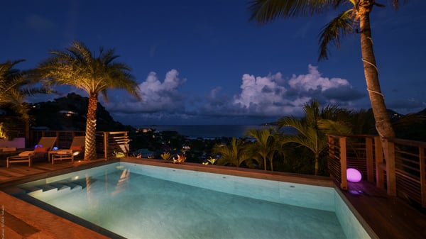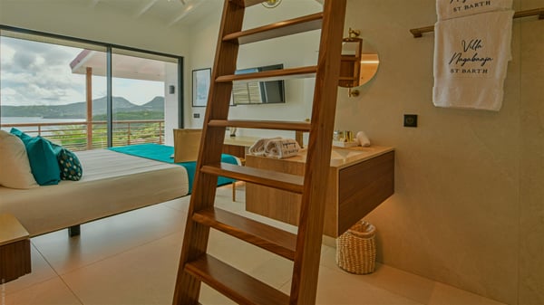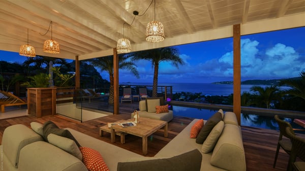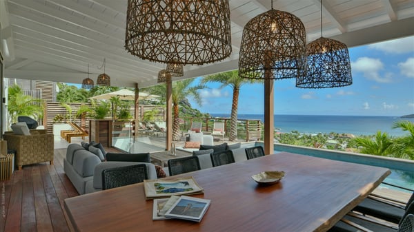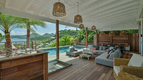 Located on a hillside in Anse des Cayes, the rental villa Nagabaaja is a charming four-bedroom property with a splendid view of the ocean and the hills. Close to Gustavia and St-Jean, this vacation home welcomes you for your next stay with family or friends in St-Barths. Built over two levels, the vacation villa Nagabaaja in St. Barths opens onto a breathtakingly beautiful panorama over the sparkling ocean. The air-conditioned living room is furnished with a sofa and armchairs in front of a flat-screen TV, close to the staircase which leads to the two bedrooms located upstairs. The charming, well-equipped kitchen made of wood combined with modern stainless steel is perfect to cook meals and prepare cocktails to be sipped in front of the view. In this very private setup, the atmosphere is peaceful, while the trade winds gently sweep the room, unless you prefer to air-condition this cozy indoor space and enjoy the quiet. The terrace located at the front of the villa faces the view over the deep blue ocean and the coastline through the wooded hills. Under the covered area, a large dining room that can accommodate up to twelve guests is furnished in a maritime style, the perfect place for delightful al fresco dinners under beautiful lights. You will also enjoy the swimming pool in front of a view, and will relax while sunbathing or reading on the deck chairs at your disposal. There is also a pleasant outdoor lounge in front of the panorama, for unique moments in the mild air of the island. The vacation rental villa Nagabaaja has four air-conditioned bedrooms with en-suite bathrooms. Spread over two levels, they are furnished with king-size beds and are spacious and well-equipped. Two of them offer a beautiful ocean view, while the other two open onto the tropical garden, which brings exoticism to your dream vacation. In a beautiful environment, Villa Nagabaaja is the perfect place for an unforgettable getaway in St Barths.