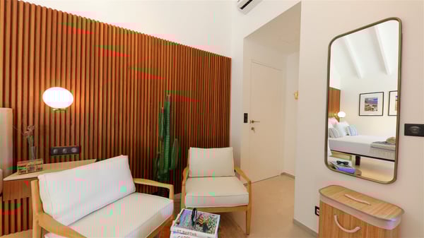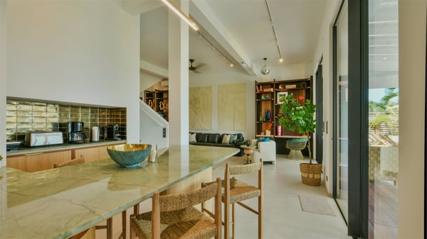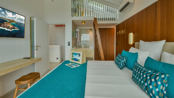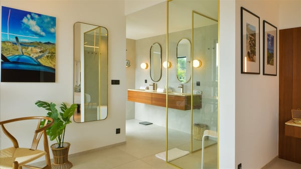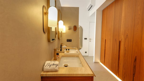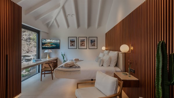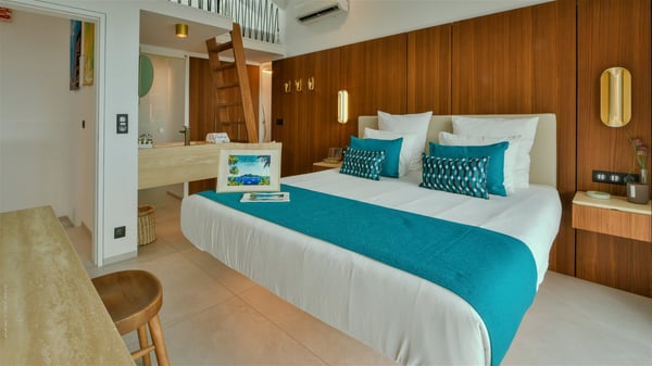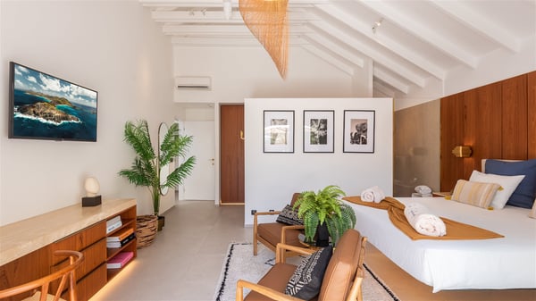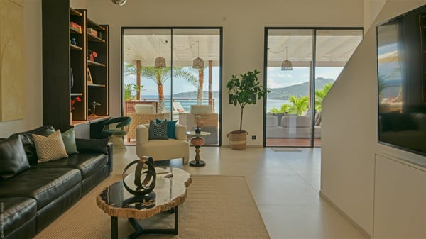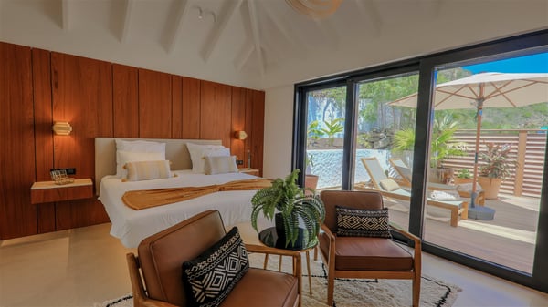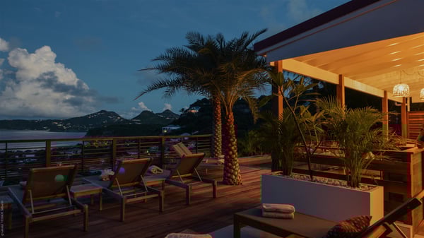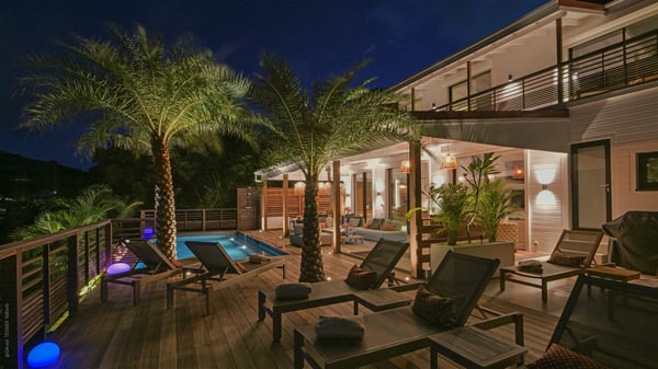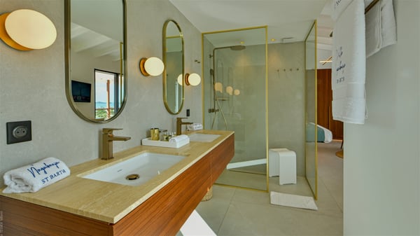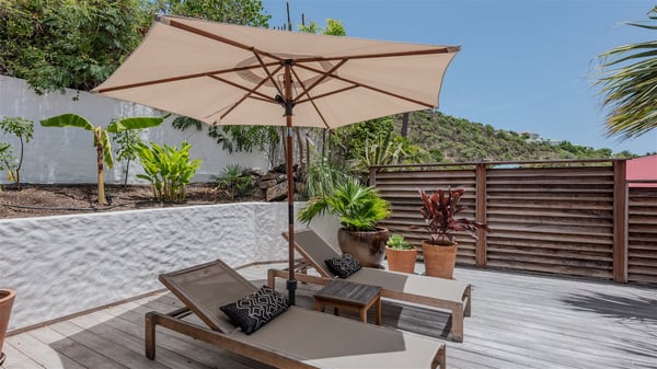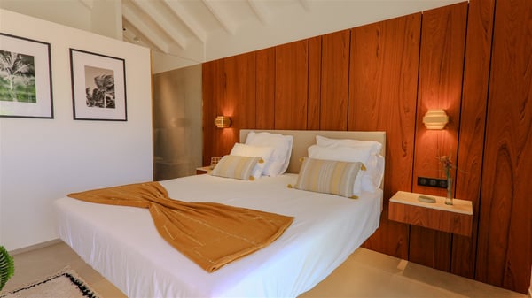 Located on a hillside in Anse des Cayes, the rental villa Nagabaaja is a charming four-bedroom property with a splendid view of the ocean and the hills. Close to Gustavia and St-Jean, this vacation home welcomes you for your next stay with family or friends in St-Barths. Built over two levels, the vacation villa Nagabaaja in St. Barths opens onto a breathtakingly beautiful panorama over the sparkling ocean. The air-conditioned living room is furnished with a sofa and armchairs in front of a flat-screen TV, close to the staircase which leads to the two bedrooms located upstairs. The charming, well-equipped kitchen made of wood combined with modern stainless steel is perfect to cook meals and prepare cocktails to be sipped in front of the view. In this very private setup, the atmosphere is peaceful, while the trade winds gently sweep the room, unless you prefer to air-condition this cozy indoor space and enjoy the quiet. The terrace located at the front of the villa faces the view over the deep blue ocean and the coastline through the wooded hills. Under the covered area, a large dining room that can accommodate up to twelve guests is furnished in a maritime style, the perfect place for delightful al fresco dinners under beautiful lights. You will also enjoy the swimming pool in front of a view, and will relax while sunbathing or reading on the deck chairs at your disposal. There is also a pleasant outdoor lounge in front of the panorama, for unique moments in the mild air of the island. The vacation rental villa Nagabaaja has four air-conditioned bedrooms with en-suite bathrooms. Spread over two levels, they are furnished with king-size beds and are spacious and well-equipped. Two of them offer a beautiful ocean view, while the other two open onto the tropical garden, which brings exoticism to your dream vacation. In a beautiful environment, Villa Nagabaaja is the perfect place for an unforgettable getaway in St Barths.