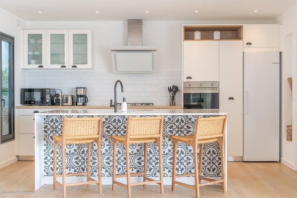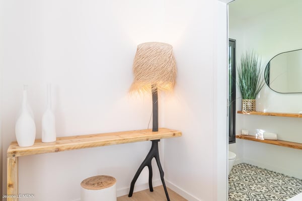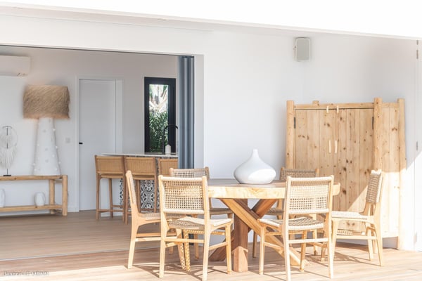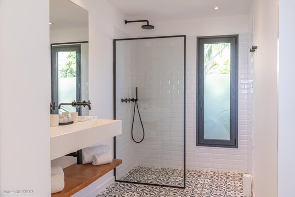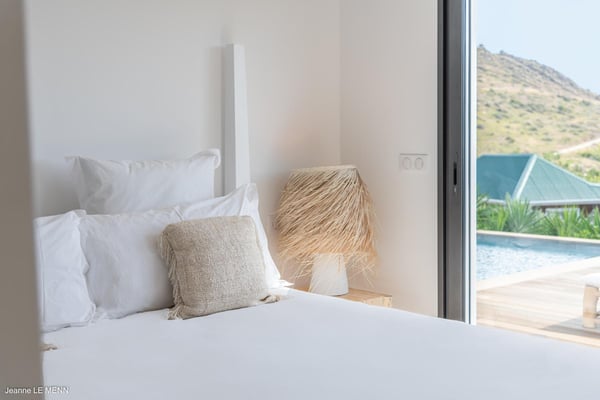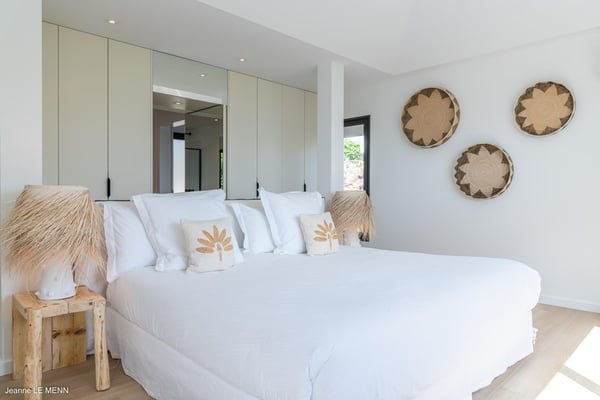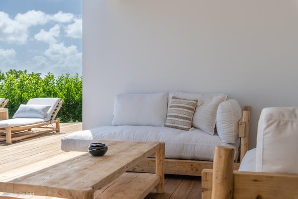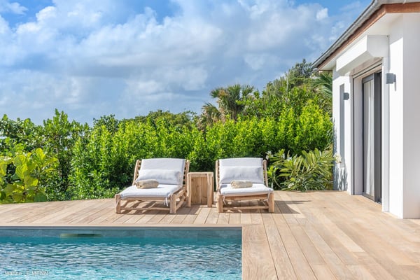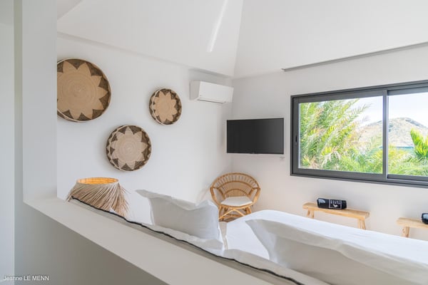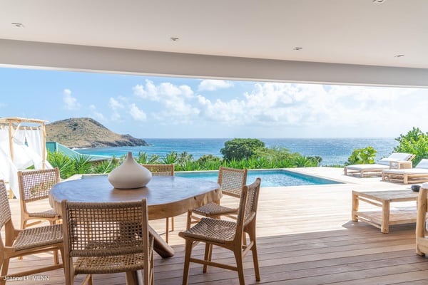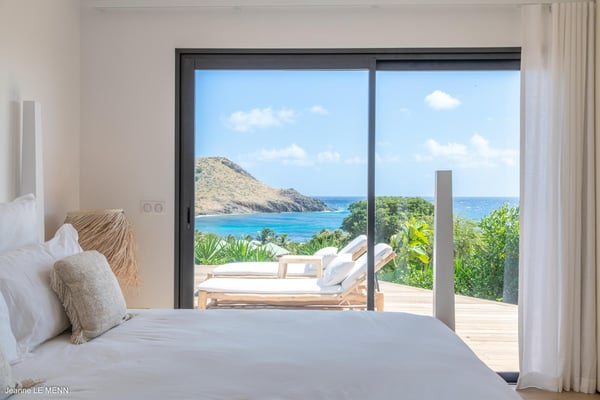 Located on the heights of Toiny, the charming vacation rental Cute is a true haven of peace in the heart of the tropical vegetation. Bright and well-equipped, it offers a splendid view over the ocean and the hills. With two bedrooms and a heated swimming pool, it is the perfect place for a getaway with family or friends in St. Barths. Villa Cute is a contemporary property with an airy and natural decor. The strikingly white walls and the soft light fixtures create a peaceful atmosphere in the evening. The living room widely opens both onto the front terrace with a magnificent ocean view, and onto the back of the house where the gray stone wall and palm trees create a fresh and heavenly ambience. Furnished with comfortable sofas and armchairs, the living room is close to the well-equipped kitchen with a breakfast bar and three high stools, decorated with romantic tiles. This cozy space opens onto the outside, unless you prefer to close off and air-condition it. At the front of villa Cute, you will discover a magnificent terrace with a heated swimming pool above the breathtaking ocean view. Lounge chairs with cushions are around the pool for pleasant sunbathing or reading in front of the panorama. Under the covered part of the terrace, there is a cozy living room with a soft sofa and an outdoor dining room for six guests for al fresco dinners. All around the villa, the lush vegetation creates an idyllic scenery in front of the ocean. Finally, on the side of the terrace, you will enjoy resting on the pleasant daybed protected by curtains in the mild ocean breeze. The vacation rental Cute has two air-conditioned bedrooms with en-suite bathrooms. Both offer beautiful ocean views and are furnished with king-size beds. They are decorated with wood and natural materials like in the living room. Bedrooms are comfortable and cozy, a best place to relax after days exploring the island or reading by the pool. Modern, well equipped and ideally located in Toiny, villa Cute is the right spot for an unforgettable stay in the Caribbean.