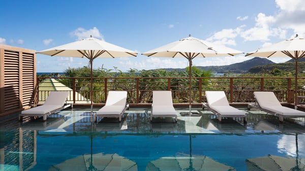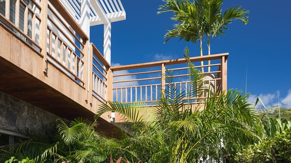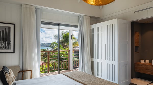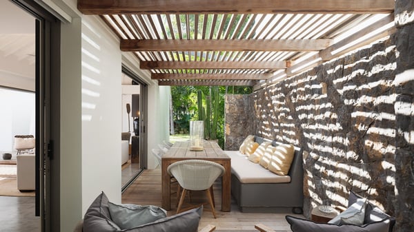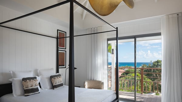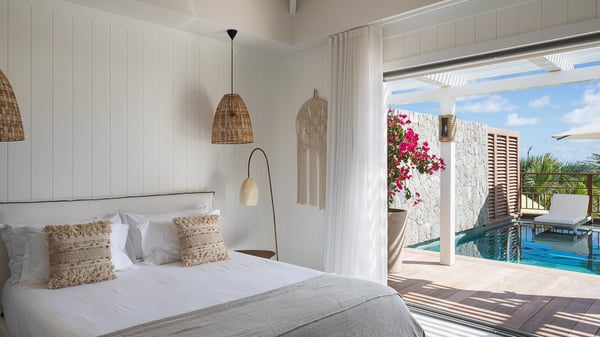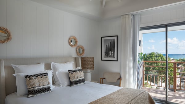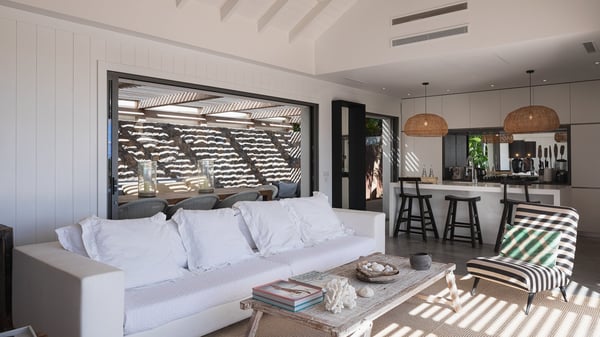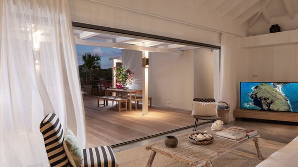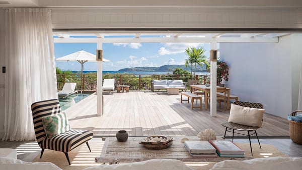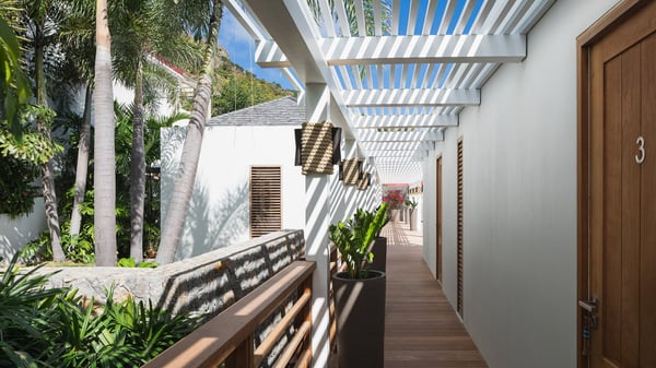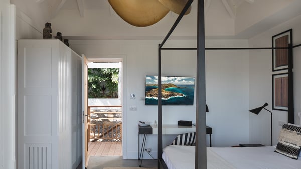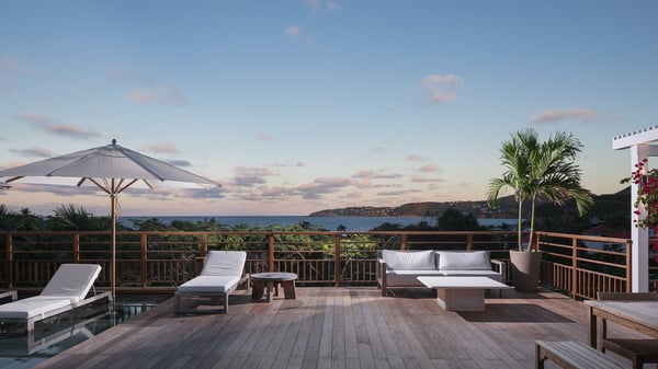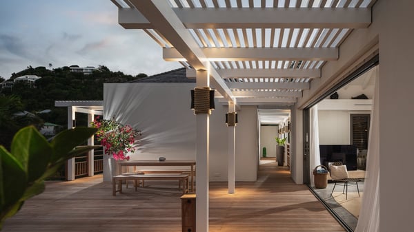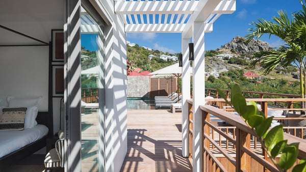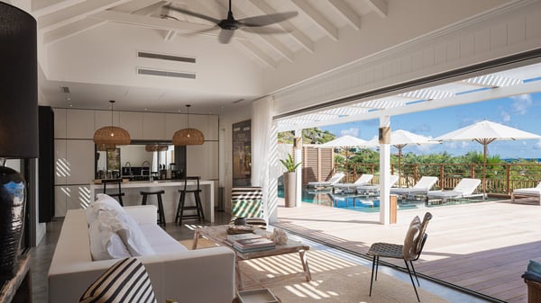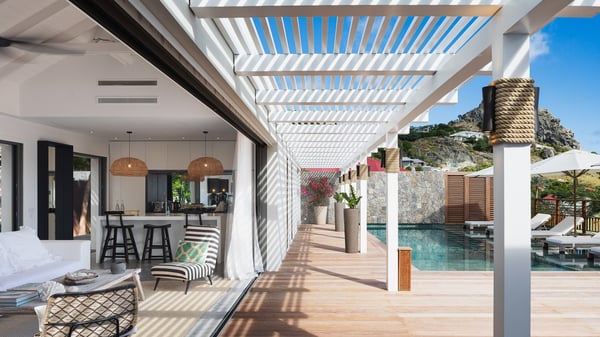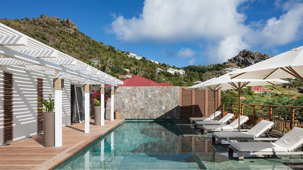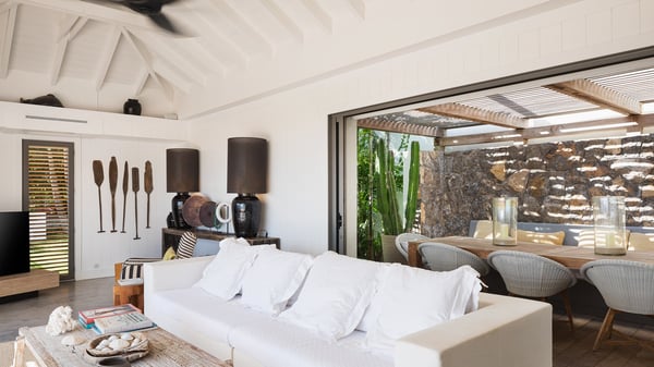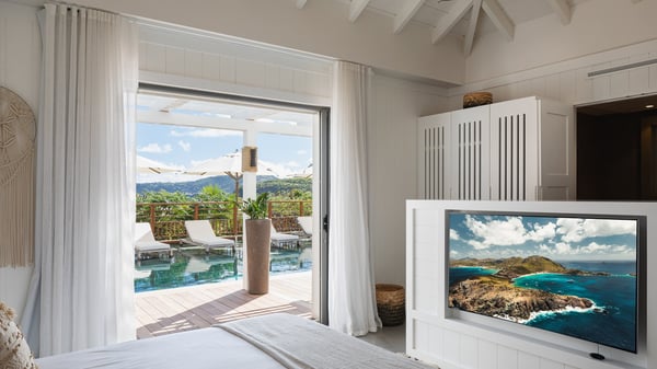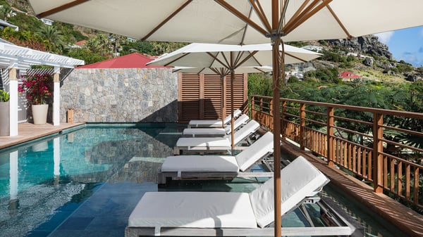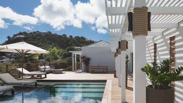 The luxurious Sam Lion is a magnificent three-bedroom property located on the hillside above Anse des Cayes. Fully air-conditioned and equipped with utmost comfort in a bright and lovely décor, this vacation home welcomes guests with family or friends for a fantastic stay in St Barths facing the ocean. Nestled in St Barths green hills, the sumptuous Sam Lion welcomes guests in front of the deep blue ocean. The living room widely opens onto the front and back terraces which are both sheltered by pergolas, making pleasant light and shade effects. The air-conditioned living room is furnished with a sofa, armchairs and a coffee table in a décor made of natural materials under the vaulted ceiling. The kitchen features a breakfast bar with stools and is located in the same bright open space, in front of the stunningly beautiful ocean view. On the back terrace near the natural stone wall, the dining room can accommodate eight guests around a lovely table, close to comfy armchairs that you will enjoy for private moments. At the front of Sam Lion, the terrace opens onto a beautiful panorama, facing the sparkling ocean and the wooded hills. A beautiful swimming pool welcomes you for delightful relaxing sessions under the island’s sun. At the edge of the pool, there are deckchairs under large umbrellas for sunbathing or reading, while the trade winds gently blow over the tropical environment. An outdoor lounge with a sofa and a coffee table is also at your disposal whenever you wish to have a rest or sip a cocktail admiring the beautiful ocean view. You can also enjoy your meals al fresco around the outdoor dining room, in front of the exceptional view over Anse des Cayes framed by the shimmering flowers on the terrace.