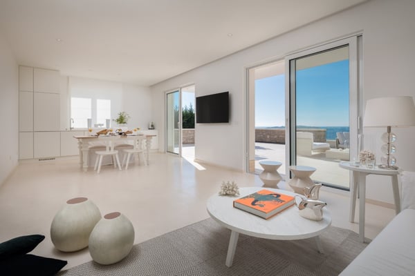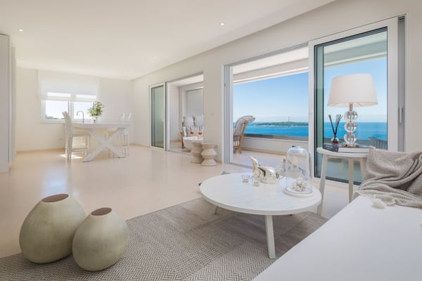 The spacious accommodation for 14 guests of this immaculate modern villa conveniently spreads over 3 floors and into 3 apartments, connected via an internal stair, allowing some privacy to larger parties travelling together. Each apartment enjoys fabulous views across the shimmering Adriatic Sea from long terraces, furnished for elegant outdoor living and dining. Terraced grounds surrounded by Mediterranean trees and shrubs. Private heatable, 25 m2 pool (Roman steps, views), sunbathing area furnished with sunbeds. Several furnished lounge areas. There is an al fresco dining area with a table for 12 people and a built-in barbecue. A separate annex is accessible from the outside, along with a gym and sauna. Laundry area. Parking on the drive. Steps down from the terrace to the rocky beach area and private mooring.