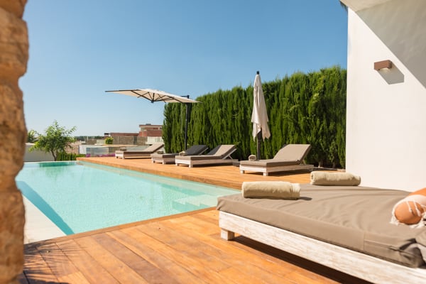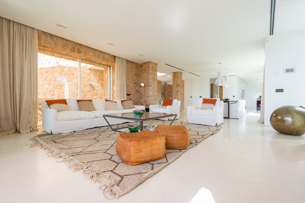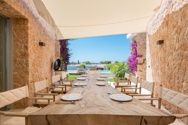 Located in the urbanization of Cala Conta 33. Situated on the seafront near one of the ten most spectacular bays of the Mediterranean Sea. Cala Conta 33 consists of 30 independent villas, each with their own land plot and a community Fitness & Spa center. This luxury villa has been designed in a minimalist style, with clear open spaces which blend stone, marble, wood and iron furnishings. The living areas have access to the beautiful terrace with a private pool from where you can see the most spectacular sunsets on the island. The house is fully air-conditioned and super bright, it has a large living room with an integrated dining area, a fully equipped modern kitchen with a central island, high-speed WiFi across the whole villa including the garden, media/playroom including satellite TV, Apple TV and Netflix, a powder room, outdoor garage and a fully equipped laundry. This property has a wonderful outdoor space, with sea views, beautifully maintained gardens, a terrace which surrounds the whole villa, a large comfortable chill-out area and an outdoor dining area with barbeque. There is a large infinity salt water swimming pool surrounded by wooden decking where you will find luxuriously comfortable sun loungers with parasols. The development is south-west facing, looking out over the most famous sunset views of the Balearic Islands and is less than 500 meters from the beautiful beach of Cala Conta, arguably the most beautiful beach on the island with its crystalline blue waters and its own adjacent bay with boat access. License Number: ETV-1856-E / ESFCTU000007010001092648000000000000000000ETV/1856EA4