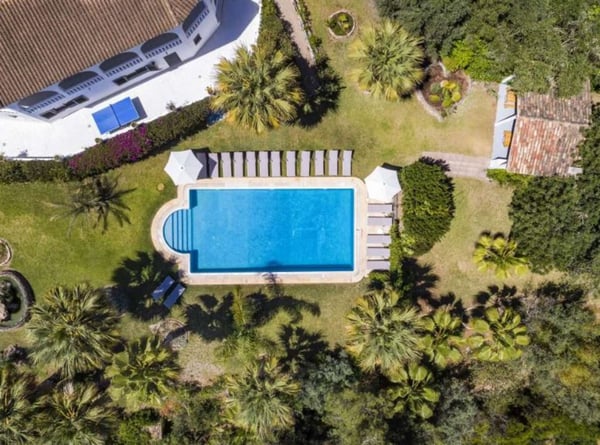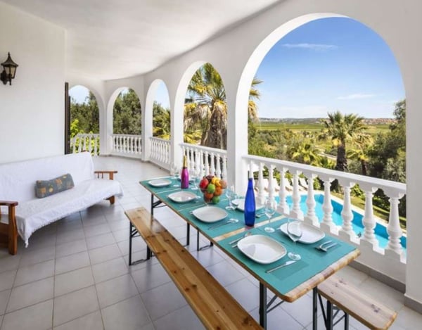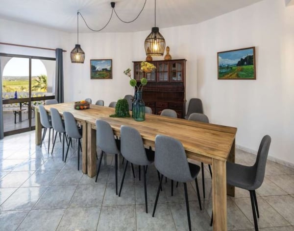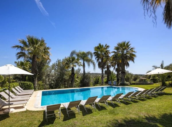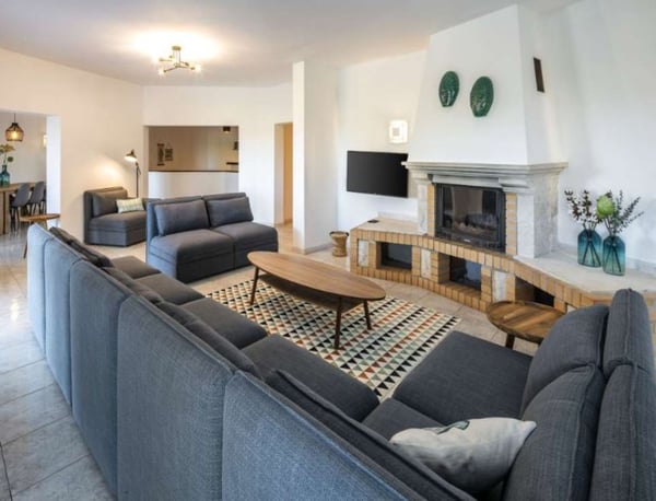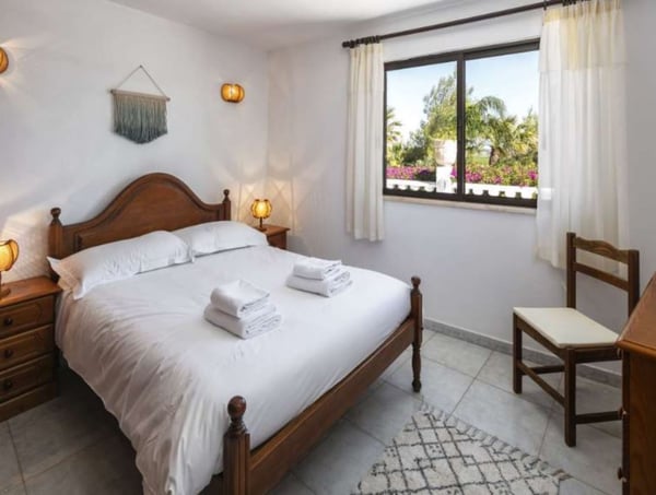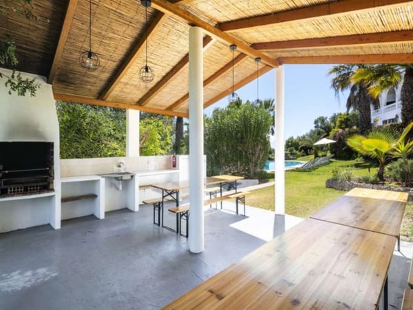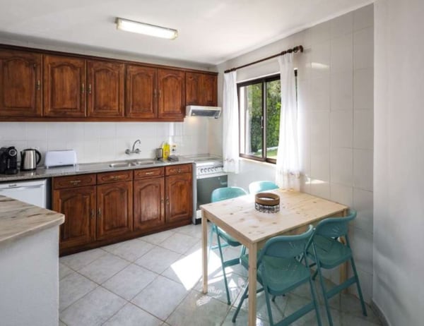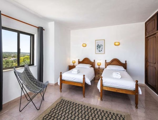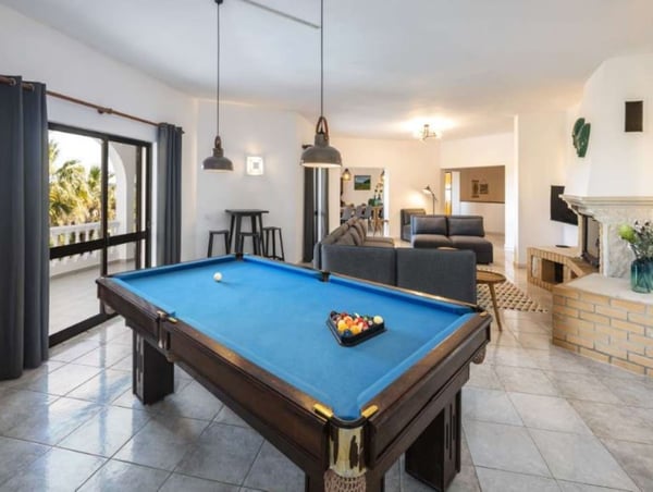 The property is located in Poço Barreto, between Silves and Carvoeiro, near the Amendoeira Golf Course. It's an ideal place for a few families or groups of friends to spend a wonderful time together under the Portuguese sun. The ground floor is divided into two apartments with two bedrooms each, one with a double bed and another with two single beds - note this is an interior bedroom. Each apartment has a kitchen open to living room with sofa bed and TV (four national channels) and a bathroom. The first floor features a bar counter with seats, a large living room with a snooker table, satellite TV, fireplace, stereo system and a dining area. There is a fully equipped kitchen with a dishwasher, microwave, refrigerator, gas stove, electric oven, juicer, blender, toaster and coffee machine. The laundry room is equipped with a washing machine, dryer, iron and ironing board. You will find one bedroom with a double bed, and two bathrooms, one with a shower and a guest powder room. You will also find here a balcony with a table and chairs and access stairs to the pool area and garden. The second floor has four bedrooms, a living room, three bathrooms and a large balcony with panoramic views. You can relax outdoors in the large garden area, which features a covered barbecue area with a table and chairs. Large garden area with palm trees and tropical plants, covered barbecue area with table and chairs, private pool and private parking.
