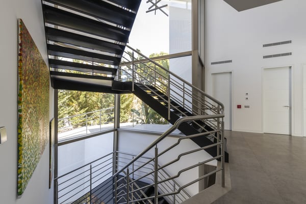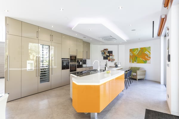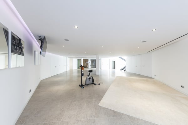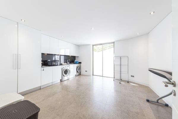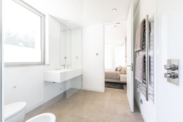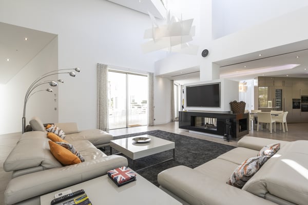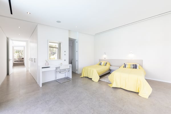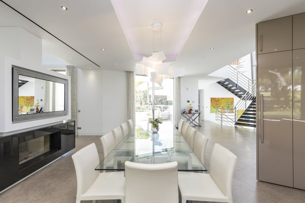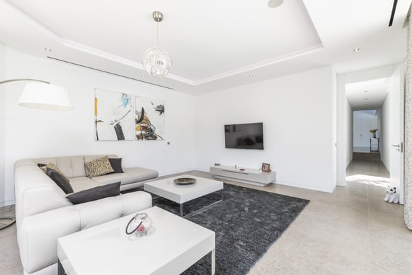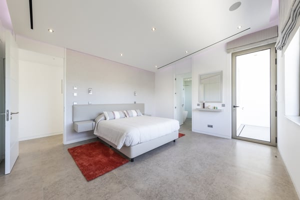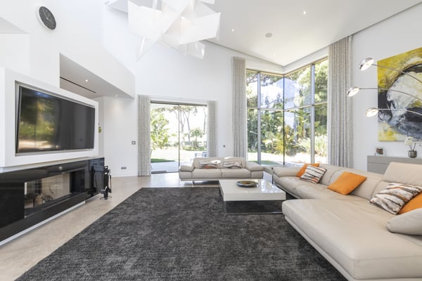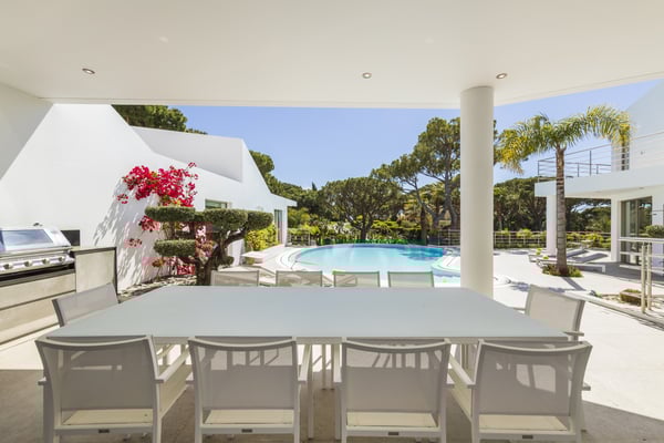 A perfectly positioned villa in Quinta do Lago. Designed in a fresh, modern contemporary style, set on manicured gardens. This is a stunning villa located in a quiet location, overlooking the sixth fairway of the Quinta do Lago golf course and set on manicured lush gardens. The villa has a state-of-the-art cinema room, a sauna and a steam bath. The villa is located at walking distanceto The Campus – the new state-of-the-art multi-sports complex. The gates open to a large driveway area on the left and a large garden on the right. The large front door opens to a hallway with a cloakroom, leading to a large open space with a dining area in front and the living room slightly to the right. There is a wall mounted flat screen TV with Lazer services and a music system in the entire house. The kitchen, located on the left is fully equipped with appliances including a large fridge, a freezer with an ice maker, an induction plate with ceiling smoke extractor, wine cooler, microwave, coffee maker, kettle, two electric ovens, toaster, dishwasher, blender and juicer. The door from the kitchen and living room open to an outside living area overlooking the golf course. On the right hand side of the living room there is a double bedroom with en-suite bathroom with walk-in shower and bathtub and a terrace. Next to it there is a TV room with access to the swimming pool. On the right of the hallway there are two bedrooms: one double with an en-suite walk-in shower and terrace and a twin bedroom with an en-suite walk-in shower and a bathtub. View and access to the swimming pool. The stairs leading the first floor where there are two further bedrooms: A double bedroom with en-suite walk-in shower and bathtub as well as a double bedroom with walk-in shower and a terrace overlooking the pool and garden The lower level with natural light has a sauna, a steam bath and a large bathroom with two shower areas; a wine cellar and an open plan area. There is also a laundry room with washing machine dryer, cloths hanger, sink, iron and iron board, etc. There is also a garage with parking spaces for two cars. There is a further self-contained apartment with one bedroom that can be accessed through the lower level or through an independent entrance. It has an equipped kitchen, a living room, a bedroom and an en-suite walk-in shower.