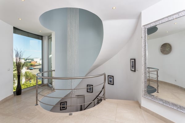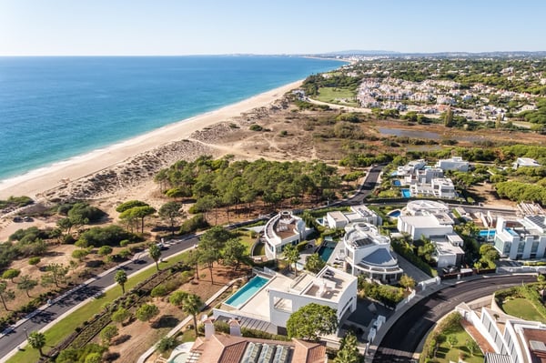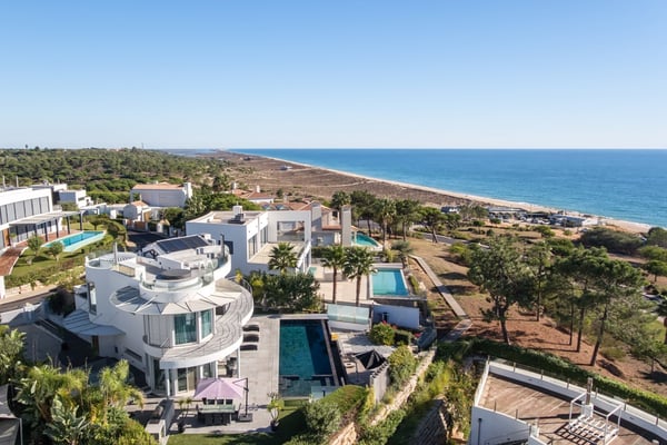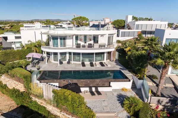 This is a unique contemporary beachfront villa in Vale do Lobo, boasting an infinity heated pool, a rooftop terrace with Jacuzzi, home cinema and games room all of this just steps away from a sandy beach. Villa Rotunda is situated in the newest residential area within the acclaimed golf resort of Vale do Lobo and affords spectacular views over the Ocean, with a sandy beach just a few steps away. Large windows and floor-to-ceiling glass doors enhance the impact of the sea view and the light streaming into the property, giving it an airy feeling throughout. Additional benefits are a private garage, a lovely garden and heated pool. Each room is decorated to a very high and modern standard. From the garden, you find steps leading to a path to Garrão beach which is just a few steps away. Outside you can also find a barbecue and sun loungers, along with external seats for perfect days and nights, and the rooftop terrace offers more outdoor seating and a jacuzzi. On the lower level there is a games room, television room, a bar and wine cellar.​ Mature manicured gardens comprising palm trees, shrubs and lawn areas. Shaded outdoor dining terrace and barbecue. Private infinity heated pool with Roman-style steps, sea views, and sunbathing area with sun loungers. Terraces on 3 levels with sea views and furnished for outdoor living, bar area. Rooftop terrace with Jacuzzi. Private mini golf green. Footpath from the bottom of the garden to the beach.