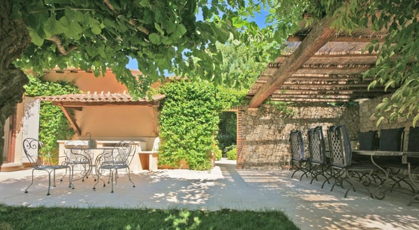 This elegant villa in Ramatuelle enjoys a prime situation within a lush Mediterranean garden with a private pool, just three minutes' walk from Pampelonne's beaches and clubs. Large private grounds are planted with lush Mediterranean gardens, mature trees and shrubs, lawn areas, and fountain features. Walled garden. pergolas. Private pool with Roman-style steps and massage jets, sunbathing area. Covered pool terrace with outdoor lounging furniture. Several shaded spots for relaxation and outdoor dining and barbecues.