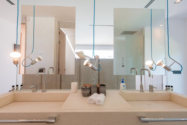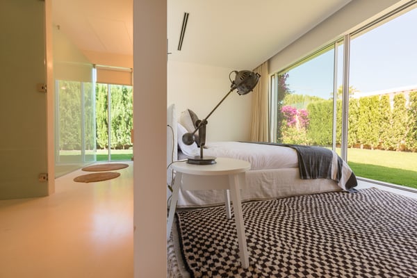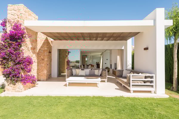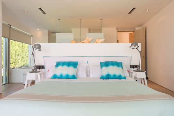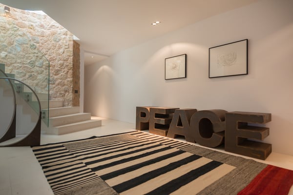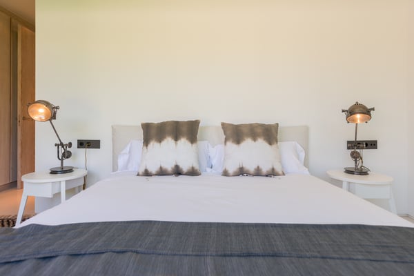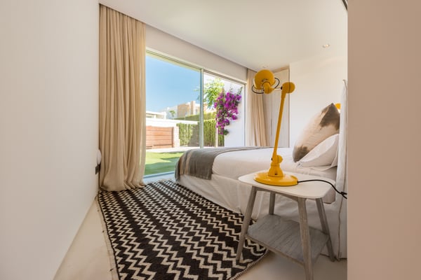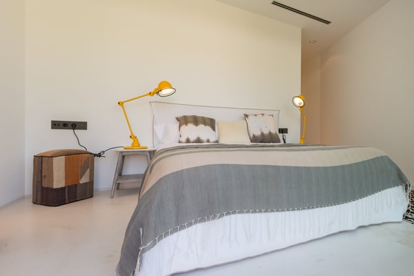 Cala Conta is one of Ibiza‘s most renowned sunset spots, a beautiful beach of soft, golden sand and gentle crystalline waters where you can enjoy long, sunny days and spectacular evenings. Casa Matias is located on the seafront urbanization of Cala Conta. Just 500m from the beach and looking out over the most famous sunset view in the Balearic Islands, the development has its own adjacent bay with boat access, 24-hour security and a community fitness centre and spa. Sensitively oriented in carefully landscaped gardens, this Ibizan holiday home enjoys a wealth of relaxing outside space and beautiful interiors. Take a dip in the large saltwater swimming pool, or pull up a lounger on the poolside wooden deck and bask in the warm Ibizan sunshine. On the terrace that wraps around the property, two distinct al-fresco living spaces are to be found: a shaded dining area, seating ten, and a larger lounge space with comfortable sofa seating. The minimalist design of Casa Matias’s exterior hides a comfortable and well-appointed holiday home. High-tech amenities mix with natural stone, smooth marble, leather and wood for a cool, relaxing interior vibe. The outside terrace space opens onto the large living space inside, where lounge seating leads onto an interior dining space, seating eight, and a sleek, bright kitchen area with a breakfast bar. A curving, feature staircase leads down to a second cozy living area with sofa seating. The bedrooms are as spacious as the main living areas, the minimalist styling softened with colourful soft furnishings. All enjoy peaceful garden views and en-suite bathrooms with showers. The master suite also has a bathtub. Fantastic family home in a beautiful part of the island. License Number: 2016018872