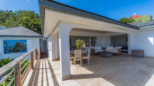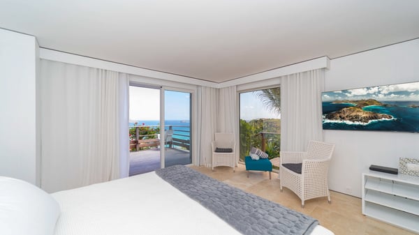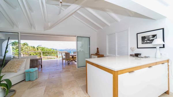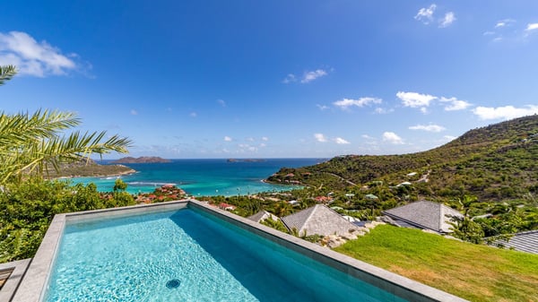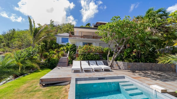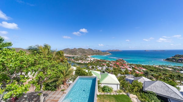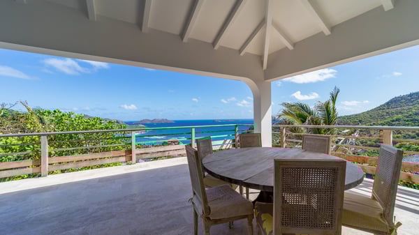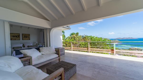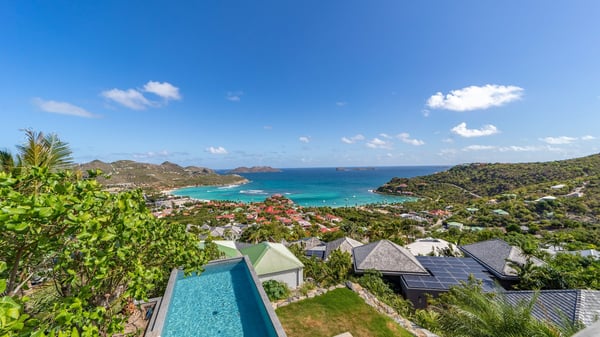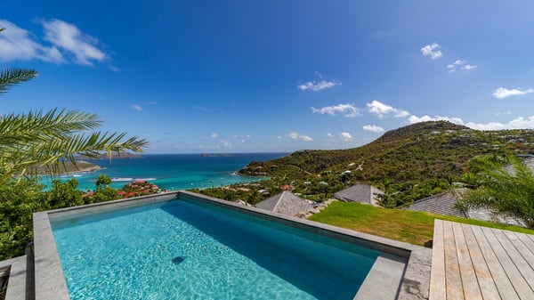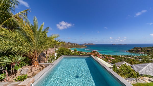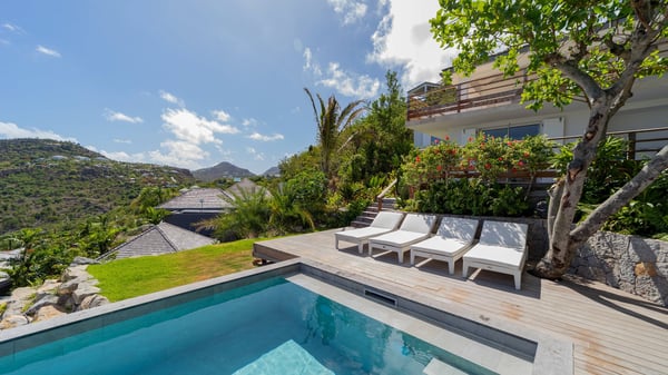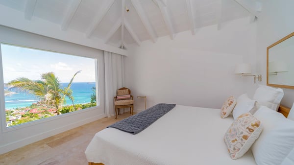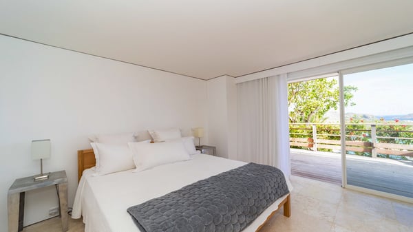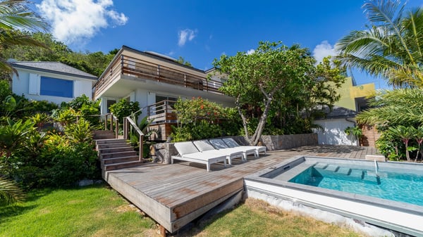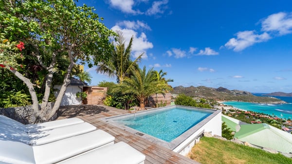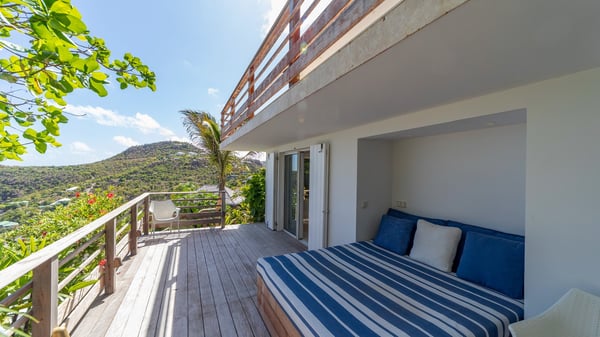Villa Hill is a charming three-bedroom property located in St-Jean in front of a fantastic view over the bay and the ocean. Nestled in the heart of the green rolling hills, Villa Hill is a true haven of peace, a most relaxing place for an unforgettable vacation with family or friends in St Barths. Built over two levels, the vacation rental Villa Hill welcomes guests in a spacious and bright living room, well furnished with comfortable sofas and soft armchairs. Under the high, whitewashed ceiling, the atmosphere is truly soothing, as the wide windows let show the terrace and the bay. The well-equipped kitchen opens onto the lounge through a breakfast bar with fine stools. What’s more the pop-inspired decoration shows hints of colour on the strikingly white walls. Between the windows, the trade winds gently blow through the living room, providing a pleasant feeling of quiet and serenity. At the front of Villa Hill, the terrace is designed around a lovely swimming pool located a few steps below the lower level. Deck chairs, green lawns and local shrubs create an idyllic scenery, a perfect place to swim, lounge or sip a cocktail in the evening. Under the covered part of the terrace located above, the outdoor dining area can accommodate six guests for alfresco dinners close to the second lounge, in front of the amazing view over the island's crystal-clear waters. There is also a comfy terrace at the back of the villa, shaded by banana trees on the hillside, a private place for unique moments out of time. Villa Hill consists of three air-conditioned bedrooms with en-suite bathrooms. Two of them are on the upper level while the third one is on the lower level accessible via a staircase. All three have king-size beds and large windows opening onto the outside with stunning ocean views. A daybed is also available on the lower terrace, in a very private and cozy atmosphere, whenever you wish to rest. In a beautiful natural setting, the holiday rental Villa Hill welcomes families and groups of friends up to six people for a fantastic Caribbean vacation.