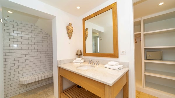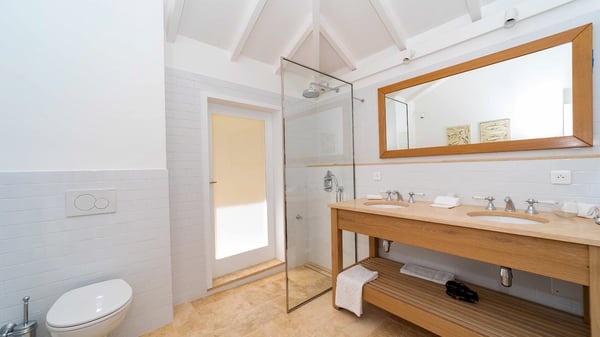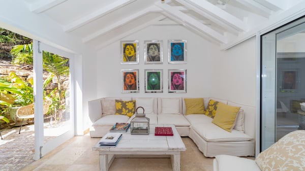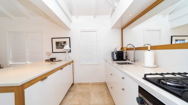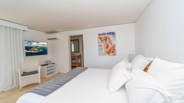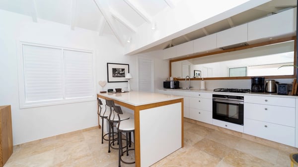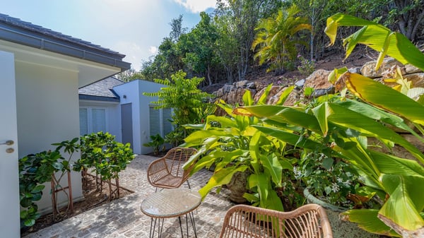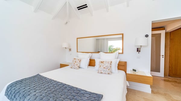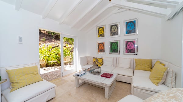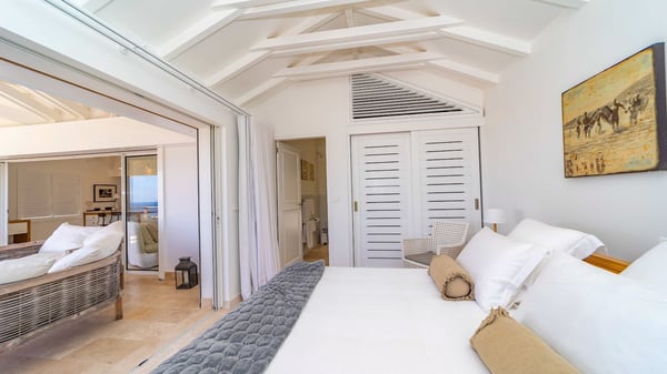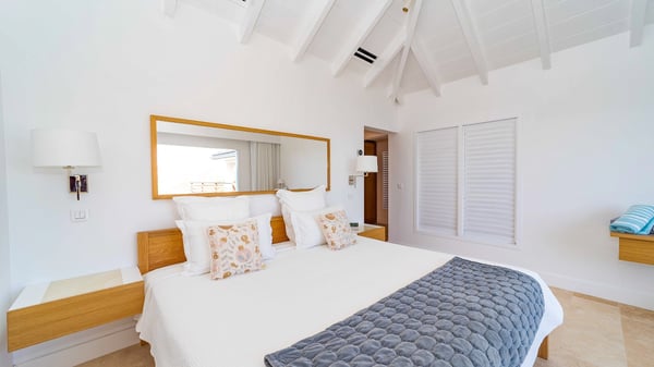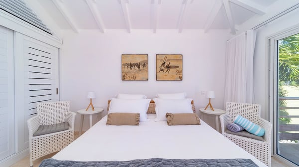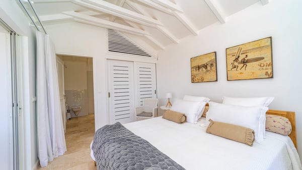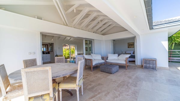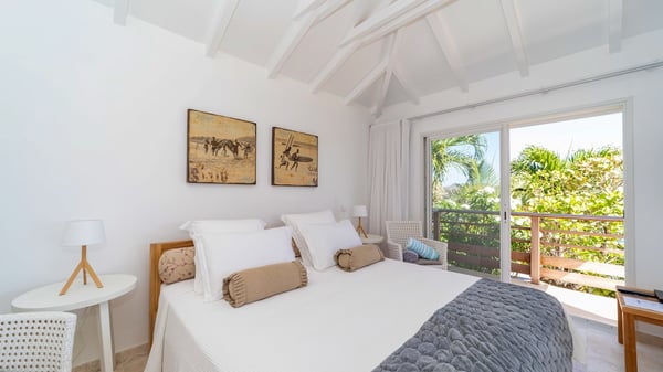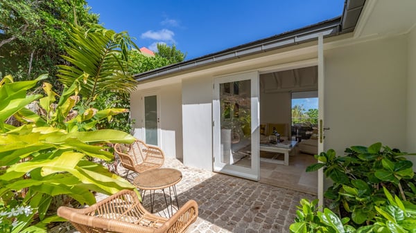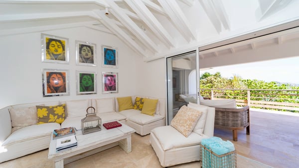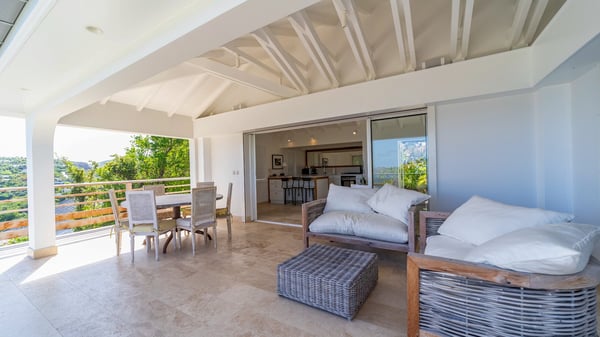 Villa Hill is a charming three-bedroom property located in St-Jean in front of a fantastic view over the bay and the ocean. Nestled in the heart of the green rolling hills, Villa Hill is a true haven of peace, a most relaxing place for an unforgettable vacation with family or friends in St Barths. Built over two levels, the vacation rental Villa Hill welcomes guests in a spacious and bright living room, well furnished with comfortable sofas and soft armchairs. Under the high, whitewashed ceiling, the atmosphere is truly soothing, as the wide windows let show the terrace and the bay. The well-equipped kitchen opens onto the lounge through a breakfast bar with fine stools. What’s more the pop-inspired decoration shows hints of colour on the strikingly white walls. Between the windows, the trade winds gently blow through the living room, providing a pleasant feeling of quiet and serenity. At the front of Villa Hill, the terrace is designed around a lovely swimming pool located a few steps below the lower level. Deck chairs, green lawns and local shrubs create an idyllic scenery, a perfect place to swim, lounge or sip a cocktail in the evening. Under the covered part of the terrace located above, the outdoor dining area can accommodate six guests for alfresco dinners close to the second lounge, in front of the amazing view over the island's crystal-clear waters. There is also a comfy terrace at the back of the villa, shaded by banana trees on the hillside, a private place for unique moments out of time. Villa Hill consists of three air-conditioned bedrooms with en-suite bathrooms. Two of them are on the upper level while the third one is on the lower level accessible via a staircase. All three have king-size beds and large windows opening onto the outside with stunning ocean views. A daybed is also available on the lower terrace, in a very private and cozy atmosphere, whenever you wish to rest. In a beautiful natural setting, the holiday rental Villa Hill welcomes families and groups of friends up to six people for a fantastic Caribbean vacation.