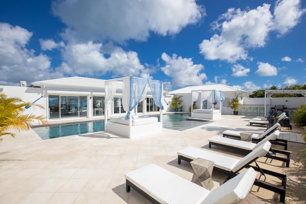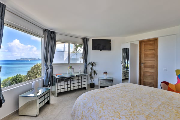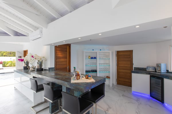 Villa Infinity Blue, in Saint Martin, has a breathtaking view of shades of blue of the ocean and the neighboring islands. Also, enjoy its unique and direct private access to the beach of Baie Rouge. This six-bedroom property features two pools, a Jacuzzi, and plenty of space to relax and eat. During your stay, take advantage of the many facilities of the villa: a pool table, a beach volleyball court, a gym, a petanque court and much more. Renovated in 2022, this property has been redecorated with refinement and state-of-the-art equipment. This villa has six large bedrooms with six en-suite bathrooms. On the main level, three bedrooms have access to the main pool and the main terrace. The main swimming pool is located at the entrance leading to the reception living area. It is heated from October 15th to April 15th, outside this period the heating of the pool is optional, for an additional fee. It is fully enclosed for complete privacy and wind-free living. Furthermore, it has large sunbeds, eight poster daybeds, lounging areas, and a large fully fitted outdoor kitchen and bar with covered dining area seating for 12. On the lower level, accessible by outside stairs, there are three more rooms, two of which have direct access to the second pool and the gym. Ideally located in the private and exclusive residential community of Terres Basses, you will benefit from a prime location, a 10-minute drive from shops, restaurants, and bars on the Dutch and French sides. Villa Infinity Blue can be rented in three, four, five, or six bedrooms.
