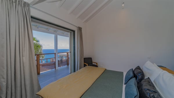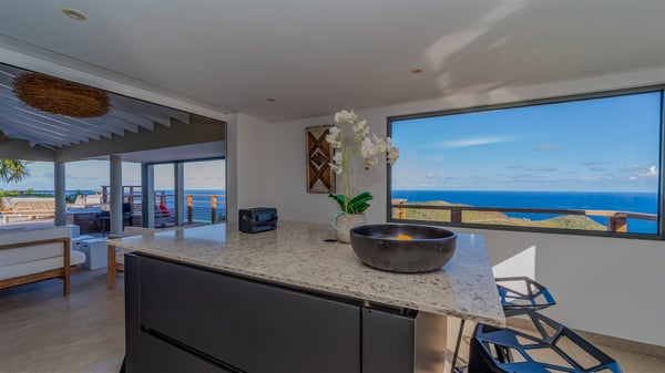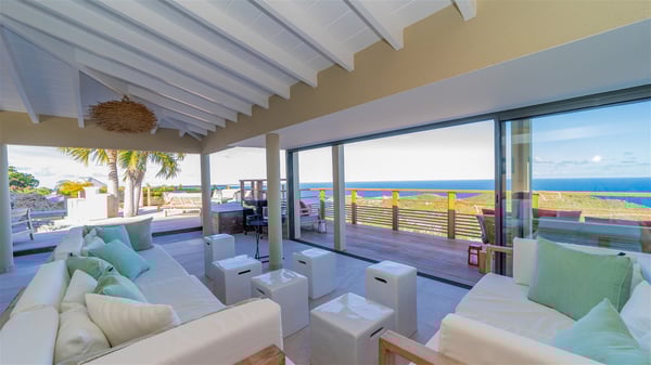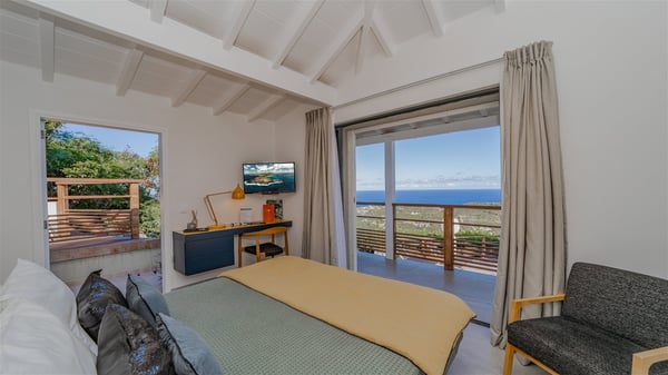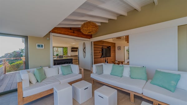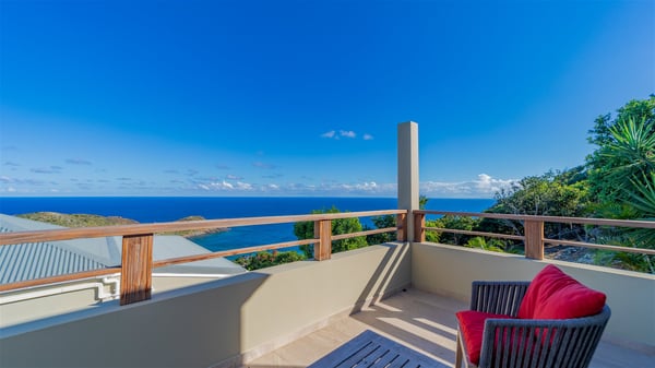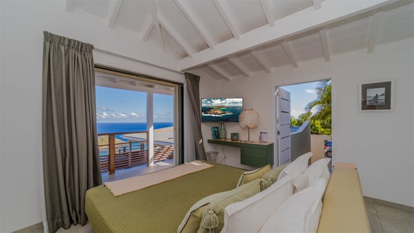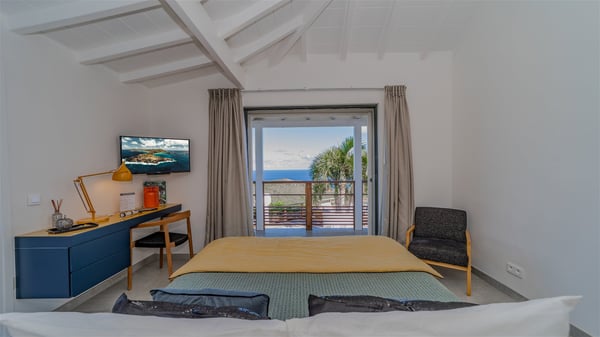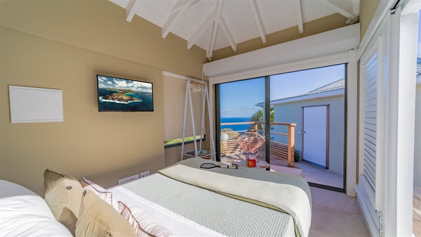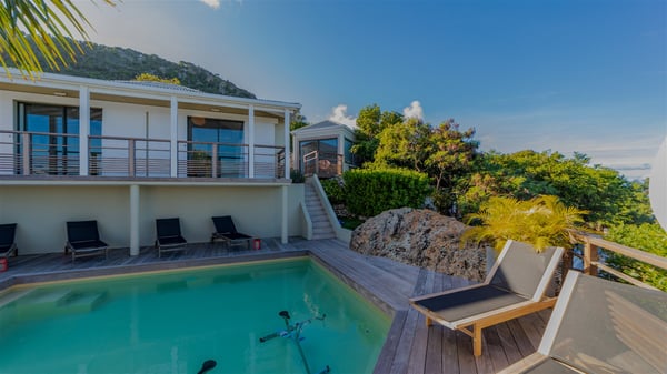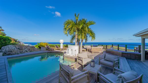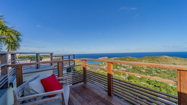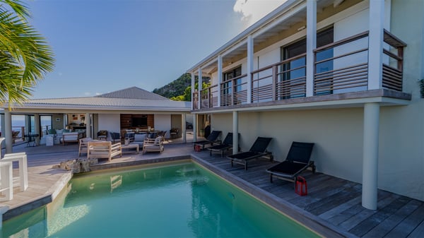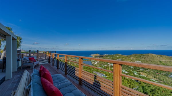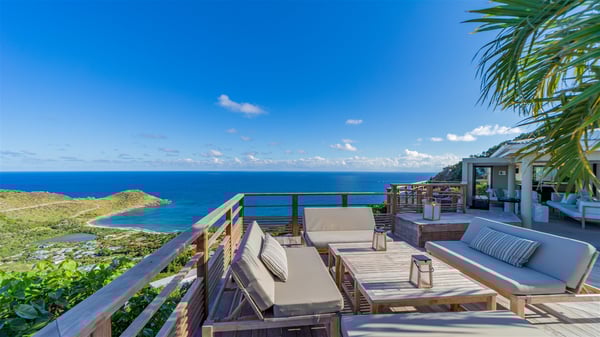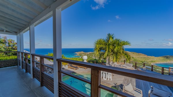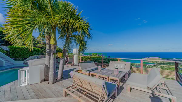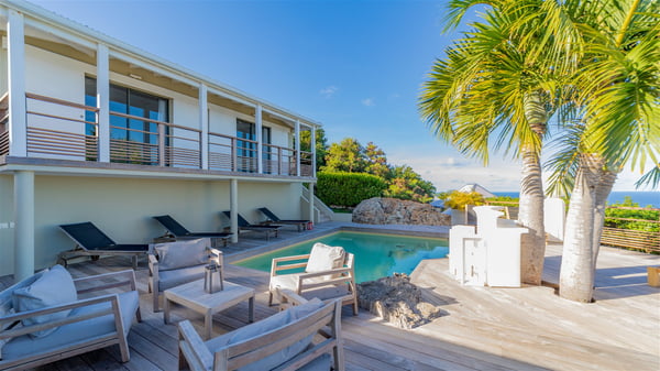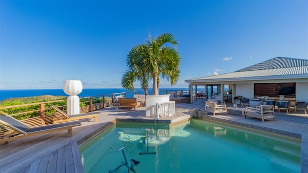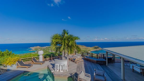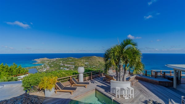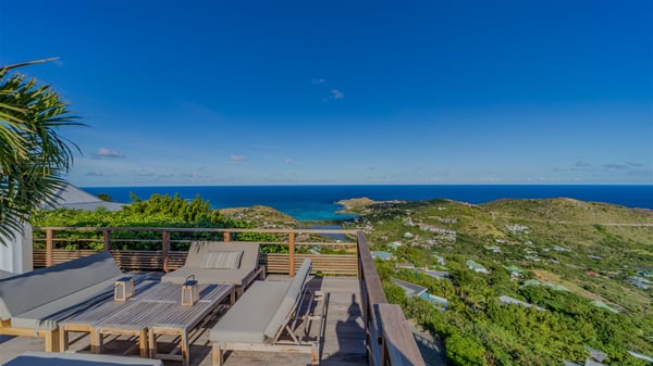 The vacation rental villa Sea Star is a magnificent five-bedroom property located on the heights of Devet. The outstanding view over Petit-Cul-de-Sac Bay creates a heavenly atmosphere in front of the sparkling waters of St-Barths. Luxurious and well-equipped with upscale amenities, Villa Sea Star welcomes up to eight guests in the heart of the Caribbean beauty. Built over several bungalows and levels, Villa Sea Star offers panoramic views from its large terraces and indoor spaces. The living room is comfortably furnished with a fine sofa, armchairs and a HDTV. It opens onto a covered terrace with white armchairs and a bar, with large windows that overlook the view. The indoor dining room accommodates guests around a table in front of the ocean. In the same room, the fully-equipped kitchen is spacious and perfect to cook and chat around the central island. In front of the view over Toiny beach, the atmosphere is soothing, while the trade winds blow through the wide openings. Villa Sea Star consists of two comfy and luxury outdoor spaces. On the main level, the terrace features a lovely swimming pool with two aqua bikes, surrounded by loungers covered with soft cushions and contemporary white armchairs. Shaded by palm trees with chiselled leaves, a bar with white stools creates a delightful tropical atmosphere close to the exotic-wood outdoor lounge. Finally, at the end of the terrace, you’ll find the perfect place to sip a cocktail and marvel at the stunning view over the deep-blue ocean. A second terrace is located near the bedrooms upstairs, and features a kitchenette to cook outdoors. The vacation rental Sea Star consists of five air-conditioned bedrooms with adjoining bathrooms. They are in a separate bungalow and open onto a balcony with a lovely sea view. All are furnished with double beds and decorated with warm tones in a modern and refined style, under vaulted ceilings. In utmost luxury and calm, the fourth room opens onto a private terrace with an outdoor bathtub for pleasant moments of relaxation under the Caribbean sky. In front of an amazing panoramic view, villa Sea Star welcomes groups of up to eight people in an enchanting environment.