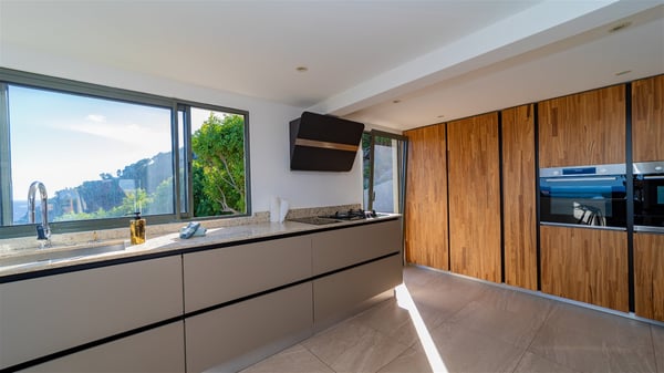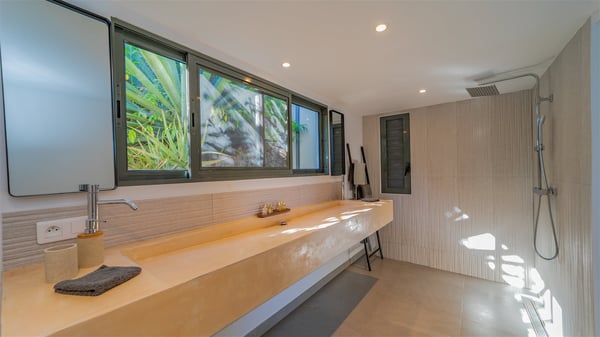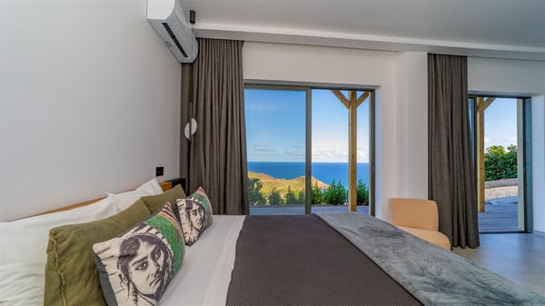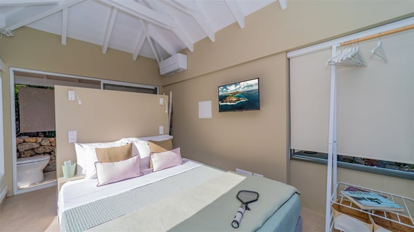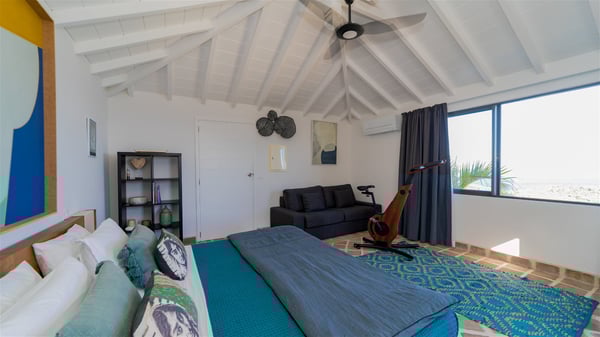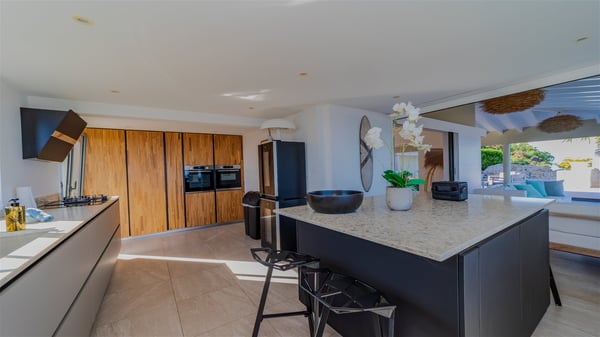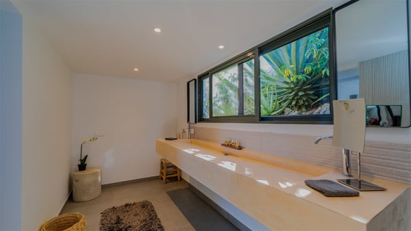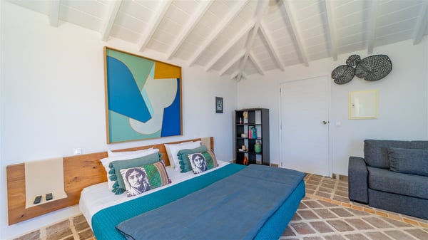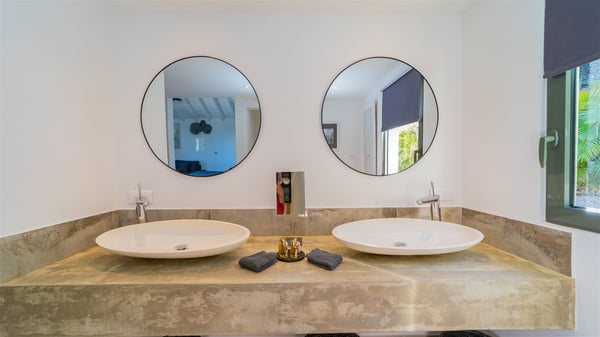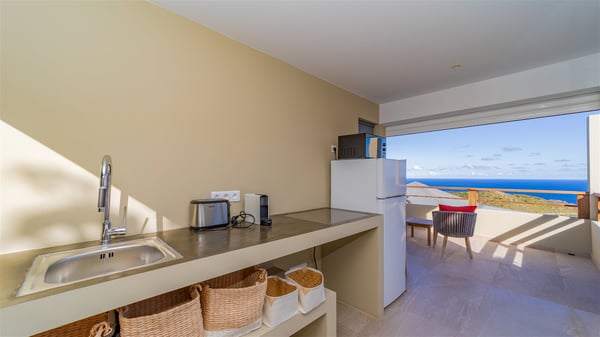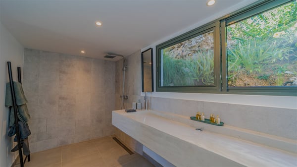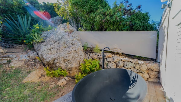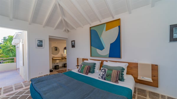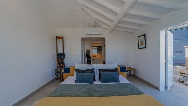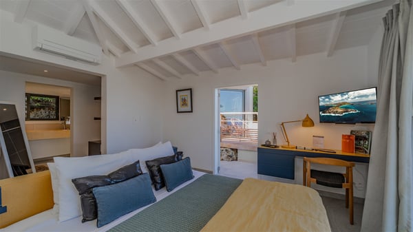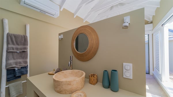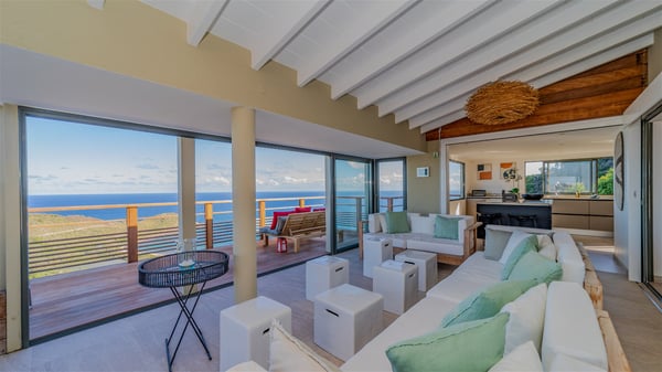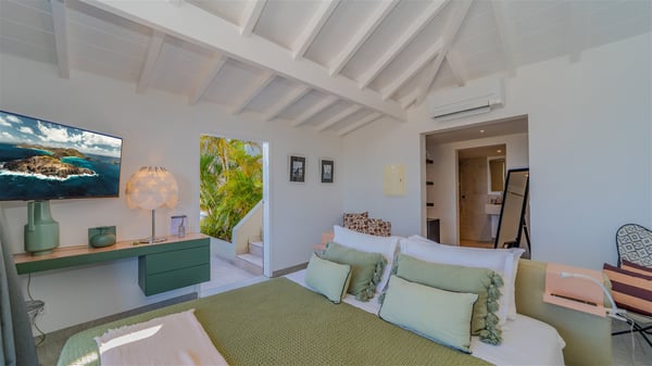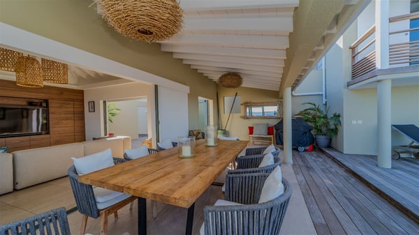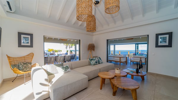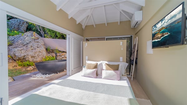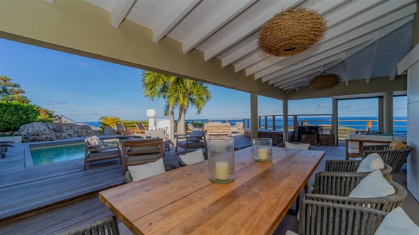 The vacation rental villa Sea Star is a magnificent five-bedroom property located on the heights of Devet. The outstanding view over Petit-Cul-de-Sac Bay creates a heavenly atmosphere in front of the sparkling waters of St-Barths. Luxurious and well-equipped with upscale amenities, Villa Sea Star welcomes up to eight guests in the heart of the Caribbean beauty. Built over several bungalows and levels, Villa Sea Star offers panoramic views from its large terraces and indoor spaces. The living room is comfortably furnished with a fine sofa, armchairs and a HDTV. It opens onto a covered terrace with white armchairs and a bar, with large windows that overlook the view. The indoor dining room accommodates guests around a table in front of the ocean. In the same room, the fully-equipped kitchen is spacious and perfect to cook and chat around the central island. In front of the view over Toiny beach, the atmosphere is soothing, while the trade winds blow through the wide openings. Villa Sea Star consists of two comfy and luxury outdoor spaces. On the main level, the terrace features a lovely swimming pool with two aqua bikes, surrounded by loungers covered with soft cushions and contemporary white armchairs. Shaded by palm trees with chiselled leaves, a bar with white stools creates a delightful tropical atmosphere close to the exotic-wood outdoor lounge. Finally, at the end of the terrace, you’ll find the perfect place to sip a cocktail and marvel at the stunning view over the deep-blue ocean. A second terrace is located near the bedrooms upstairs, and features a kitchenette to cook outdoors. The vacation rental Sea Star consists of five air-conditioned bedrooms with adjoining bathrooms. They are in a separate bungalow and open onto a balcony with a lovely sea view. All are furnished with double beds and decorated with warm tones in a modern and refined style, under vaulted ceilings. In utmost luxury and calm, the fourth room opens onto a private terrace with an outdoor bathtub for pleasant moments of relaxation under the Caribbean sky. In front of an amazing panoramic view, villa Sea Star welcomes groups of up to eight people in an enchanting environment.