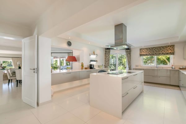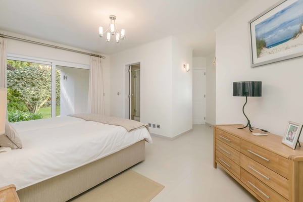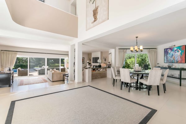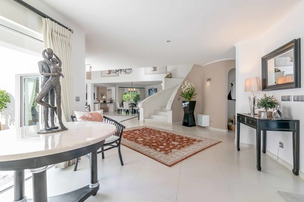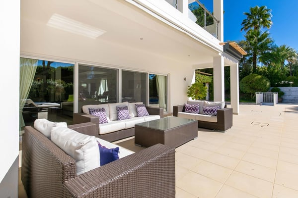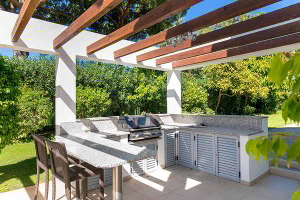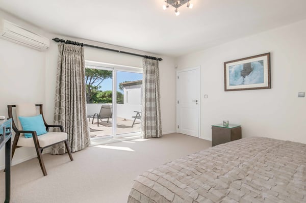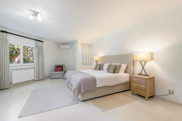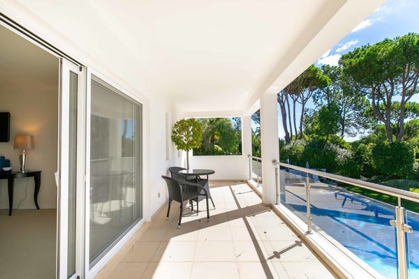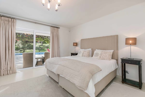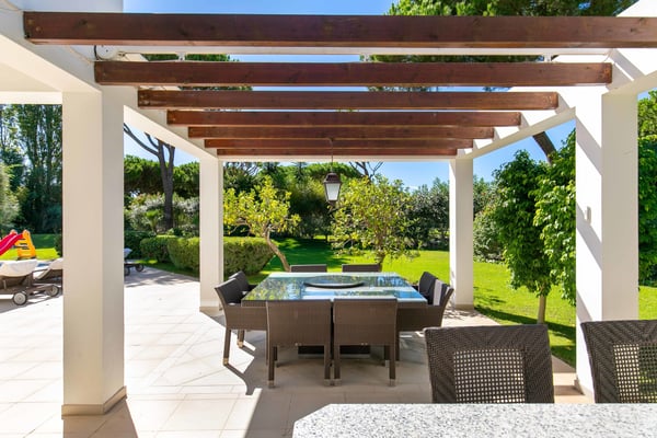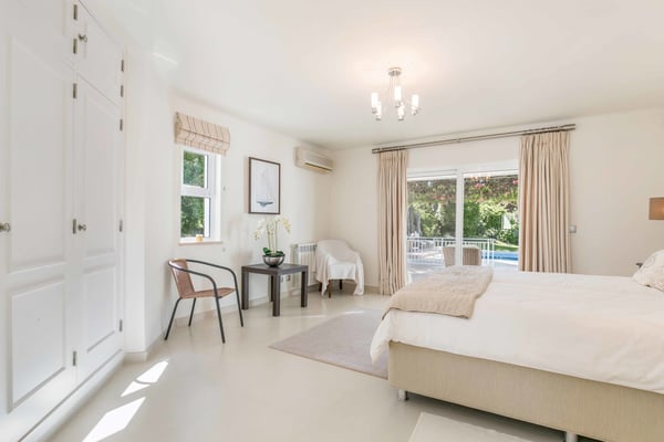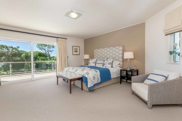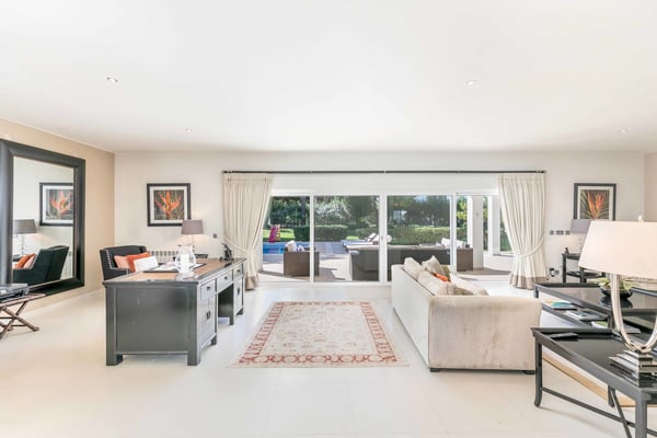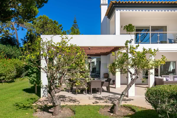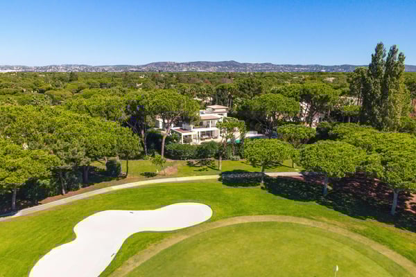 At the heart of the renowned golf resort of Quinta do Lago, surrounded by splendid woodland, this impressive five-bedroom villa with a private heatable pool provides luxurious holiday living in the Algarve. This stylish modern property boasts elegant interiors with a classic taste and can accommodate up to 10 guests over two floors. With spacious indoor communal areas and ample outdoor space with both shaded and open terraces protected by mature trees ensuring guests' privacy at all times, this property lends itself to easy living under the Algarvean sunshine and is perfect for family beach and golfing holidays. Magnificent private gardens planted with mature trees and ample lawn areas. Large, private, heatable swimming pool overlooking Quinta do Lago South Golf Course (between the sixth and seventh tee-off). The outdoor area features a gas BBQ, and a shaded terrace with al fresco dining area.