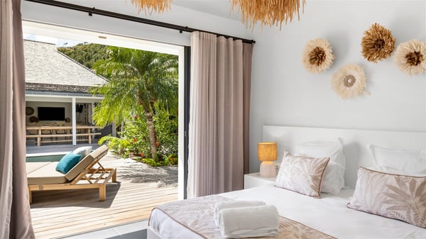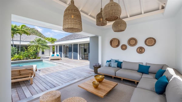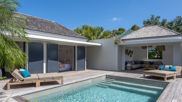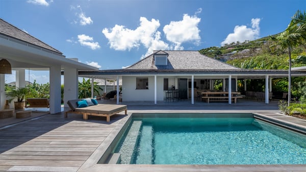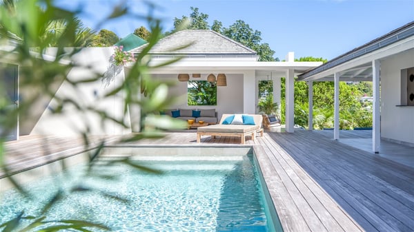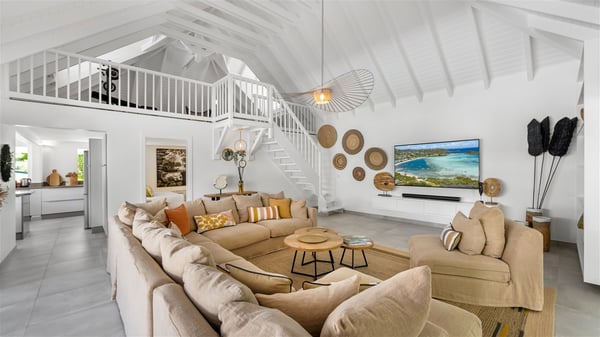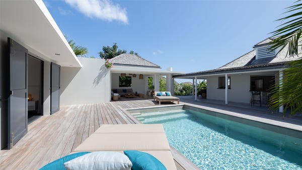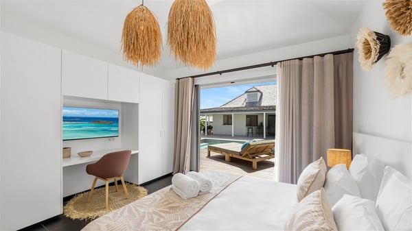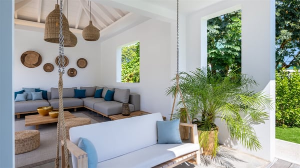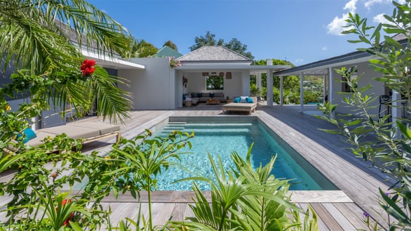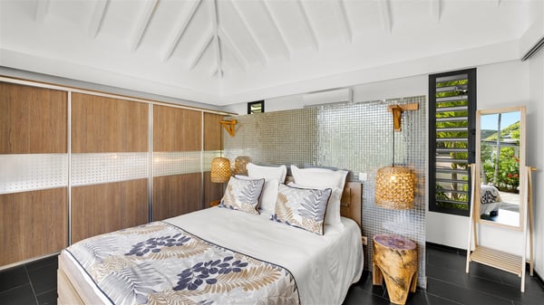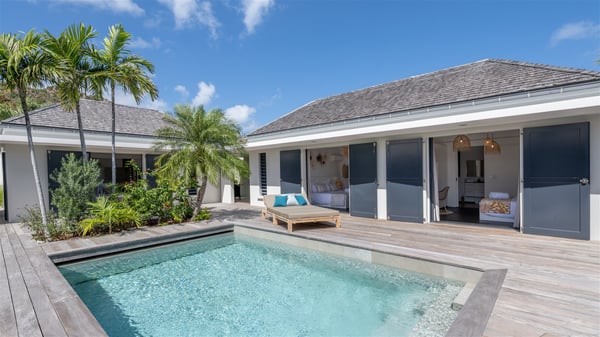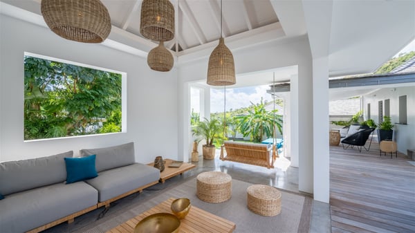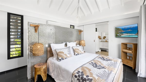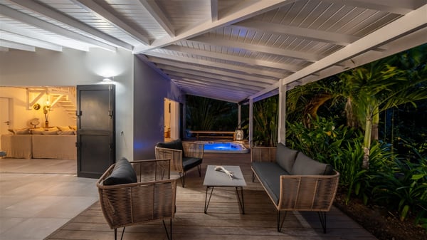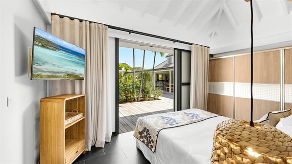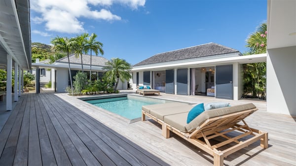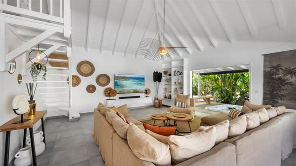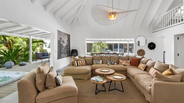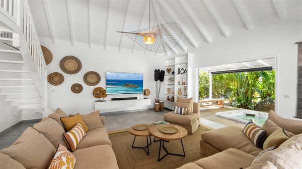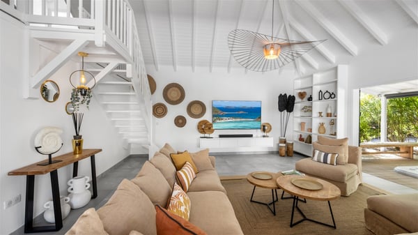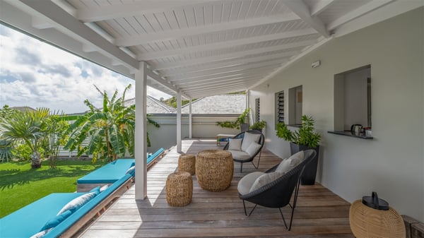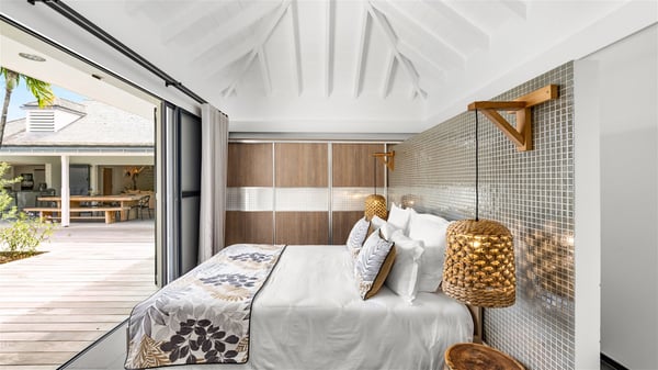 The holiday rental villa Crush is a fantastic four-bedroom property located in Grand-Cul-de-Sac in an enchanting environment. Spacious and modern, this vacation rental with a swimming pool and jacuzzi offers upscale amenities for an unforgettable eight-person stay in St-Barths. Built over several buildings connected around the central swimming pool, villa Crush welcomes guests in its bright spaces gently blown by the trade winds. Ideally located in Grand-Cul-de-Sac, this contemporary-style vacation home features a comfy living room furnished with a large sofa and an HDTV. The high, white, vaulted ceiling brings a unique cachet and authenticity to this most relaxing indoor space. On the side, the fully-equipped kitchen opens onto the terrace through a bar with stools, the perfect setup to chat over a coffee and enjoy the mild tropical air. In the center of the villa, the terrace offers several areas to enjoy the Caribbean sun and the tropical environment. Close to the comfortable loungers, the swimming pool sparkles on the deck in an idyllic scenery of rolling hills and lush palm trees. Under the covered part of the deck, you’ll love relaxing in the jacuzzi in a very private atmosphere, near the al fresco dining room which can accommodate eight guests. An outdoor lounge is also at your disposal in a cozy alcove furnished with sofas and soft cushions under woven fibre lights. What’s more, you will find the lovely and quiet garden accessible through a few steps on the side of the villa, which you’ll enjoy resting in, sitting on the wooden benches covered with turquoise blue and white cushions. The villa rental Crush consists of four air-conditioned bedrooms with en-suite bathrooms. They are furnished with king and queen-size beds, in a bright, restful and elegant decor. One of the bedrooms is located in the main building, while the other three overlook the property's swimming pool. Upstairs, you'll love enjoying the fitness room which can be accessed via an interior staircase similar to the whitewashed frame. Only a few minutes from Grand-Cul-de-Sac beach, Villa Crush is the perfect place for a fantastic eight-person stay in St-Barths.