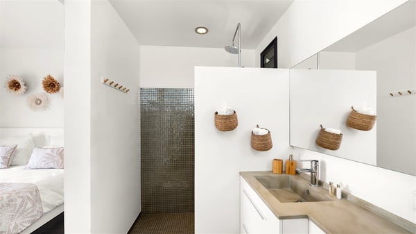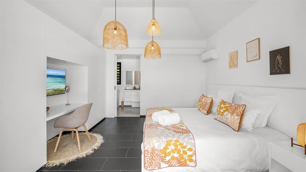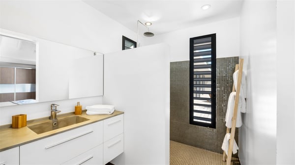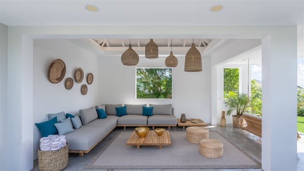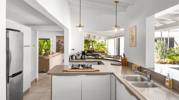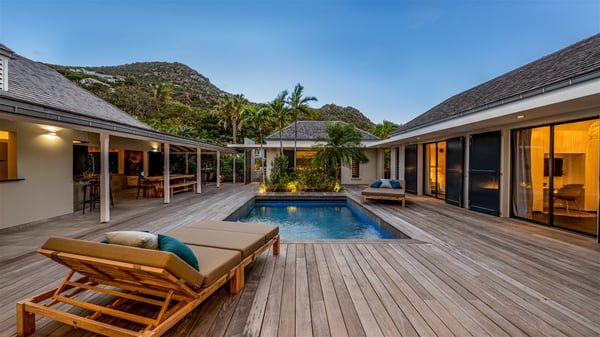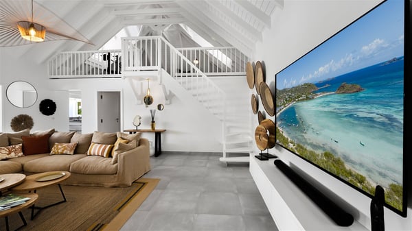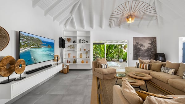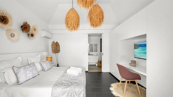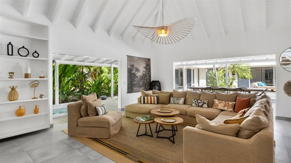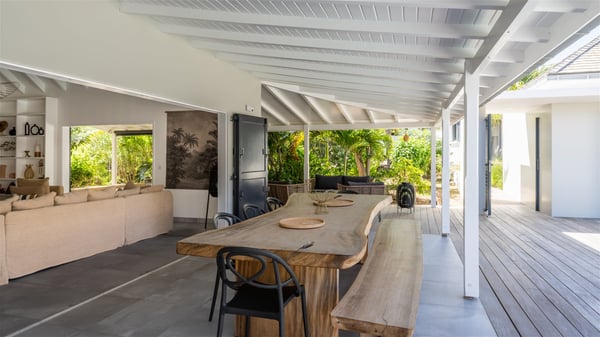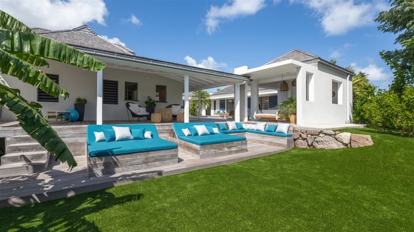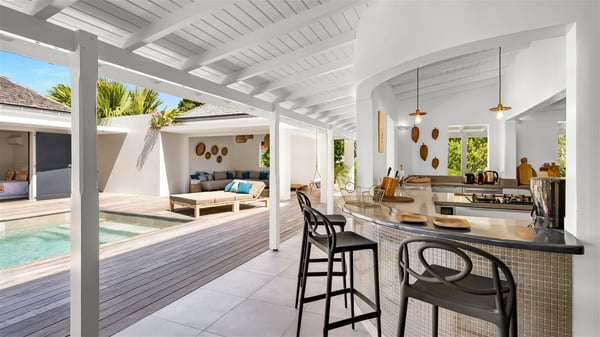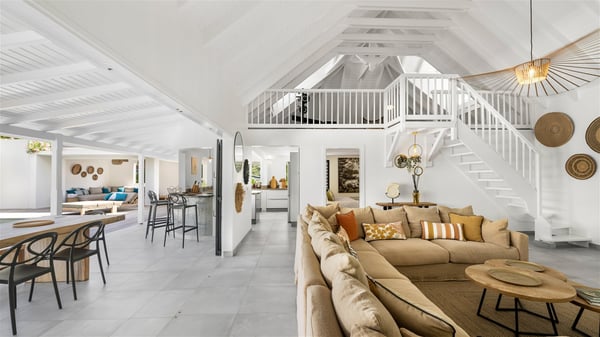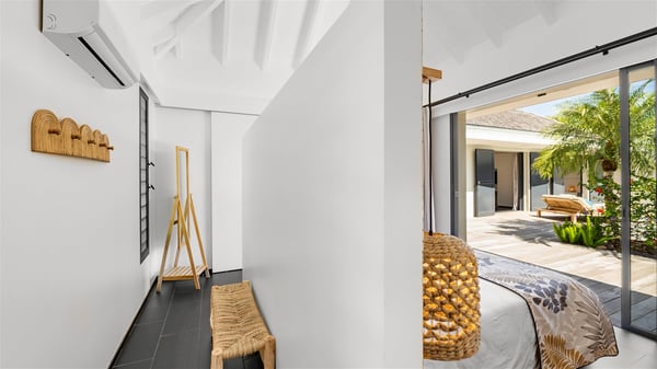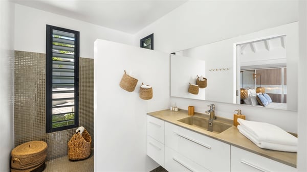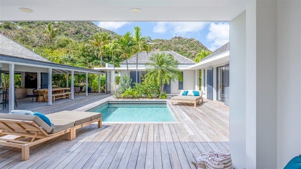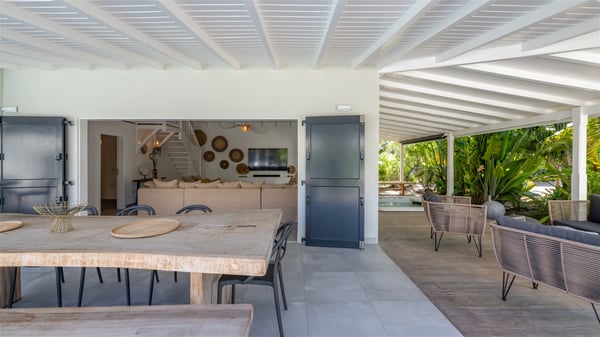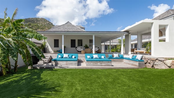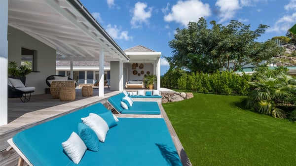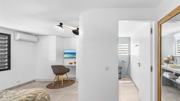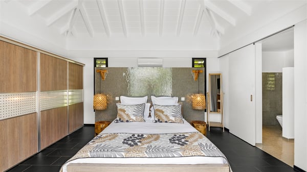 The holiday rental villa Crush is a fantastic four-bedroom property located in Grand-Cul-de-Sac in an enchanting environment. Spacious and modern, this vacation rental with a swimming pool and jacuzzi offers upscale amenities for an unforgettable eight-person stay in St-Barths. Built over several buildings connected around the central swimming pool, villa Crush welcomes guests in its bright spaces gently blown by the trade winds. Ideally located in Grand-Cul-de-Sac, this contemporary-style vacation home features a comfy living room furnished with a large sofa and an HDTV. The high, white, vaulted ceiling brings a unique cachet and authenticity to this most relaxing indoor space. On the side, the fully-equipped kitchen opens onto the terrace through a bar with stools, the perfect setup to chat over a coffee and enjoy the mild tropical air. In the center of the villa, the terrace offers several areas to enjoy the Caribbean sun and the tropical environment. Close to the comfortable loungers, the swimming pool sparkles on the deck in an idyllic scenery of rolling hills and lush palm trees. Under the covered part of the deck, you’ll love relaxing in the jacuzzi in a very private atmosphere, near the al fresco dining room which can accommodate eight guests. An outdoor lounge is also at your disposal in a cozy alcove furnished with sofas and soft cushions under woven fibre lights. What’s more, you will find the lovely and quiet garden accessible through a few steps on the side of the villa, which you’ll enjoy resting in, sitting on the wooden benches covered with turquoise blue and white cushions. The villa rental Crush consists of four air-conditioned bedrooms with en-suite bathrooms. They are furnished with king and queen-size beds, in a bright, restful and elegant decor. One of the bedrooms is located in the main building, while the other three overlook the property's swimming pool. Upstairs, you'll love enjoying the fitness room which can be accessed via an interior staircase similar to the whitewashed frame. Only a few minutes from Grand-Cul-de-Sac beach, Villa Crush is the perfect place for a fantastic eight-person stay in St-Barths.