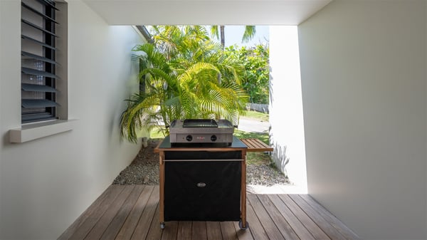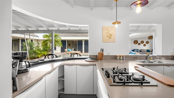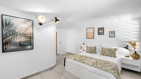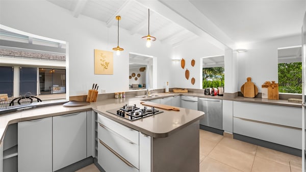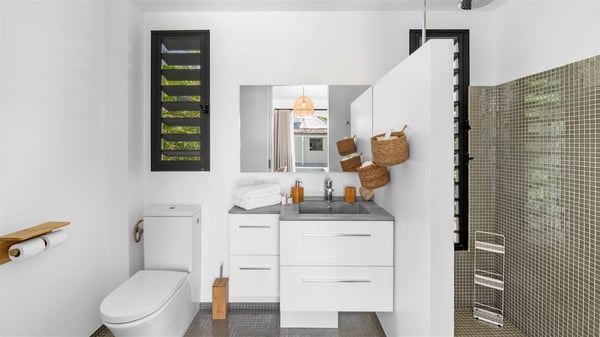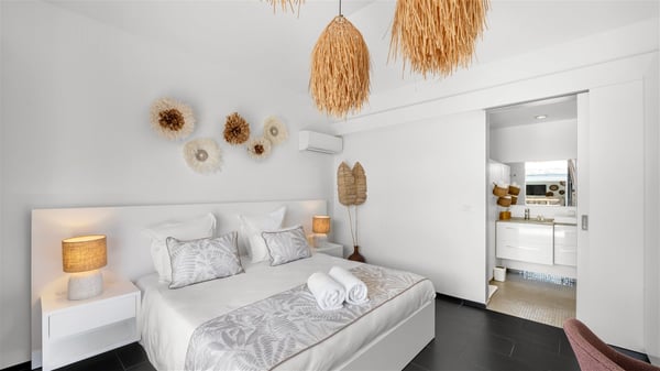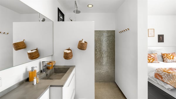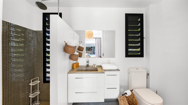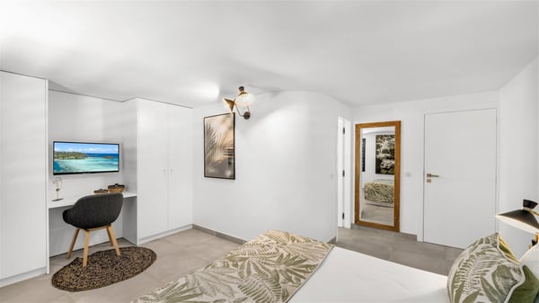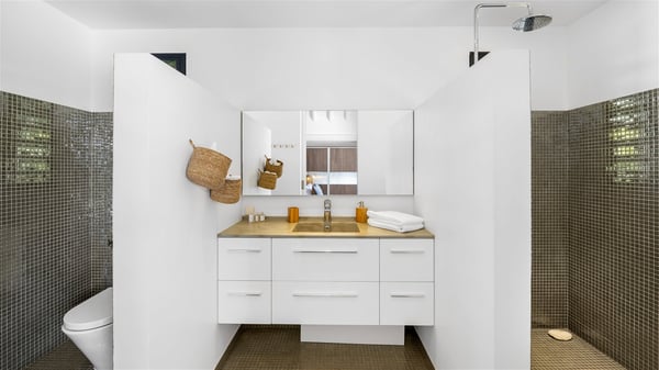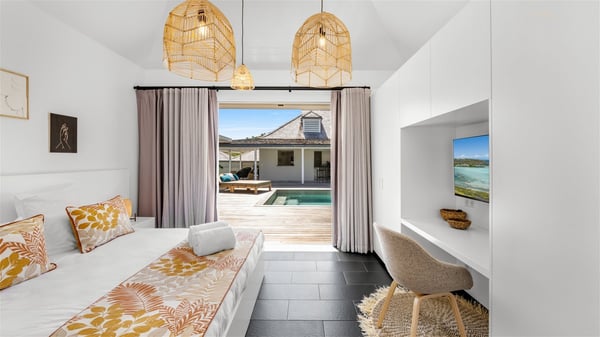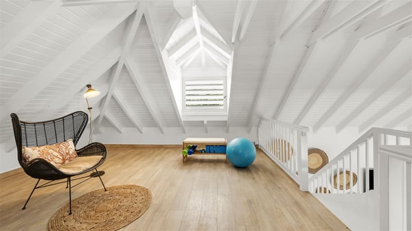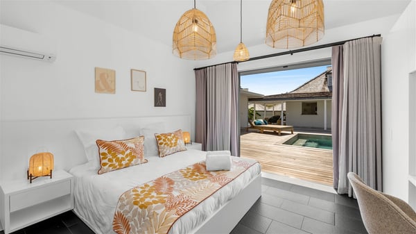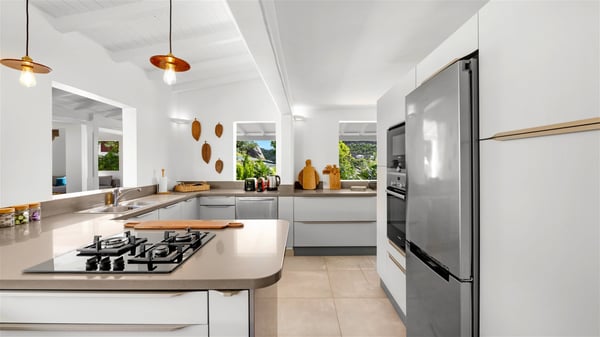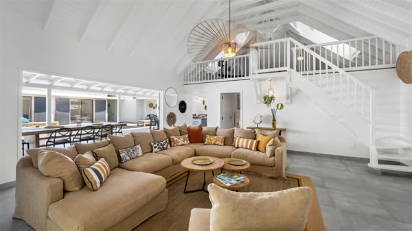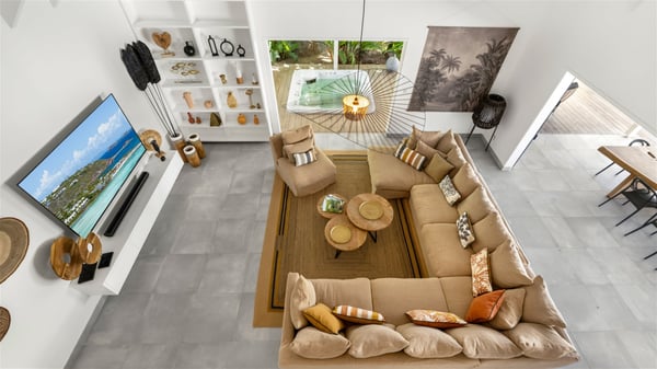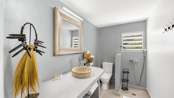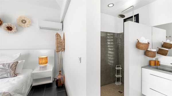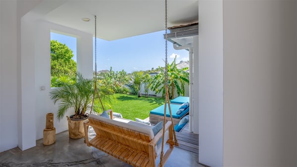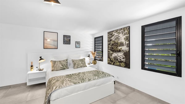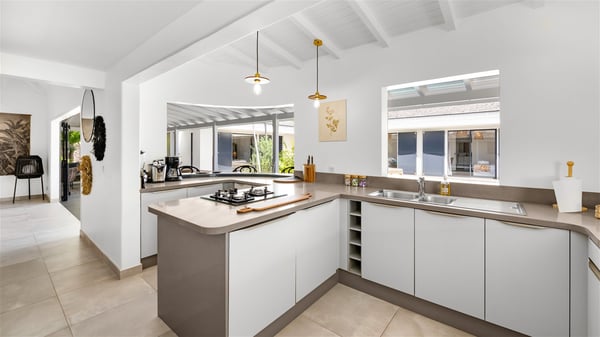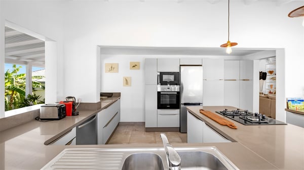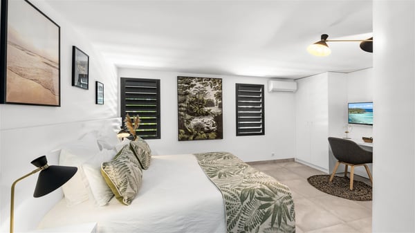 The holiday rental villa Crush is a fantastic four-bedroom property located in Grand-Cul-de-Sac in an enchanting environment. Spacious and modern, this vacation rental with a swimming pool and jacuzzi offers upscale amenities for an unforgettable eight-person stay in St-Barths. Built over several buildings connected around the central swimming pool, villa Crush welcomes guests in its bright spaces gently blown by the trade winds. Ideally located in Grand-Cul-de-Sac, this contemporary-style vacation home features a comfy living room furnished with a large sofa and an HDTV. The high, white, vaulted ceiling brings a unique cachet and authenticity to this most relaxing indoor space. On the side, the fully-equipped kitchen opens onto the terrace through a bar with stools, the perfect setup to chat over a coffee and enjoy the mild tropical air. In the center of the villa, the terrace offers several areas to enjoy the Caribbean sun and the tropical environment. Close to the comfortable loungers, the swimming pool sparkles on the deck in an idyllic scenery of rolling hills and lush palm trees. Under the covered part of the deck, you’ll love relaxing in the jacuzzi in a very private atmosphere, near the al fresco dining room which can accommodate eight guests. An outdoor lounge is also at your disposal in a cozy alcove furnished with sofas and soft cushions under woven fibre lights. What’s more, you will find the lovely and quiet garden accessible through a few steps on the side of the villa, which you’ll enjoy resting in, sitting on the wooden benches covered with turquoise blue and white cushions. The villa rental Crush consists of four air-conditioned bedrooms with en-suite bathrooms. They are furnished with king and queen-size beds, in a bright, restful and elegant decor. One of the bedrooms is located in the main building, while the other three overlook the property's swimming pool. Upstairs, you'll love enjoying the fitness room which can be accessed via an interior staircase similar to the whitewashed frame. Only a few minutes from Grand-Cul-de-Sac beach, Villa Crush is the perfect place for a fantastic eight-person stay in St-Barths.
