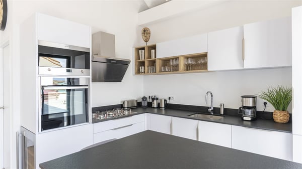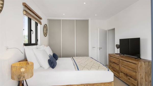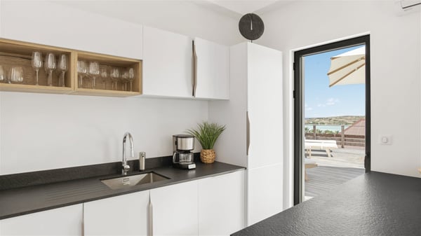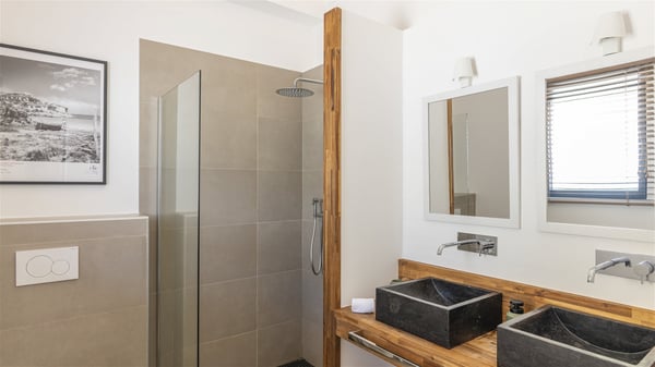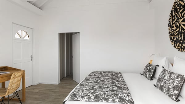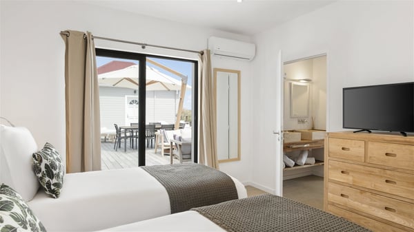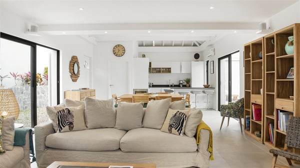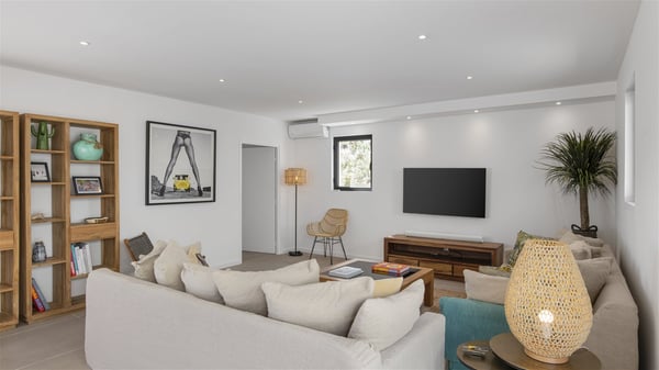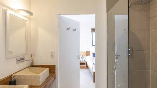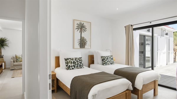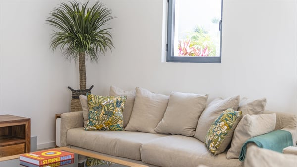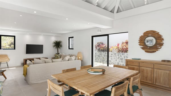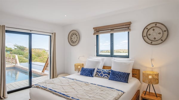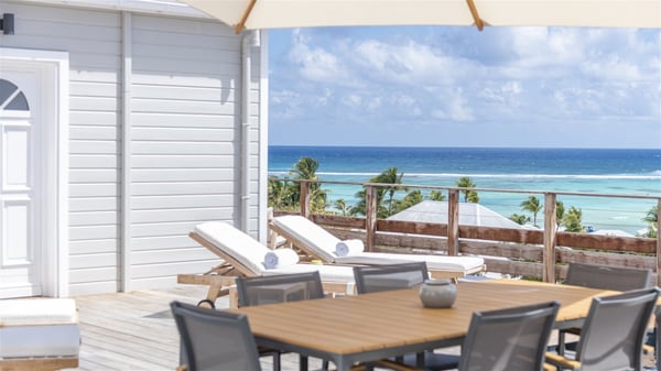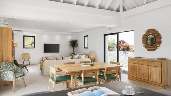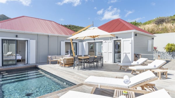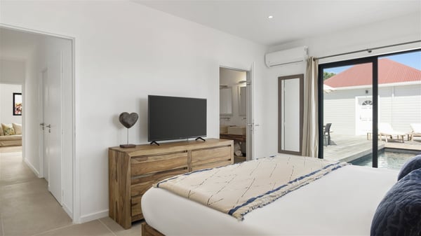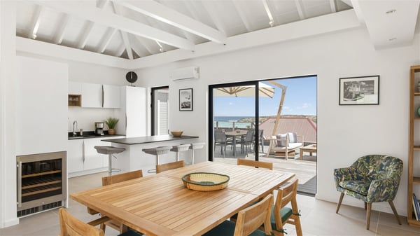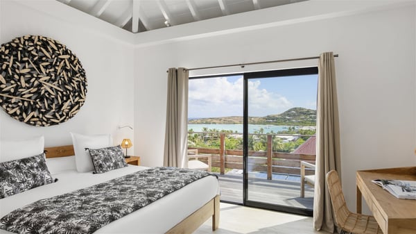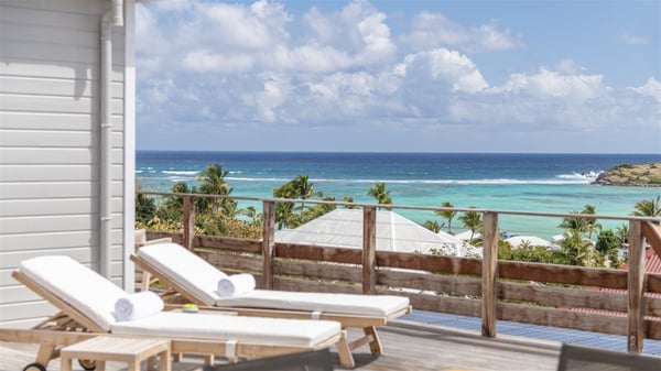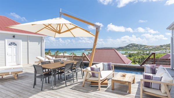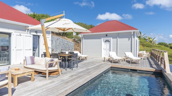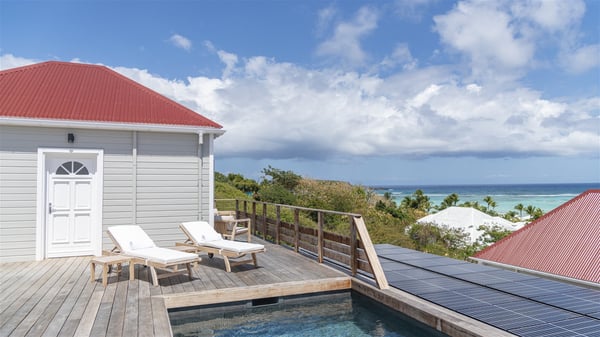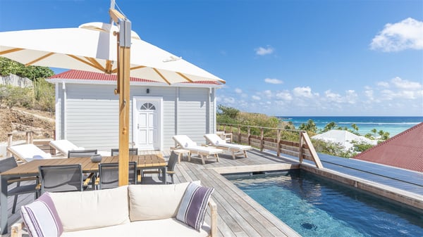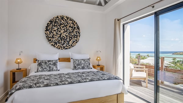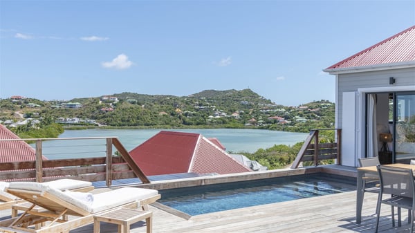 The villa rental Sun 2 is a charming property ideally located above Grand-Cul-de-Sac lagoon in an enchanting environment. In front of the view over the crystal-clear waters, villa Sun 2 offers beautiful, bright spaces in a chic and comfy decor. Between sky and sea, Sun 2 is the ideal place for an unforgettable stay for up to six people in St-Barths. Built on one level over two buildings connected by a lovely terrace, Villa Sun 2 overlooks the sparkling turquoise blue ocean. Nestled on the hillside, this luxurious property in St-Barths welcomes guests in the living room, blown by the gentle trade winds through the front and back openings. The lounge features a comfortable sofa and an HDTV in a very private and relaxing atmosphere. The dining room for six people is located in the same open space under the vaulted ceiling, close to the fully-equipped kitchen with a breakfast bar and a wine cellar. The bright openings onto the terrace with ocean view create a romantic and soothing atmosphere, the perfect place to relax in the tropical air. At the front, the charming terrace offers several spaces to relax around the sparkling swimming pool. There are deckchairs for pleasant sunbathing and chatting sessions in front of the stunning lagoon view. Under the large umbrella, you’ll find the outdoor dining room to dine al fresco in the mild Caribbean air. A second lounge is set up by the pool on the wooden deck, the perfect spot to sip a cocktail in the evening in an idyllic atmosphere. In the wooded hills of St-Barths, you’ll love relaxing and marvelling at the beauty of nature. The holiday rental villa Sun 2 consists of three bedrooms spread over the property. The very private master bedroom with en-suite bathroom is located in a separate bungalow, which opens onto a balcony connected to the terrace. The other two bedrooms, one of which is furnished with twin beds, share the same bathroom and open onto the terrace with a pool. The warm and cozy decor provides an exquisite feeling of quiet softness, in a refined tropical atmosphere. Facing the turquoise waters of Grand-Cul-de-Sac lagoon, villa Sun 2 is the perfect place for a fantastic six-person stay in St-Barths.