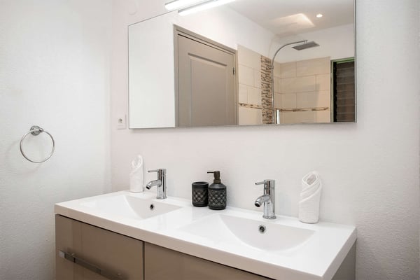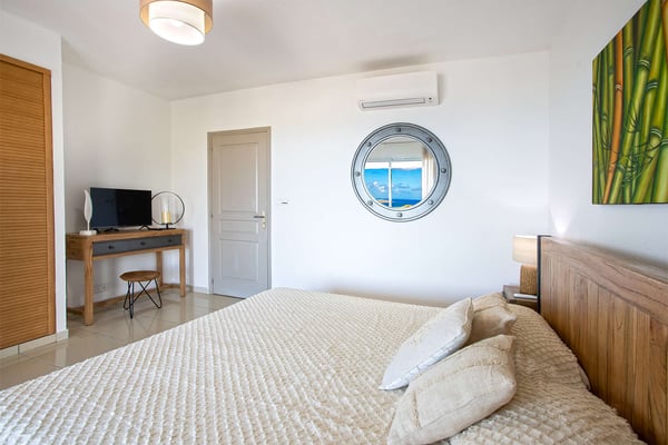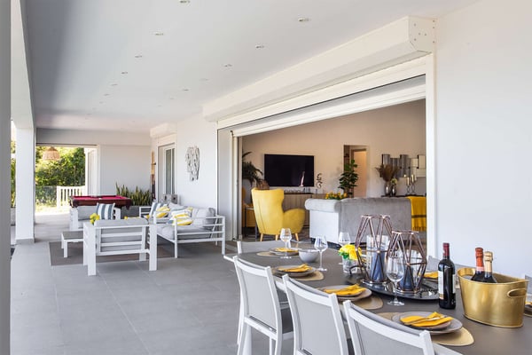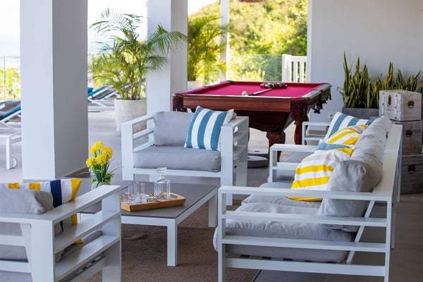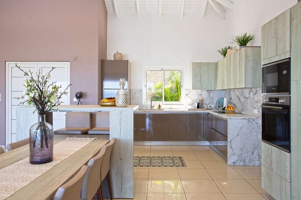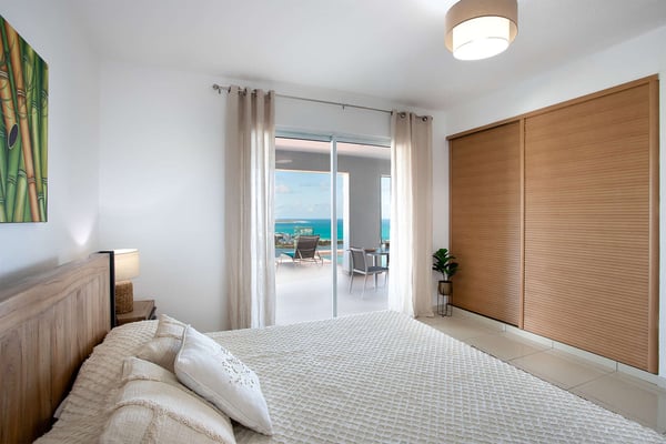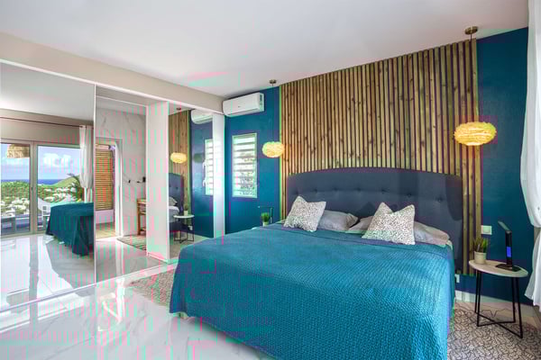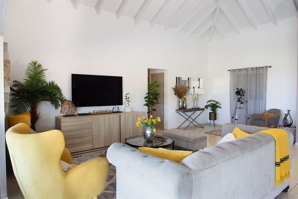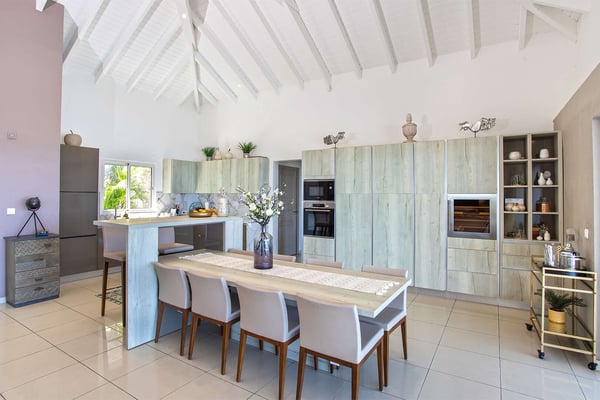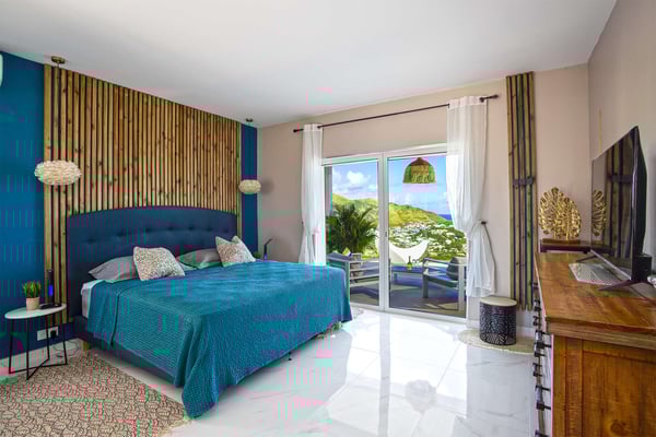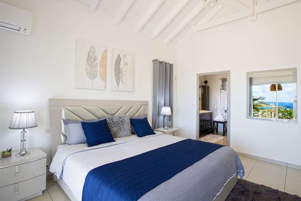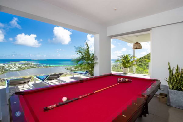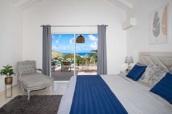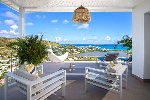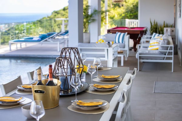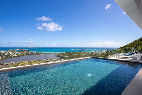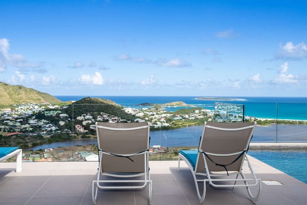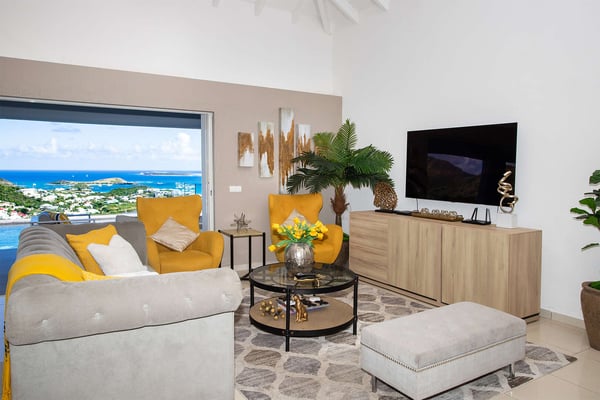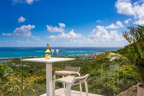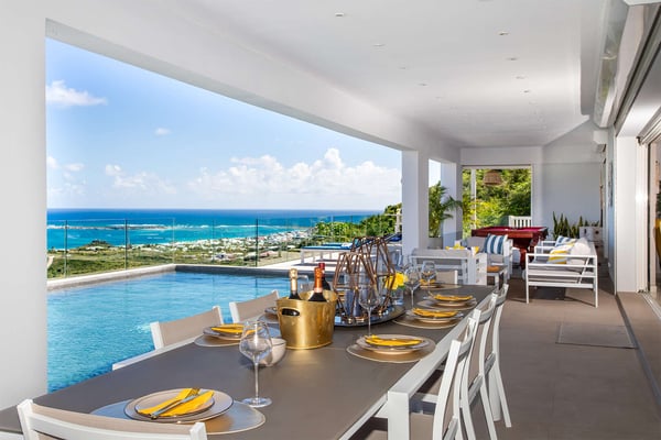 La Casa del Jefe is a private villa in St. Martin that boasts a magnificent 180-degree view from Orient Bay to Grand Case. Due to its high elevation in Mont Vernon, no matter where you are in the property, you'll be treated to breathtaking views of Tintamarre, Pinel Island, and even Grand Case. Villa La Casa del Jefe One offers one of the most magical and unique views in all of St. Martin. The terrace, framed by glass railings, is perfect for cooling off in the infinity pool, sunbathing on the pool lounge chairs, or sipping champagne at one of the tall tables surrounding the space. The covered dining area is ideal for a luxurious meal with stunning views, and the seating area is perfect for catching up on a good book. Feel free to turn on the music using the outdoor speakers and play pool with friends and family. Villa La Casa del Jefe's interior is equally impressive, with views made possible through the sliding glass doors creating an outdoor/indoor experience. The living room is decorated in an elegant classic style and features comfortable plush sofas and a large flat-screen TV. In the spacious and well-equipped kitchen, you'll find everything you need to prepare a meal or treat yourself to a private chef for those special occasions. The large dining table will provide plenty of space for your entire group to create lasting memories. The four bedrooms, each with a king-size bed, have sliding doors that lead to the terrace with ocean views. All rooms have exterior and interior entrances. Two of the bedrooms have ensuite bathrooms with double vanities and showers. The main bedroom has the added bonus of a relaxing outdoor shower area. Villa La Casa del Jefe is conveniently located in Mont Vernon near Orient Bay Beach and several gourmet restaurants in Orient Bay Village, Grand Case, as well as the shopping area of Hope Estate. Enjoy the best of Saint Martin life at La Casa del Jefe! Note: Please be aware that Villa La Casa del Jefe has an office located below the house, which is used by the owner's secretary. She typically works every day and parks her car on the road below, walking up to the office. The office has exterior access, but we do want you to be aware of this detail when booking this Villa.