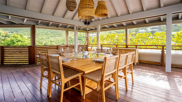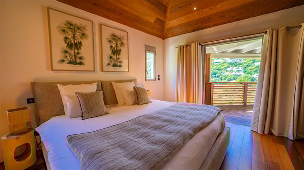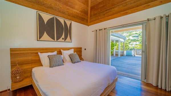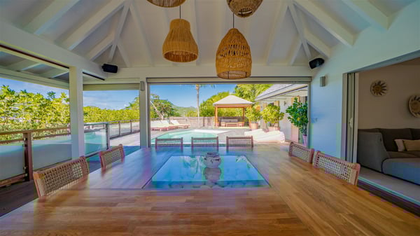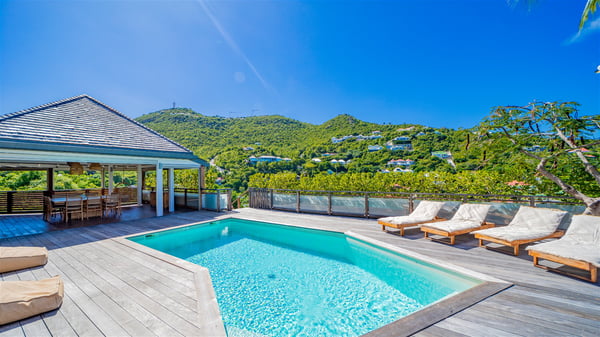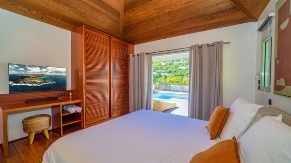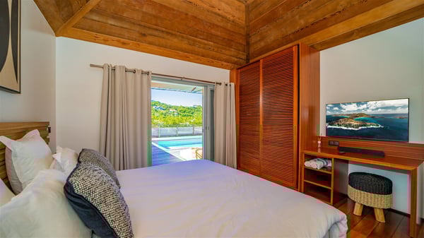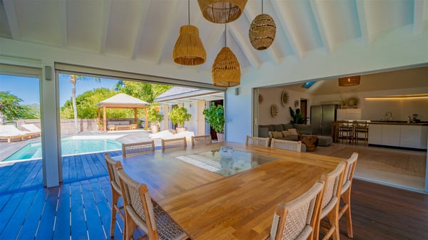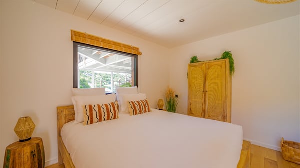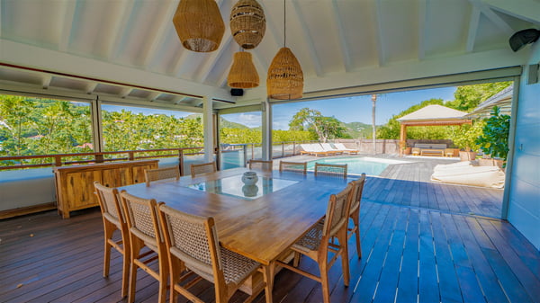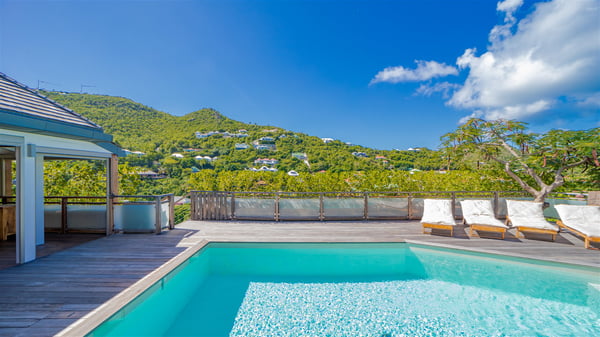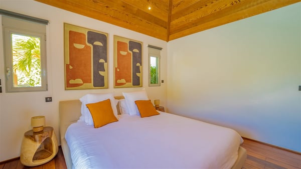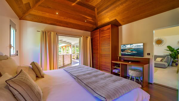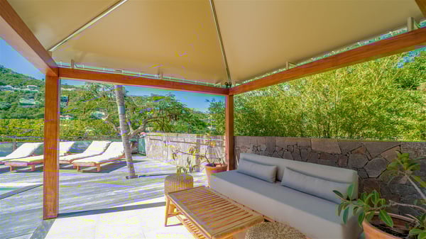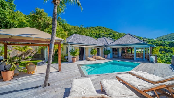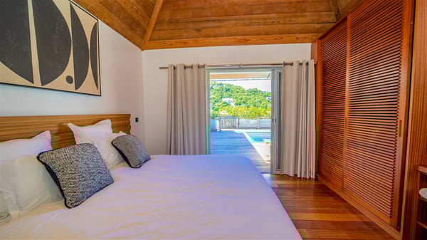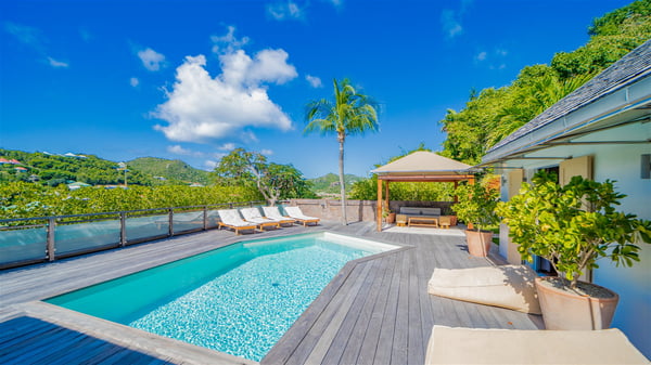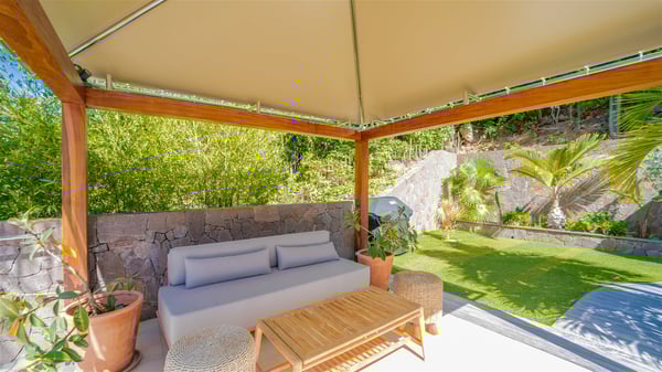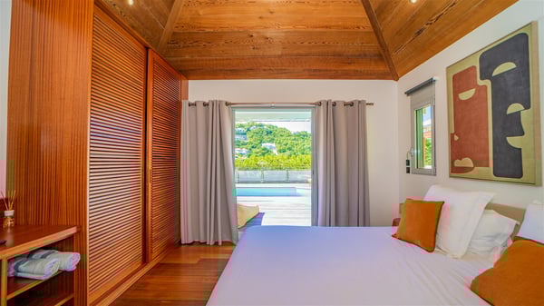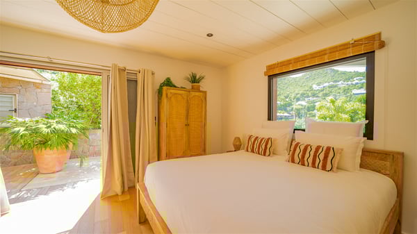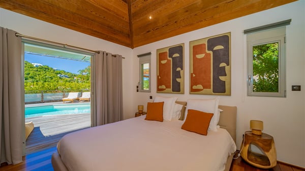 The vacation rental Villa Vi is a lovely Caribbean property nestled in the hills of St-Jean in a lush environment. Very bright and comfortable, this three-bedroom vacation rental with swimming pool offers beautiful indoor and outdoor spaces, the perfect place for a six-person Caribbean dream getaway. Built over one level, Villa Vi opens widely onto the lush environment of St-Barths’ rolling hills. Quiet and very private, this lovely property welcomes guests in the lounge furnished with a comfortable sofa covered with soft cushions in front of a large HD screen for pleasant movie nights. The fully-equipped kitchen is close to the living room and features a cozy breakfast bar, with natural light coming in from the skylights on the vaulted ceiling. Wood and wicker hints bring a warm and relaxing feel to this indoor space where you will enjoy resting, as the gentle trade winds blow through the openings. At the front of Villa Vi, the terrace features a large covered dining area which can accommodate up to eight guests for delightful al fresco meals in the tropical environment. A few steps away, you’ll find the sparkling swimming pool and comfortable loungers for sunbathing sessions under the island’s sun or chatting sessions in utmost privacy. You'll also appreciate the charming gazebo which is located at the other end of the swimming pool, furnished with an outdoor lounge with a comfy sofa and woven fibre armchairs, the best place to sip an evening cocktail in the mild tropical atmosphere. From here, the view over the lush vegetation creates an idyllic scenery, perfect to relax in the quiet and serene ambience. Villa Vi consists of three beautiful bedrooms and two bathrooms with king or queen size beds. Two of them open onto the terrace with a swimming pool, and the third one leads to the covered terrace. The bright colours and the fine wood hints under the vaulted ceilings make up a very romantic and refined spirit. In the heart of the lush tropical vegetation, ideally located in St-Jean close to all amenities, Villa VI is the perfect place for an unforgettable stay for six people in St-Barths.
