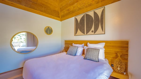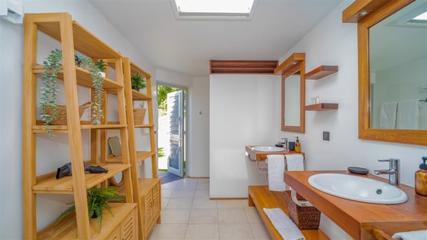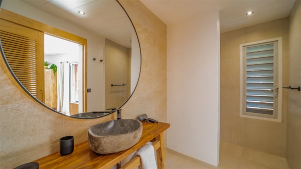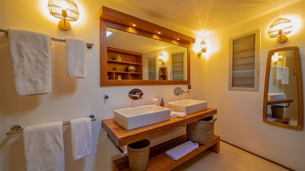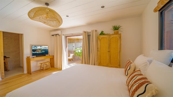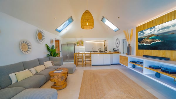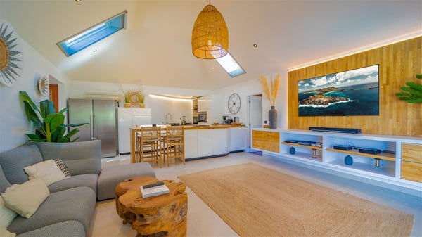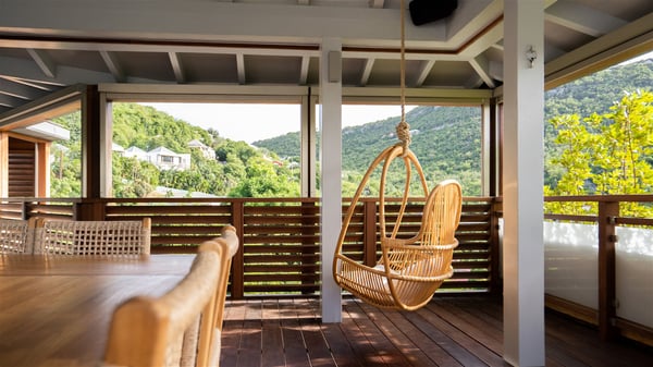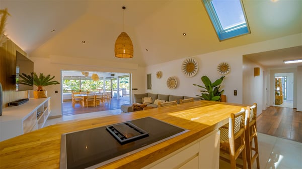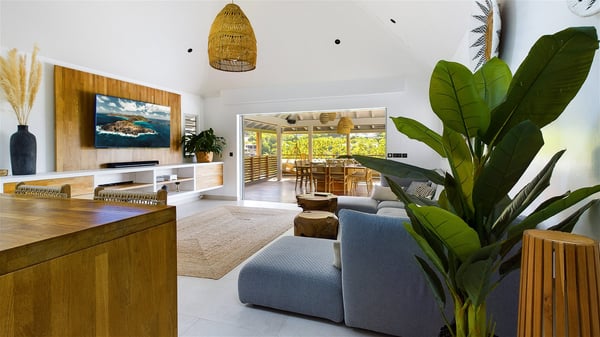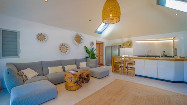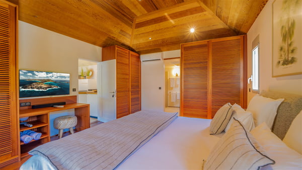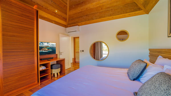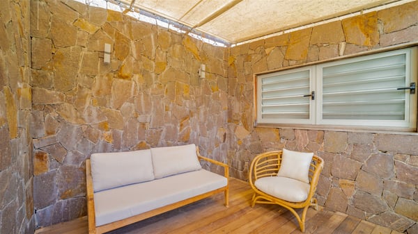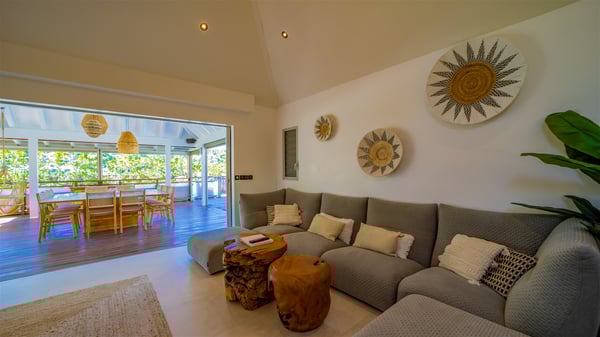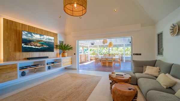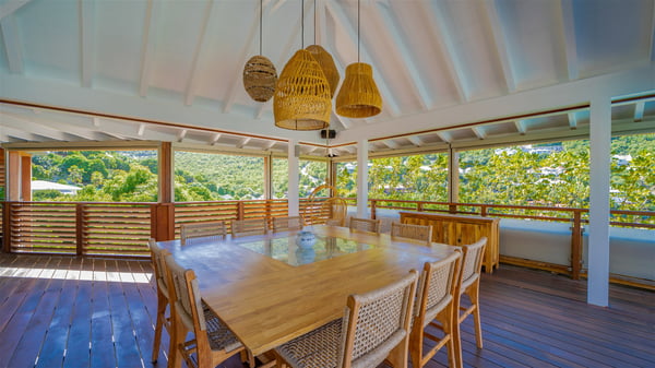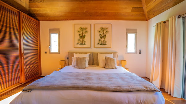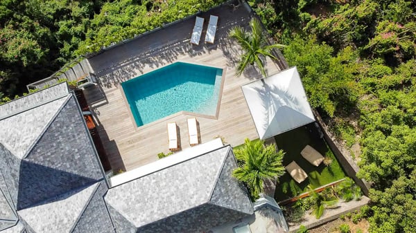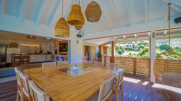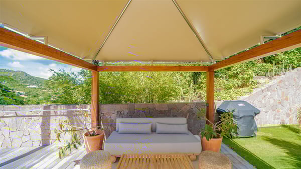 The vacation rental Villa Vi is a lovely Caribbean property nestled in the hills of St-Jean in a lush environment. Very bright and comfortable, this three-bedroom vacation rental with swimming pool offers beautiful indoor and outdoor spaces, the perfect place for a six-person Caribbean dream getaway. Built over one level, Villa Vi opens widely onto the lush environment of St-Barths’ rolling hills. Quiet and very private, this lovely property welcomes guests in the lounge furnished with a comfortable sofa covered with soft cushions in front of a large HD screen for pleasant movie nights. The fully-equipped kitchen is close to the living room and features a cozy breakfast bar, with natural light coming in from the skylights on the vaulted ceiling. Wood and wicker hints bring a warm and relaxing feel to this indoor space where you will enjoy resting, as the gentle trade winds blow through the openings. At the front of Villa Vi, the terrace features a large covered dining area which can accommodate up to eight guests for delightful al fresco meals in the tropical environment. A few steps away, you’ll find the sparkling swimming pool and comfortable loungers for sunbathing sessions under the island’s sun or chatting sessions in utmost privacy. You'll also appreciate the charming gazebo which is located at the other end of the swimming pool, furnished with an outdoor lounge with a comfy sofa and woven fibre armchairs, the best place to sip an evening cocktail in the mild tropical atmosphere. From here, the view over the lush vegetation creates an idyllic scenery, perfect to relax in the quiet and serene ambience. Villa Vi consists of three beautiful bedrooms and two bathrooms with king or queen size beds. Two of them open onto the terrace with a swimming pool, and the third one leads to the covered terrace. The bright colours and the fine wood hints under the vaulted ceilings make up a very romantic and refined spirit. In the heart of the lush tropical vegetation, ideally located in St-Jean close to all amenities, Villa VI is the perfect place for an unforgettable stay for six people in St-Barths.