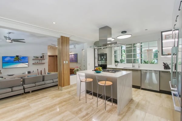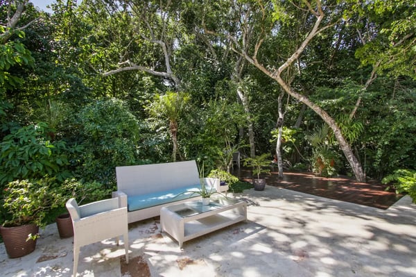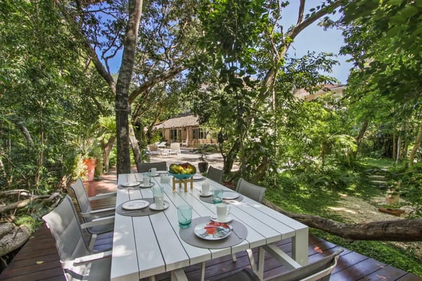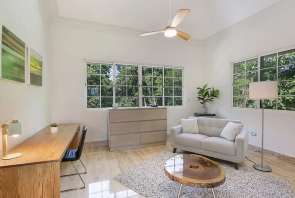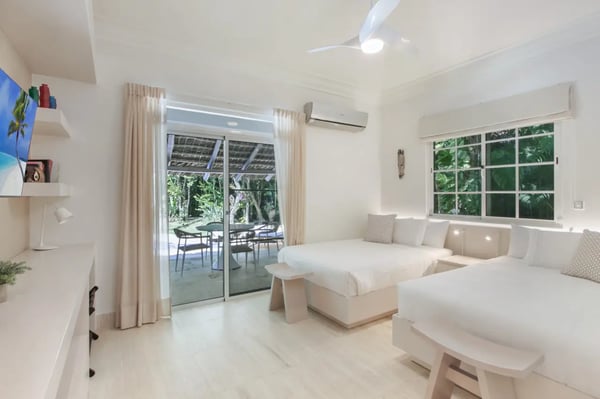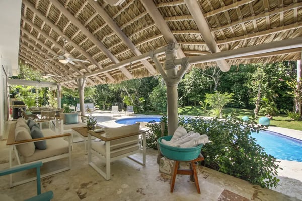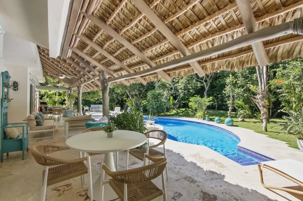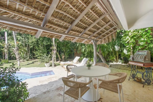 Guests staying within Puntacana Resort & Club will have access to all resort amenities and facilities. Resort amenities and facilities include two golf courses ($), two beach clubs ($), Six Senses Spa ($), restaurants ($), bars ($) and tennis centre ($). The style, decor, and furniture are very welcoming, and the villa has lots of comfortable spaces where you can relax and feel at home. The villa welcomes you with its unmistakable blue front door and entrance with a small garden. As soon as you come in, you’ll find yourself in the open living- dining- and kitchen area. This is the heart of the villa, a very comfortable space with unique décor and artwork that liven up the place. The living room has a great sofa with chaise, TV, and ceiling fans. The dining area and kitchen are located right behind the living room and are a great place to entertain. Enjoy your meals at the dining table or dine al fresco on the terrace. The open kitchen with a cooking island is state-of-the-art and has double fridges and double freezers, plus all the necessary amenities you need to cook your daily meals. Enjoy the spacious terrace which has a “cana” palm leaf roof and ceiling fans to keep the space cool even on sunny days. The terrace has all new furniture, including a dining table (seats 10), a sofa lounge area, and another dining table (seats 4). The backyard is a completely lush and private oasis with a beautiful, kidney-shaped swimming pool, a deck with lounge chairs, and a “hideaway” wooden terrace with another dining table and a small sofa. Indulge in a delightful lunch served on the terrace beside the pool, or unwind with a nap by the poolside, letting the gentle Caribbean breeze lull you into relaxation... If you want more privacy, retreat to the roof-top style terrace and relax on one of the sun loungers.