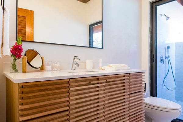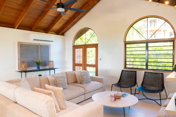 Guests of Sea Palms villa are greeted by a paradise-like setting. The main house features a bright and airy great room with multiple areas for sitting and entertaining. The space has cool tile floors and high, wood-beam ceilings with fans throughout and includes a separate formal dining room and a large, fully-stocked kitchen. Sea Palms provides four spacious bedrooms, each with indoor/outdoor showers and direct access to the patio and manicured grounds. Two are in the main house, including a grand master with an ensuite bathroom and soaking tub on one side and a suite with two queen beds on the other. Two additional bedrooms are in the attached cabana, offering ultimate comfort and privacy for all guests. With elegant outdoor dining, lounging, and reading areas, hammocks nestled under the trees, and a beautiful tropical garden, Sea Palms is a blissful oasis just steps from the sand. Relax in the crystal blue pool, layout in the sun, enjoy the refreshing sea breeze and dreamy views of Mango Bay, and glorious sunsets at the end of the day. A private path takes you right onto the beach, where you will find an outdoor shower to rinse off after playing on the beach and in the water.