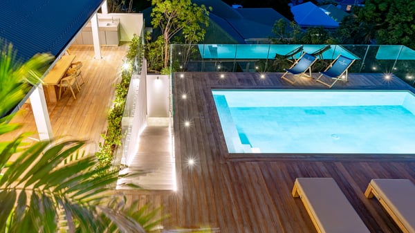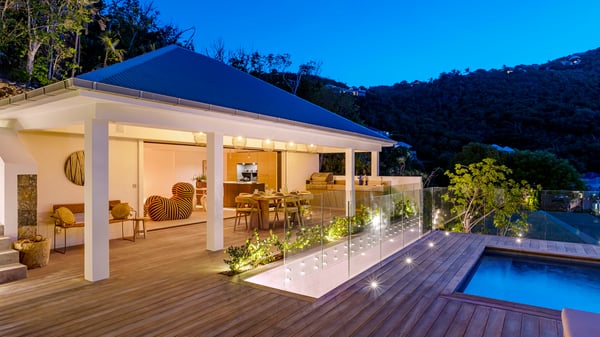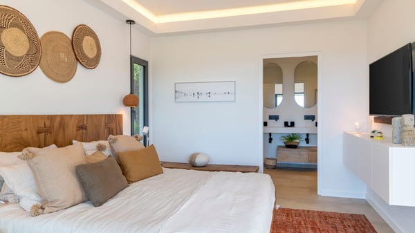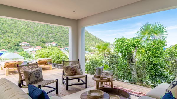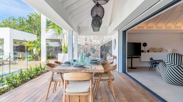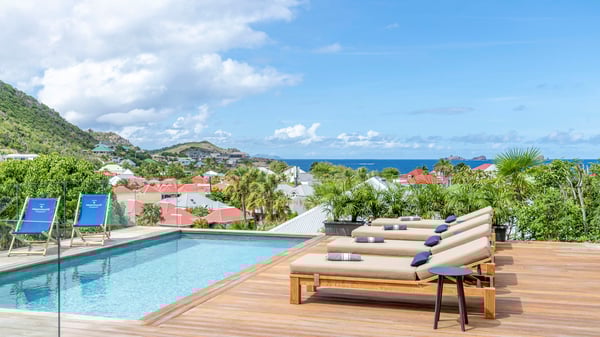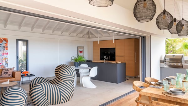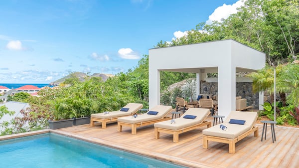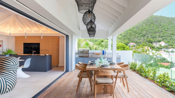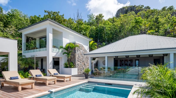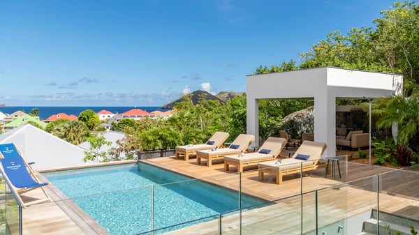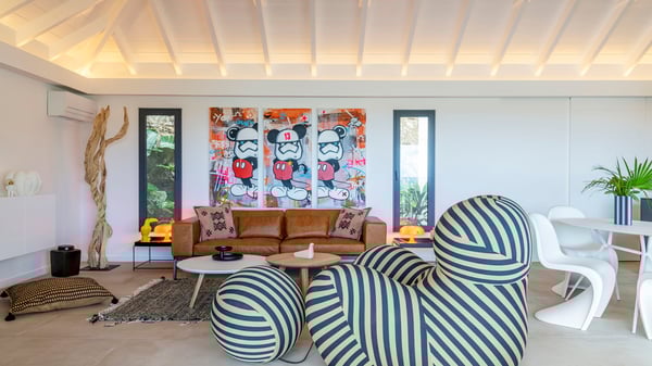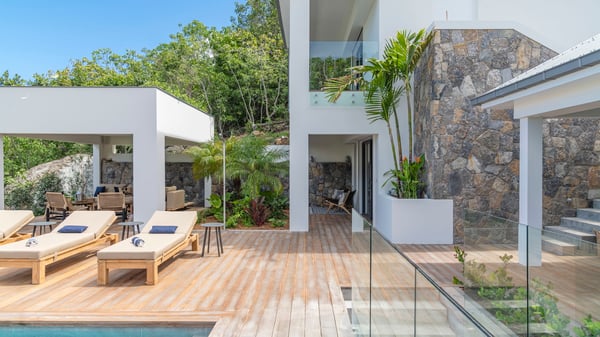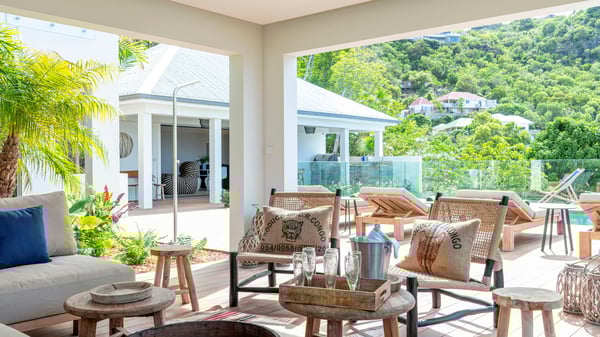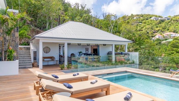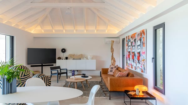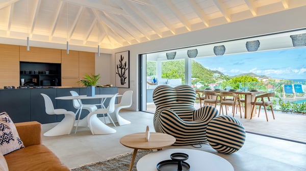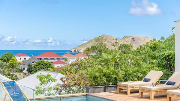 The holiday rental villa Flamands Escape is a charming two-bedroom property located in the hills of Flamands. Luxurious and comfortable, this vacation home offers an amazing view over the ocean and the rolling hills. Featuring beautiful living spaces, this lovely villa with a heated swimming pool is the perfect place for a Caribbean getaway. Recently built over two levels, the vacation villa Flamands Escape is a haven of peace in front of the sparkling ocean. In a contemporary style, the living room welcomes guests in the comfy lounge with sofas, wide bouncy chairs and pop artwork under a vaulted white wood ceiling. The indoor dining room is located in the same open space, close to the kitchen on the side of this large living room. The bay window opens onto the terrace and the breathtakingly beautiful panorama of bright green vegetation and turquoise St-Barths waters. At the front, the terrace overlooks the ocean and offers beautiful spaces to relax in the gentle trade winds. Under the covered area, the outdoor dining room can accommodate up to six guests in a soothing atmosphere under beautiful ceiling lights, for delicious al fresco dinners cooked on the barbecue. A few steps ahead, there is a lovely heated pool, for pleasant swimming and sunbathing sessions on the deckchairs covered with soft cushions. An ajoupa is also set up on the side, with a comfortable living room furnished with sofas, armchairs and coffee tables. In the heart of the green idyllic scenery, it is the perfect place to sip a cocktail, read or chat in the mild Caribbean air. Villa Flamands Escape consists of two air-conditioned bedrooms with en-suite bathrooms. One of them is located on the main level, and the second one is on the upper level. They are furnished with king-size beds, office areas and open onto the terraces. The decor is warm and refined, with bright tones and wood hints, for pleasant evenings and nights in St-Barths’ bliss. Spacious and comfortable, the vacation rental villa Flamands Escape offers stunning views over the ocean and the lush vegetation of St-Barths, the perfect place for an unforgettable stay in the Caribbean.