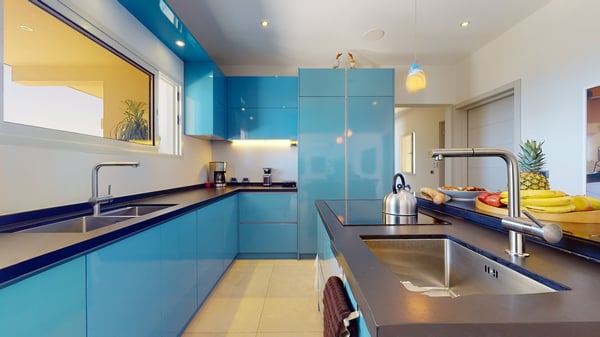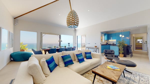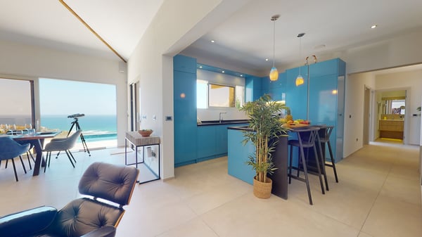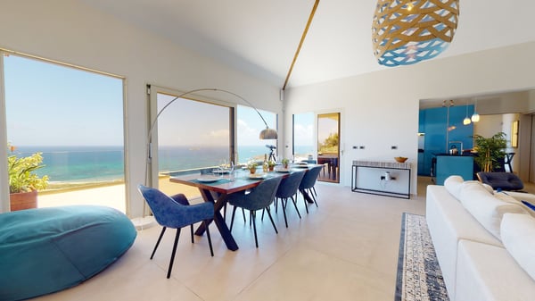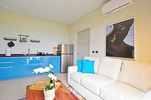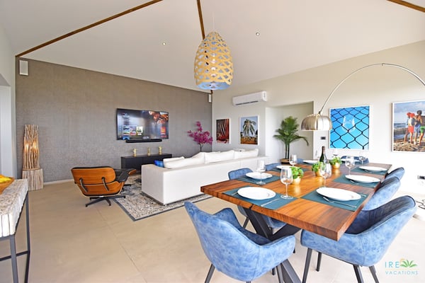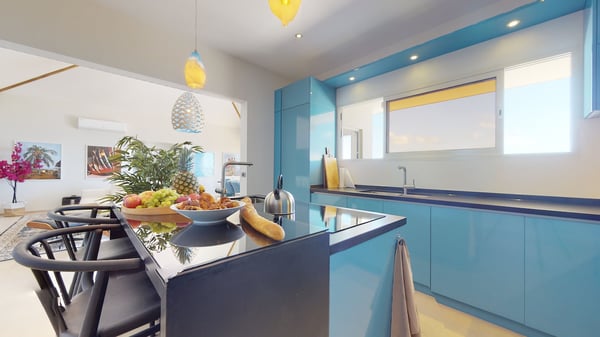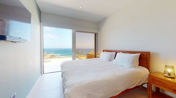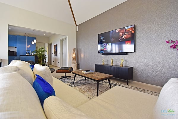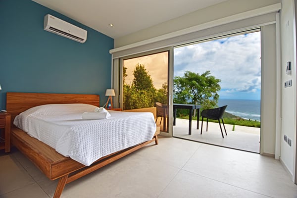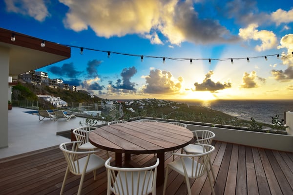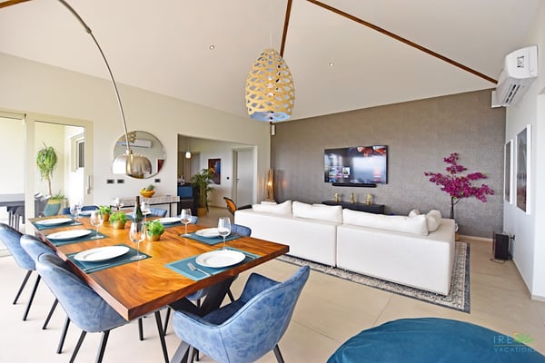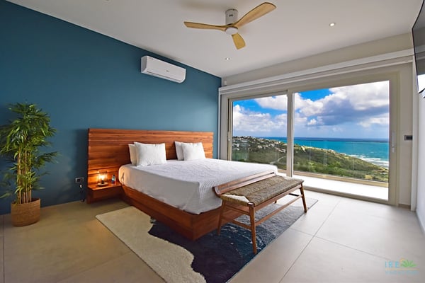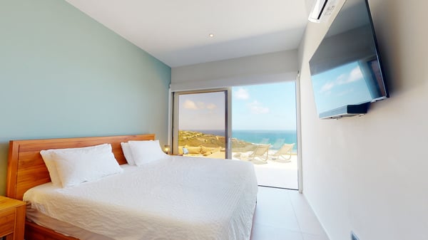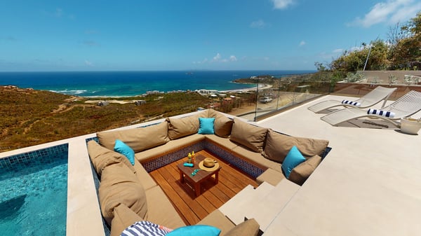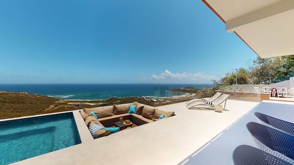 Villa Kanoa is a stunning high-end villa located in Mandara Residences at Red Pond in St. Maarten, offering breathtaking sunrise ocean views. This fully air-conditioned, luxurious villa features three bedrooms and two bathrooms, making it the perfect retreat for families and friends. There is an additional one-bedroom apartment with exterior access as the fourth bedroom. As you enter the villa, you’ll be greeted by an open-concept living area that blends indoor and outdoor spaces, creating a perfect ambiance for relaxation and entertainment. The living/dining room is elegantly furnished with comfortable seating, a 75″ flat-screen TV, a Sonos Sound System, and beautiful artwork from the owners’ son, who is a respected photographer in Europe. The floor-to-ceiling glass doors provide spectacular views of the ocean. The gourmet kitchen is fully equipped with state-of-the-art appliances and everything that you need to prepare delicious meals. The dining table has seating for eight. The real gem of the villa is the awe-inspiring un-obstructed 180° view of the ocean and St. Barthelemy. From the lowered lounge area, you can hear the sound of the waves and enjoy a nice cocktail while taking in the passing mega-yachts and smaller boats. The sunrise is simply breathtaking, even a rain shower approaching from the Atlantic Ocean will stun you. Guests can also enjoy a temperature-controlled plunge pool and BBQ area. The villa’s bedrooms are beautifully decorated and designed for ultimate comfort and relaxation. Each bedroom features a king-size bed, a 50″ flat-screen TV, each access to the outside terrace, providing a constant connection to the stunning view. This high-end villa is located in the exclusive Red Pond area of St. Maarten, just a short drive from some of the island’s best restaurants, shops, and attractions. With its luxurious amenities and breathtaking views, this villa is the perfect place to escape and indulge in the ultimate Caribbean vacation. Come relax and unwind in this luxurious and picturesque villa.