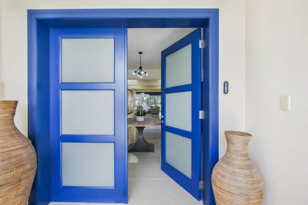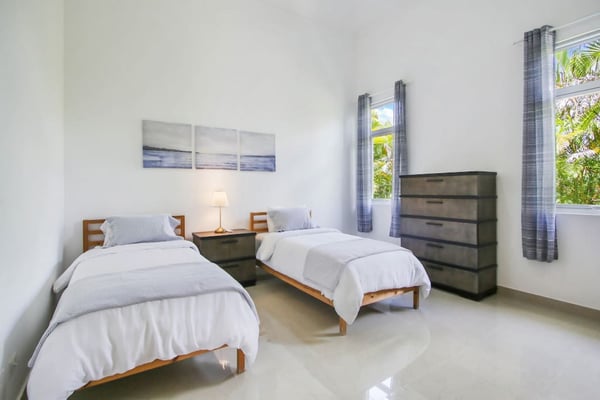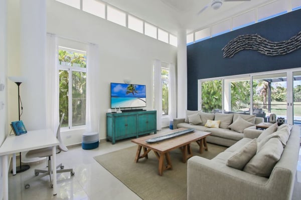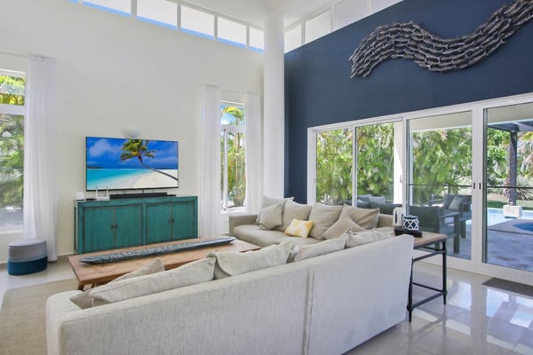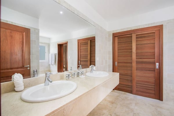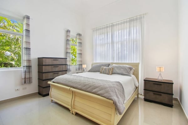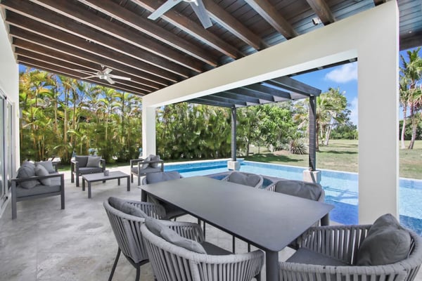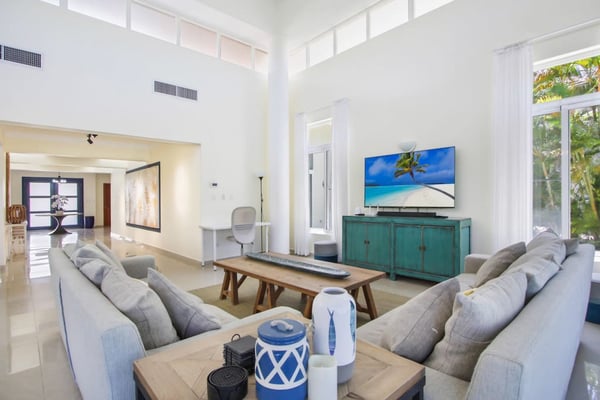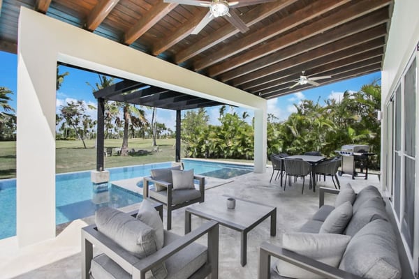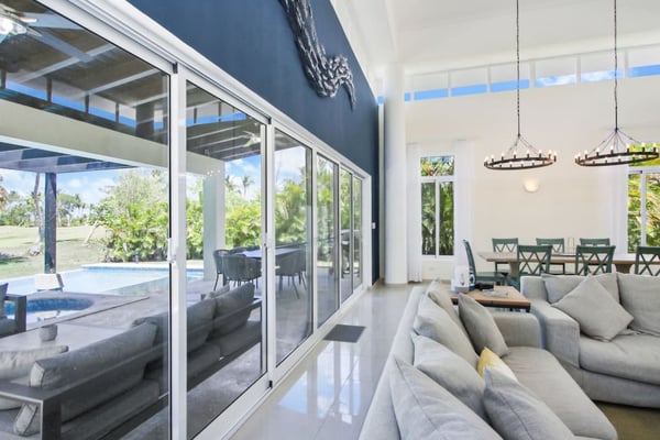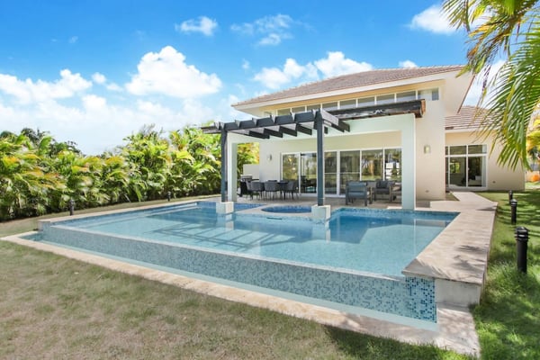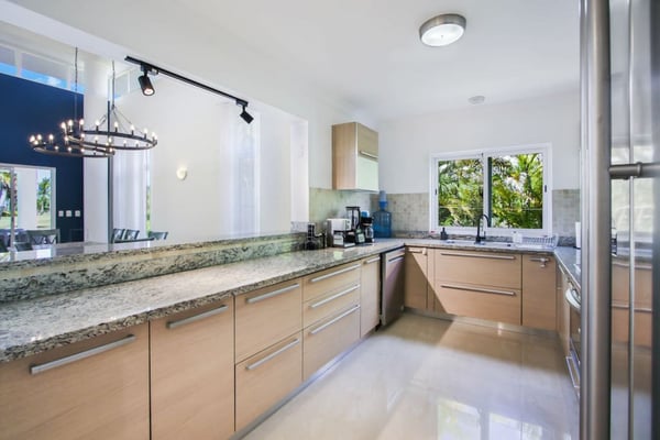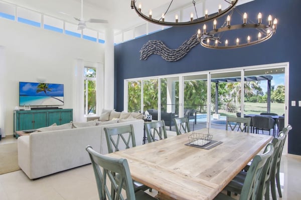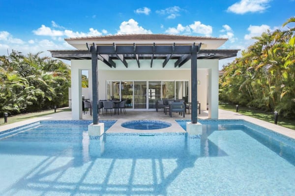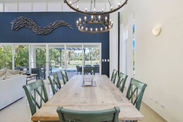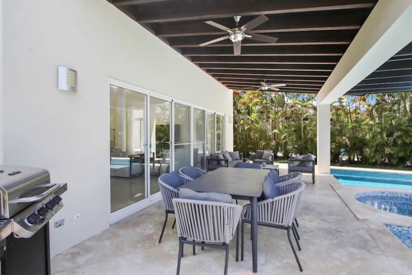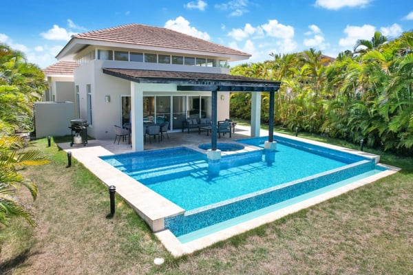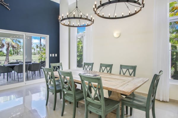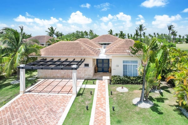 In the heart of Bavaro is Cocotal Golf & Country Club, Punta Cana's premier gated community. Guests staying within Cocotal have access to all Club facilities including the swimming pools, restaurants ($) and bars ($). Club facilities may be closed on certain days for private events. Coral Cielo is a cozy 3-bedroom, 3 1/2 bath, single-story villa that offers a seamless blend of indoor-outdoor living. As you step through the characteristic blue double doors, a spacious foyer welcomes you with its tranquil vibes and decor. A hallway leads you to the semi-open kitchen, living- and dining room. The villa's contemporary interior is accentuated by high ceilings and modern furniture that is both functional and aesthetically pleasing. The open floor plan seamlessly connects the kitchen, dining, and living areas, creating an inviting and comfortable space for relaxation and socializing. The fully equipped kitchen provides everything you need to prepare your meals during your stay. For the ultimate vacation experience, you can opt to hire a chef (at an additional fee) to take care of the cooking during your vacation (groceries not included). The large kitchen has a bar countertop, which is open towards the living and dining area. The comfortable sofa area in the living room is the perfect place to relax and watch TV. The indoor dining room with chandeliers provides a great dining space adjacent to the kitchen. From the living- and dining area, you can step directly onto the furnished terrace, where you'll find a second dining table, an outdoor BBQ, and a sofa area. From the terrace, you can walk into the pool or slide into the Jacuzzi. Enjoy the view of the backyard with lush palm trees on both sides and a green lawn, which blends seamlessly together with the golf course, offering a picturesque backdrop for your Caribbean getaway. The large kitchen is semi-open towards the living- and dining room, which is all one, open space. From the living/dining room, you have direct access to the furnished terrace, swimming pool & Jacuzzi, outdoor dining area and garden overlooking the Cocotal golf course.