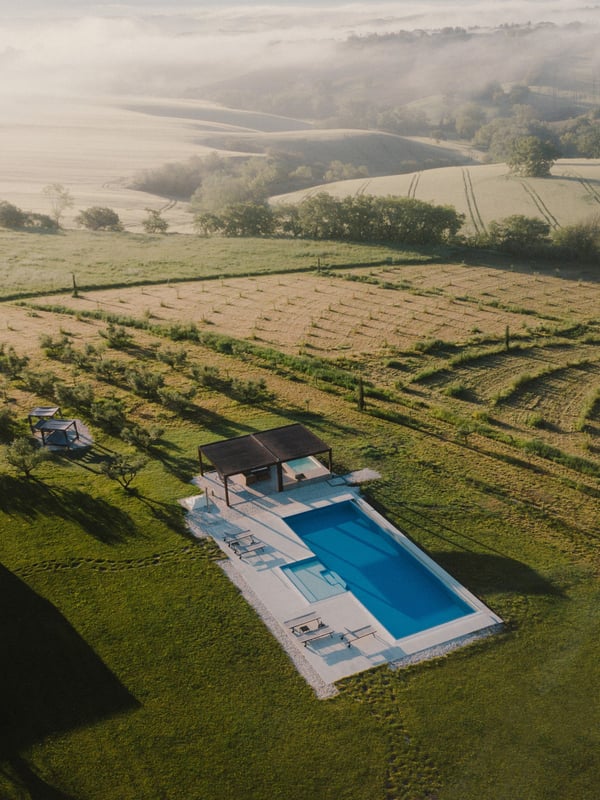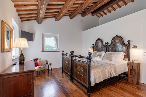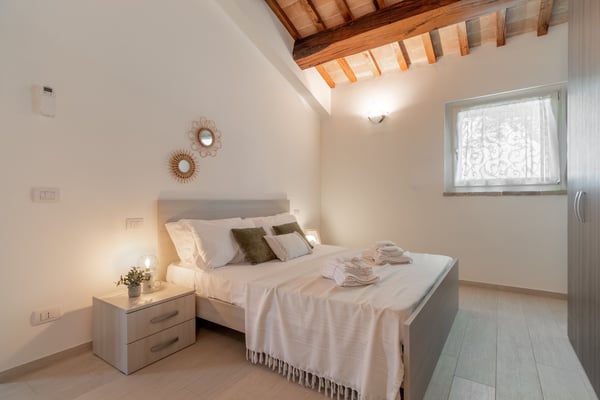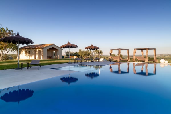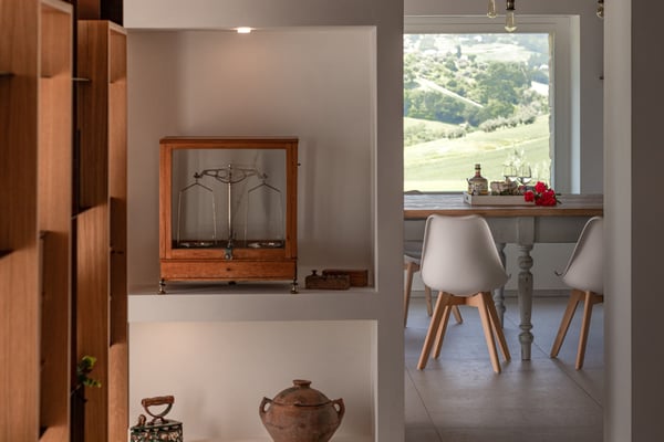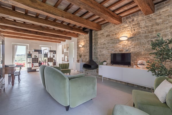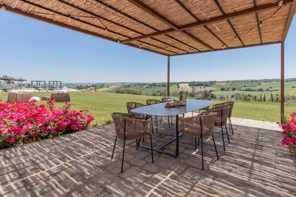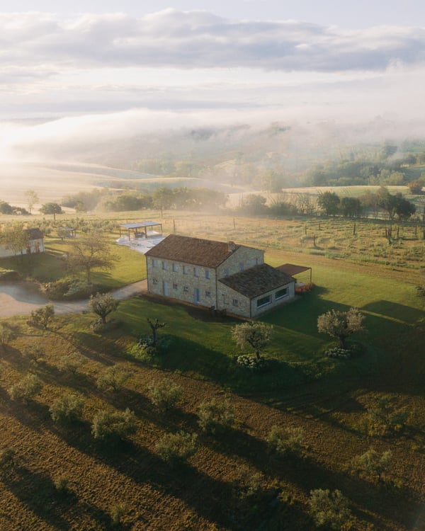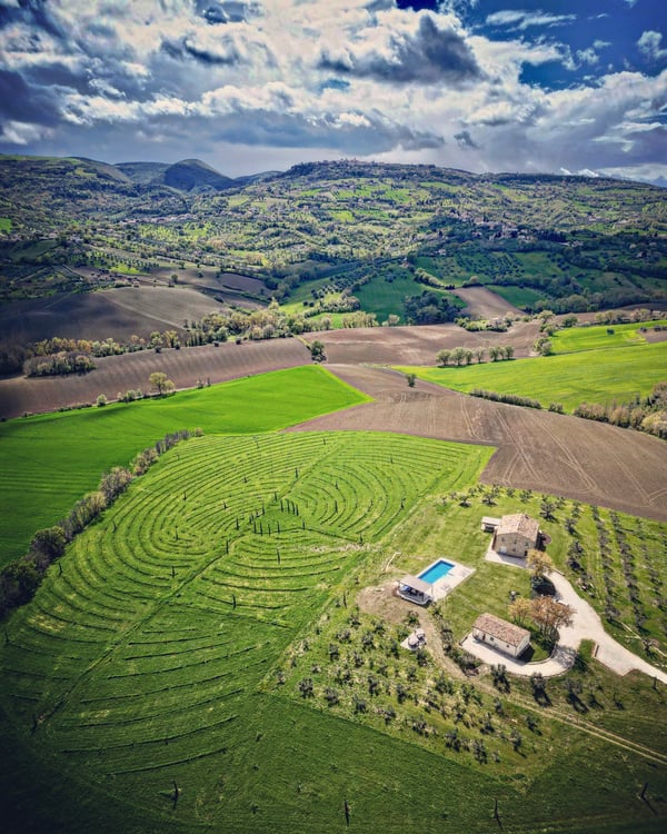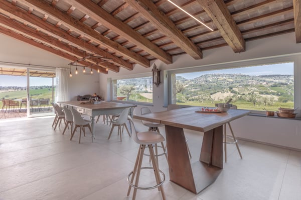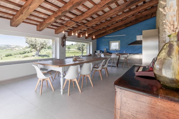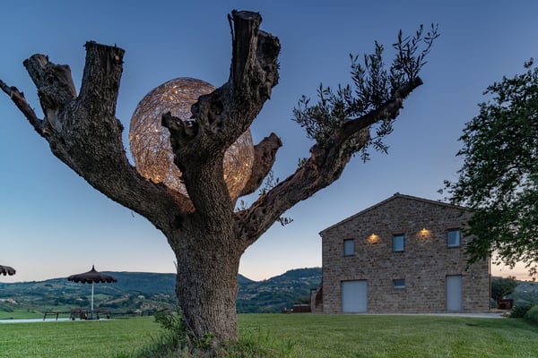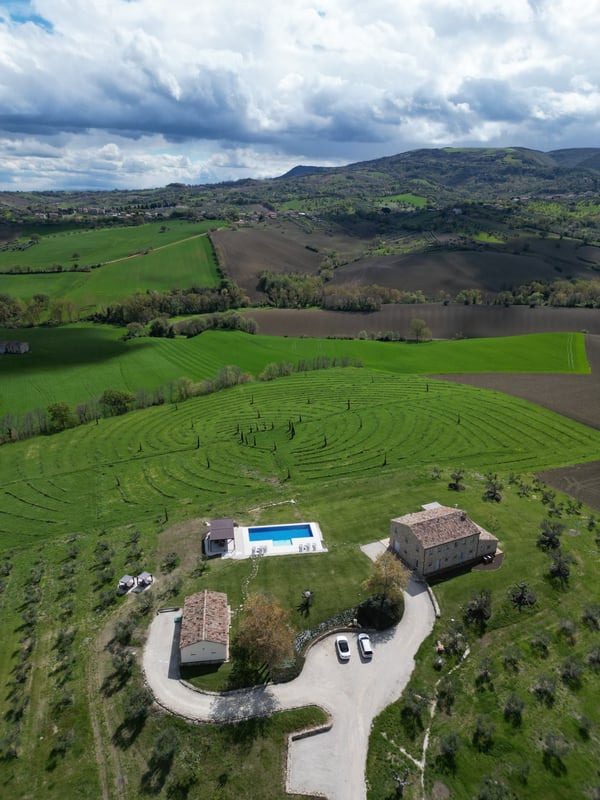 Villa ‘Casale Mignola’ has an unbelievable view in front of Cingoli with its sweet hills that change color each week. Nature surrounds the villa in the most absolute privacy with its almost 8 hectares of land where the olive grove is the master with 1200 plants of ‘mignola’ and 1000 planted with a satellite position generated from Fibonacci’s formula. Casale Mignola includes two parts, the main farmhouse and the pool home. The farmhouse has been completely rebuilt respecting the old standard of a typical Marche’s farmhouse. Casale Mignola is a fabulous, fully restored farmhouse, located at the top of hill in Cingoli, at the heart of the historic ‘Le Marche’ region. Cingoli is one of the oldest villages in Italy. A few kilometers from this old medieval village defined ‘the balcony of the Marche’, the old Farmhouse was restored into this luxurious villa. The villa is surrounded with luscious landscapes and vineyards. The Villa consists of 2 floors. Both the upper floor where the bedrooms are located, and on the ground floor the living space have spectacular views that the guests can enjoy day and night. Living in a noise-free farmhouse is a must, the farmhouse is located on a property of approximately 8 hectares. The sound of silence will accompany your reading of a book rather than your favorite song or simply your relaxation. Have you ever looked at the stars? Zero light pollution will allow you to appreciate an incredible starry sky in the evening, just turn off the external lighting of the farmhouse to find yourself in front of a breathtaking starry sky to share with your loved ones. A hydromassage with heated water in front of a unique landscape, during the day, or in the evening in total tranquillity and intimacy. Walking barefoot during the day in complete relaxation on a green lawn in front of the house rather than living an infinity pool with a small beach in front of a breathtaking landscape will complete these magical moments that only at the house you can live. A list of opportunities 'created by the property' and by those who run the house to live some of the countries in which time seems to have stopped, visits to wineries that will accompany you in the vineyards and thanks to which you can experience unforgettable tastings. An incredible sea with the towns of Portonovo, Sirolo, Numana and the beach of “Le due sorelle” 50 minutes by car rather than the experience of the caves of Frasassi. A living area that is a riot of bright interpenetration between interior and exterior with very large openings overlooking the landscape, almost as if the exteriors entered the house. A billiard room for moments of relaxation goliardic and a set of furniture ranging from antique furniture to modern design make the farmhouse open on the landscape of the Le Marche-Cingoli, a jewel of recovery. On the ground floor you will find a 50 square meters kitchen realized for the farmhouse in stainless steel 304 Italian design by “Ideal Cucine” equipped with Ariston professional appliances, an Ariston combo refrigerator freezer 2mt high, two Barbecue Hot point Ariston, a dishwasher and an Ariston cooking base. In the dining area you will find an ancient sartorial table, of 3.5mt length, coming from the North West area of Italy can accommodate 14 people. In front of the kitchen, a piece of design produced from the company “Elite To Be” can be used to cook or have breakfast in front of a faveolus view of the surrounding hills. On the centre of the stone wall recovered from the old house a suspending fireplace produced from Focus, you will find a piece of design whose design dates back to the 60s invented from Mr. Dominique Imbert and present to the Guggenheim museum in New York City. The sleeping area has four symmetrical double bedrooms that focus on the whiteness of the interior with some touches of colour related to the presence inside each of the bathrooms of resins of different shades of colour. The bedrooms will be an unforgettable experience, sleeping on 100-year-old bed , each bed is equipped with a special topper for the best sleeping and relaxing experience. Each bathroom is equipped with linen, towels, towel for shower , during winter and spring the bathroom is equipped with a bathrobe too to use in the heated pool outside the farmhouse. The property is completed in terms of hospitality, with an outbuilding, “dependence”, that takes advantage of the same renovation fees in which another couple can be accommodated. In order to make the house usable even on spring and autumn days a bioclimatic pergola with a heated pool equipped inside with hydromassage allow you to admire the surrounding landscape in an intimate and welcoming environment. This is Casale Mignola, a property of 8 hectares from which you can admire a wonderful breathtaking view, a charming farmhouse revisited with timeless finesse and design touches whose brightness', measure, balance and elegance will make you remain amaze. CIN: IT043012C2NS4YL5JV