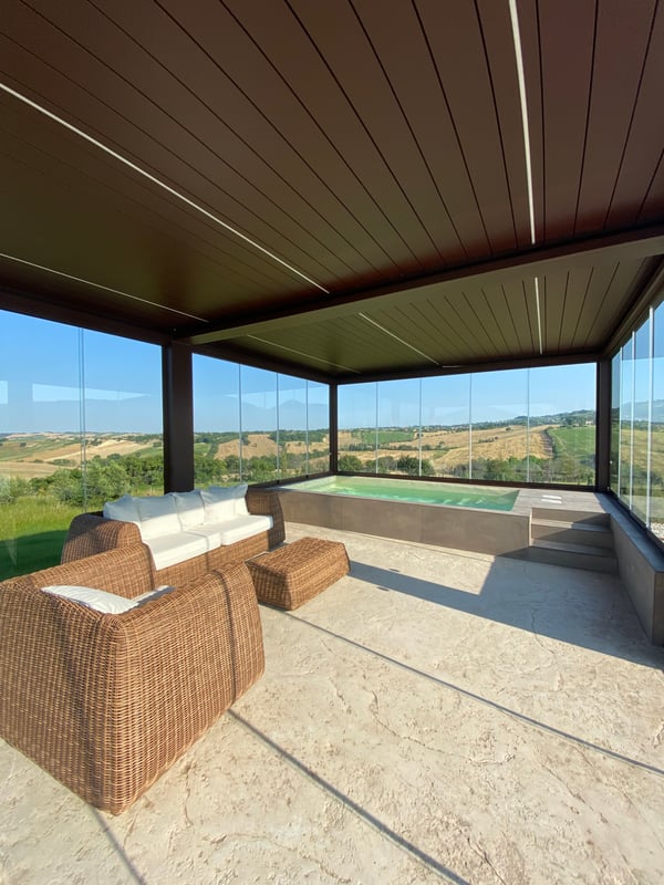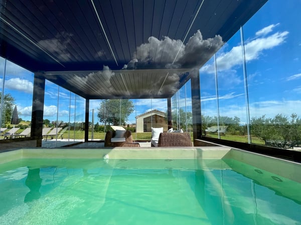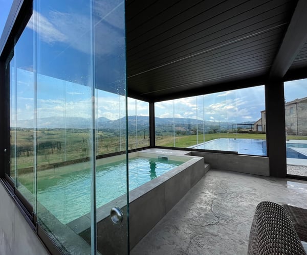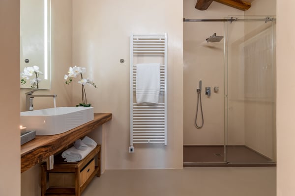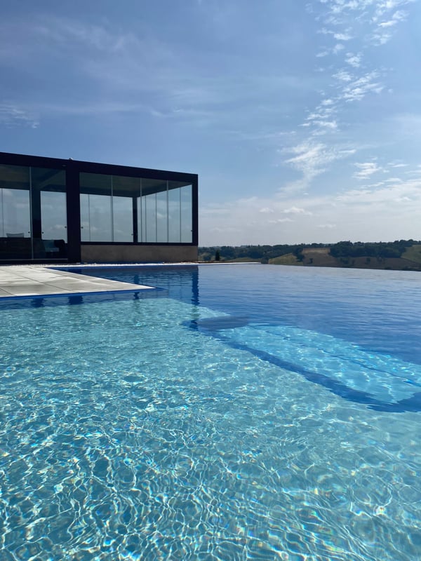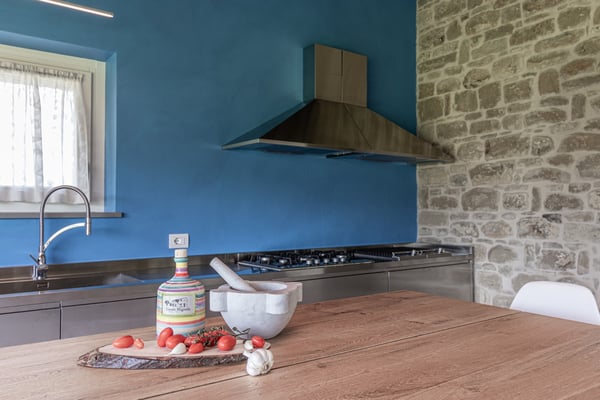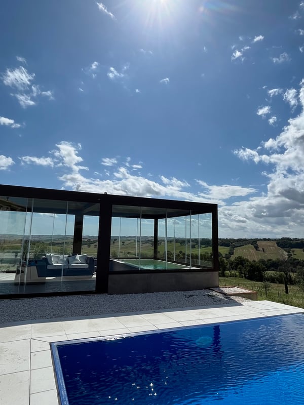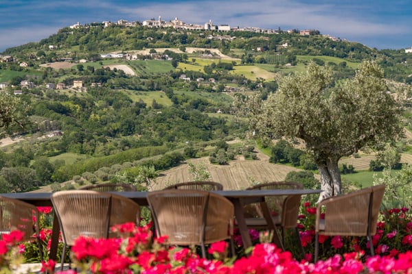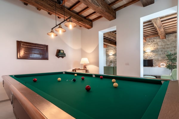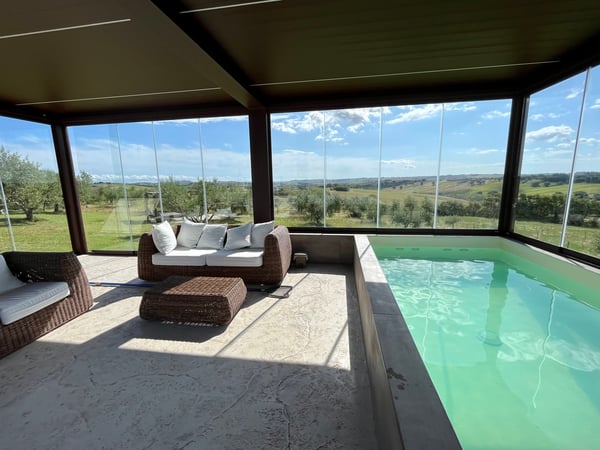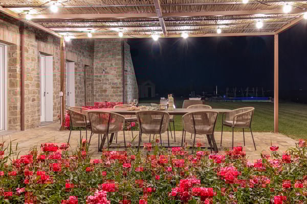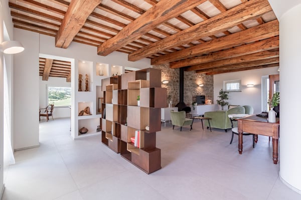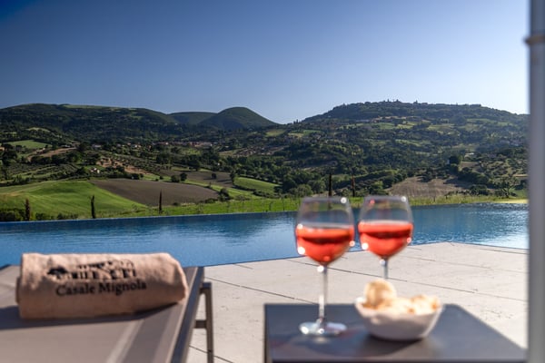 Villa ‘Casale Mignola’ has an unbelievable view in front of Cingoli with its sweet hills that change color each week. Nature surrounds the villa in the most absolute privacy with its almost 8 hectares of land where the olive grove is the master with 1200 plants of ‘mignola’ and 1000 planted with a satellite position generated from Fibonacci’s formula. Casale Mignola includes two parts, the main farmhouse and the pool home. The farmhouse has been completely rebuilt respecting the old standard of a typical Marche’s farmhouse. Casale Mignola is a fabulous, fully restored farmhouse, located at the top of hill in Cingoli, at the heart of the historic ‘Le Marche’ region. Cingoli is one of the oldest villages in Italy. A few kilometers from this old medieval village defined ‘the balcony of the Marche’, the old Farmhouse was restored into this luxurious villa. The villa is surrounded with luscious landscapes and vineyards. The Villa consists of 2 floors. Both the upper floor where the bedrooms are located, and on the ground floor the living space have spectacular views that the guests can enjoy day and night. Living in a noise-free farmhouse is a must, the farmhouse is located on a property of approximately 8 hectares. The sound of silence will accompany your reading of a book rather than your favorite song or simply your relaxation. Have you ever looked at the stars? Zero light pollution will allow you to appreciate an incredible starry sky in the evening, just turn off the external lighting of the farmhouse to find yourself in front of a breathtaking starry sky to share with your loved ones. A hydromassage with heated water in front of a unique landscape, during the day, or in the evening in total tranquillity and intimacy. Walking barefoot during the day in complete relaxation on a green lawn in front of the house rather than living an infinity pool with a small beach in front of a breathtaking landscape will complete these magical moments that only at the house you can live. A list of opportunities 'created by the property' and by those who run the house to live some of the countries in which time seems to have stopped, visits to wineries that will accompany you in the vineyards and thanks to which you can experience unforgettable tastings. An incredible sea with the towns of Portonovo, Sirolo, Numana and the beach of “Le due sorelle” 50 minutes by car rather than the experience of the caves of Frasassi. A living area that is a riot of bright interpenetration between interior and exterior with very large openings overlooking the landscape, almost as if the exteriors entered the house. A billiard room for moments of relaxation goliardic and a set of furniture ranging from antique furniture to modern design make the farmhouse open on the landscape of the Le Marche-Cingoli, a jewel of recovery. On the ground floor you will find a 50 square meters kitchen realized for the farmhouse in stainless steel 304 Italian design by “Ideal Cucine” equipped with Ariston professional appliances, an Ariston combo refrigerator freezer 2mt high, two Barbecue Hot point Ariston, a dishwasher and an Ariston cooking base. In the dining area you will find an ancient sartorial table, of 3.5mt length, coming from the North West area of Italy can accommodate 14 people. In front of the kitchen, a piece of design produced from the company “Elite To Be” can be used to cook or have breakfast in front of a faveolus view of the surrounding hills. On the centre of the stone wall recovered from the old house a suspending fireplace produced from Focus, you will find a piece of design whose design dates back to the 60s invented from Mr. Dominique Imbert and present to the Guggenheim museum in New York City. The sleeping area has four symmetrical double bedrooms that focus on the whiteness of the interior with some touches of colour related to the presence inside each of the bathrooms of resins of different shades of colour. The bedrooms will be an unforgettable experience, sleeping on 100-year-old bed , each bed is equipped with a special topper for the best sleeping and relaxing experience. Each bathroom is equipped with linen, towels, towel for shower , during winter and spring the bathroom is equipped with a bathrobe too to use in the heated pool outside the farmhouse. The property is completed in terms of hospitality, with an outbuilding, “dependence”, that takes advantage of the same renovation fees in which another couple can be accommodated. In order to make the house usable even on spring and autumn days a bioclimatic pergola with a heated pool equipped inside with hydromassage allow you to admire the surrounding landscape in an intimate and welcoming environment. This is Casale Mignola, a property of 8 hectares from which you can admire a wonderful breathtaking view, a charming farmhouse revisited with timeless finesse and design touches whose brightness', measure, balance and elegance will make you remain amaze. CIN: IT043012C2NS4YL5JV