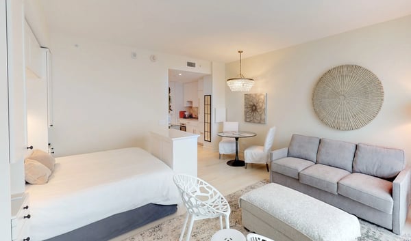 This luxe Seafire Residences studio presents an elegant getaway for choosy couples. Here, the interior design’s beauty rivals that of the Caribbean (which is on full display from your private, 5th-floor balcony!). Inside and out, this stunning studio is a feast for the eyes in Grand Cayman. Carrara marble in the kitchen and bath is just the beginning. Every design detail is carefully considered: built-in nightstands and bookshelf surround the king-size bed, and a click of a button slides the flat-screen TV into the footbed cabinet. A second flat-screen is mounted to the wall in front of the sofa; the sofa itself unfolds into a queen-size bed to sleep extra guests. A nearby chaise lounge in the living space sits before a floor-to-ceiling view of the sea. Crack open that book you’ve been meaning to read and sneak peeks at the sparkling water between chapters. Soothing tones of ivory, white and cream throughout bring the beauty of white-sand beaches inside. Plus, rest comes easy thanks to the downy king bed wrapped in sumptuous linens. Total relaxation continues when you wake up: your stay at the Seafire Residences includes a full menu of amenities, services, and resort perks to sample. Work up a sweat at the on-site fitness center. Take a dip in the inviting swimming pools. Towel off poolside while someone delivers your favorite cocktail. Then head to one of the Resort's on-site restaurants, or simply order room service to savor at your two-person bistro table.
