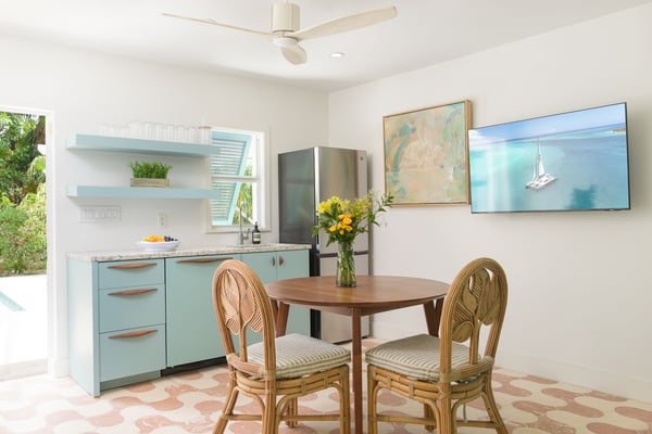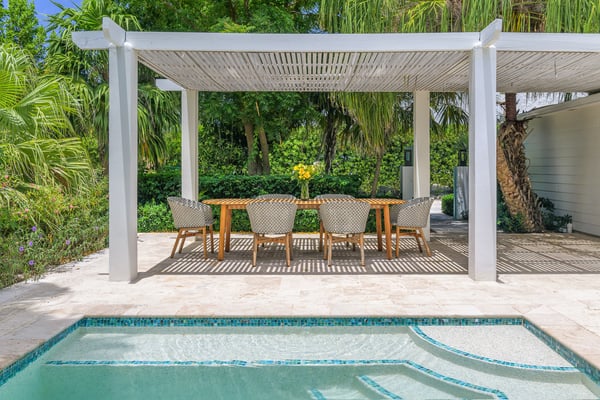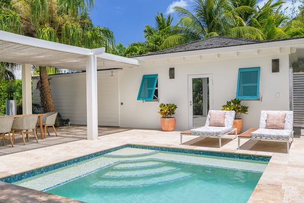 Villa Aquazure is a modern, recently renovated property that has the footprint of a property originally constructed in the 1980s, when setback laws to the ocean were not yet in place. This offers guests incredible proximity to the ocean. The main house has an open concept floor plan with a fully-equipped, beautiful kitchen, and a large dining room and living space that cleanly and conveniently opens up to the exterior ocean deck via large glass sliders. Grill on the shaded patio or venture towards the water and enjoy your oceanfront stay under a partially shaded open-air deck. Take a dip in the pool, lounge on plush furniture or dine next to the ocean. Private entrance, pool, pool loungers, outdoor dining area, king bed with garden view, kitchenette, central AC, ceiling fan, ensuite bathroom, and outdoor shower. Located just to the South of Leeward Point, the beach connects to Pelican Beach and ultimately Grace Bay Beach, an eleven-mile stretch of the best Turks and Caicos has to offer. Walk to the marina around the corner or set sail on one of the complimentary kayaks or paddle boards. Across the way, you will find Mangrove Cay and Iguana Island.
