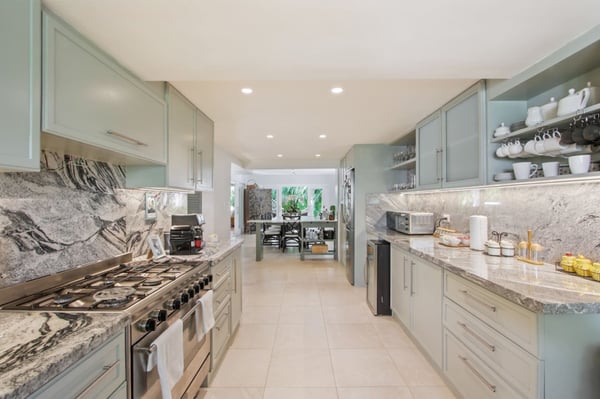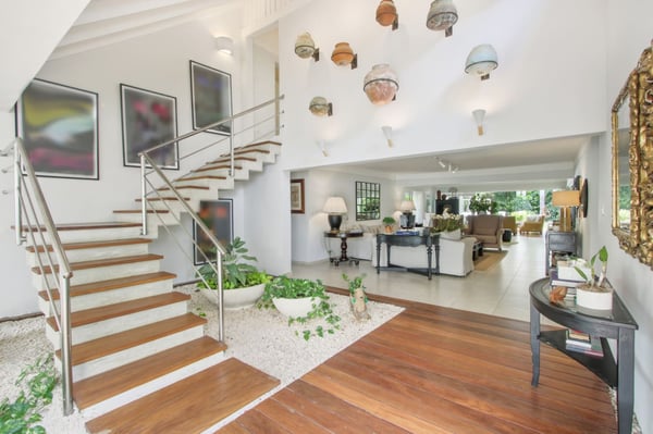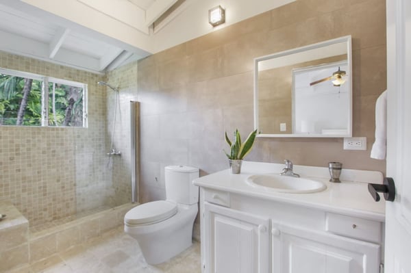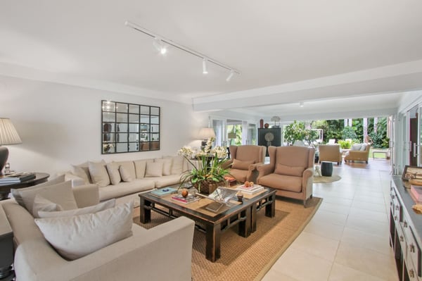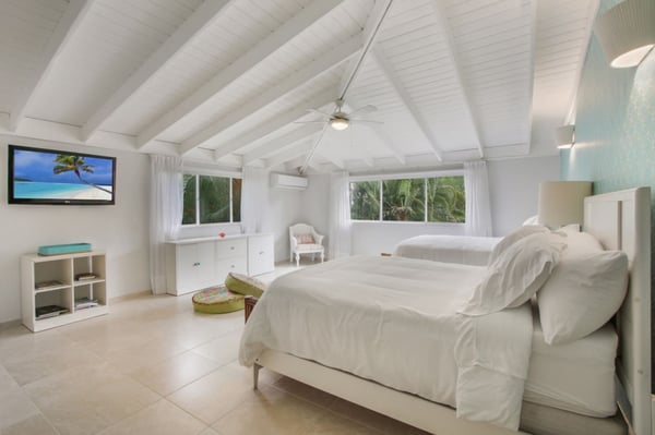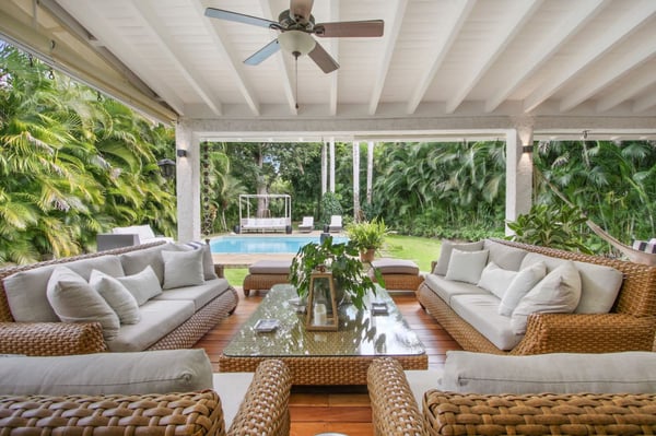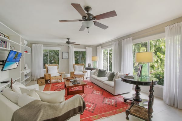 All guests must register with the Casa de Campo Concierge office, and for a small daily fee ($30 per adult per night & $15 per child per night), are granted access to resort areas and amenities. Casa de Campo Resort facilities and amenities include golf courses ($), the fitness centre ($), racquet center ($), restaurants ($) and bars ($). Contact Rental Escapes for more information about pricing. Palma Verde Retreat is a cozy 5-bedroom, 5 1/2 bath, 2-story villa that offers complete privacy and tranquility. The property is fully air-conditioned and also offers ceiling fans in 3 of the 5 bedrooms and on the terrace. When you enter the villa, the space welcomes you with a wonderful indoor-outdoor space that includes green garden areas, a wooden walkway, and plenty of natural light. Downstairs, you’ll find the living room with a comfortable sitting area, a separate TV room, the kitchen, an indoor dining room, and a guest bathroom. The décor of the villa is a mix of neutral and vibrant colors with lots of natural elements that create a relaxed and homelike atmosphere. From the living area, you have direct access to the terrace, garden, and pool area. The garden is completely enclosed with tropical palm trees, which provides a completely private oasis just for you. Enjoy the spacious outdoor area with a covered terrace, which has a comfortable sofa area and a separate outdoor dining area and BBQ. During the day, soak up the sun on one of the sun loungers by the pool, and whenever you need to cool off, simply take a dip in the inviting pool. For those lazy afternoons, take a nap in the hammock.