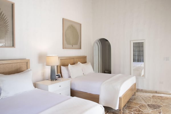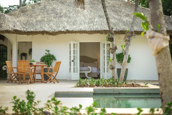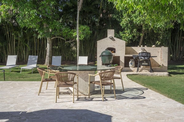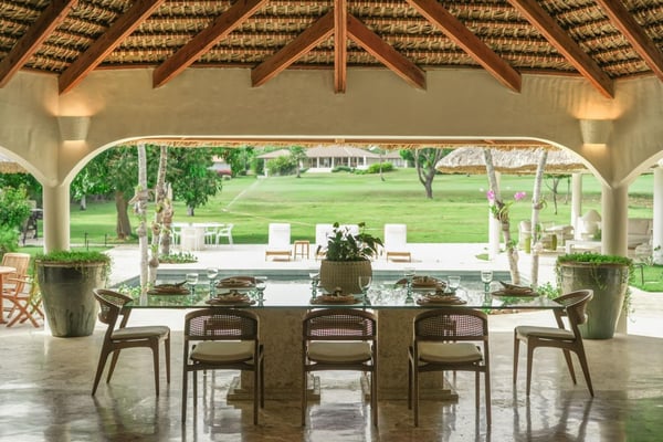 All guests must register with the Casa de Campo Concierge office, and for a small daily fee ($30 per adult per night & $15 per child per night), are granted access to resort areas and amenities. Casa de Campo Resort facilities and amenities include golf courses ($), the fitness centre ($), racquet center ($), restaurants ($) and bars ($). Contact Rental Escapes for more information about pricing. This beautifully remodeled villa is perfectly located just steps from Minitas Beach, Casa de Campo Resort’s exclusive private beach. Designed with tropical elegance in mind, the villa features spacious open living areas with cane roofs that allow natural light to flood the interiors, creating a warm and inviting ambiance. The layout seamlessly connects the central pool area with the indoor and outdoor spaces, offering a true Caribbean living experience. The open-concept living area includes a modern kitchen and an elegant dining room, ideal for family gatherings and entertaining. The villa is thoughtfully divided into two independent wings, each with two beautifully designed bedrooms, providing privacy and comfort for all guests. Outside, a charming gazebo overlooks the villa’s expansive back garden, which blends harmoniously with the lush green landscape of the golf course. This outdoor oasis is perfect for alfresco dining, relaxing, or simply soaking in the tranquil surroundings.