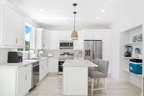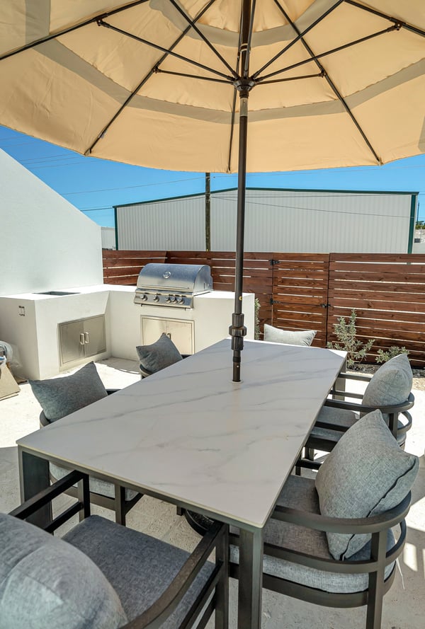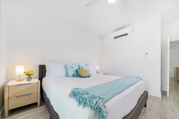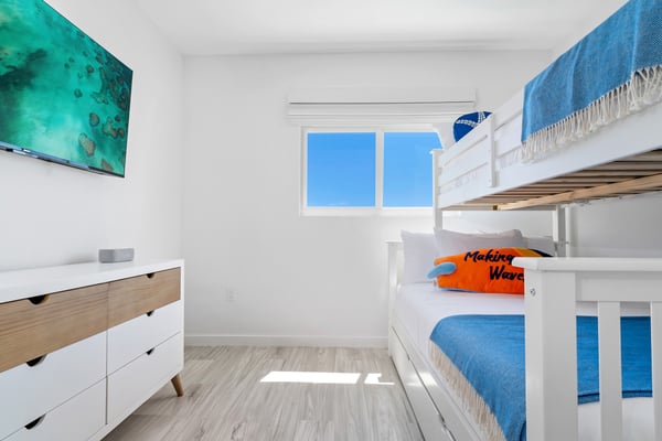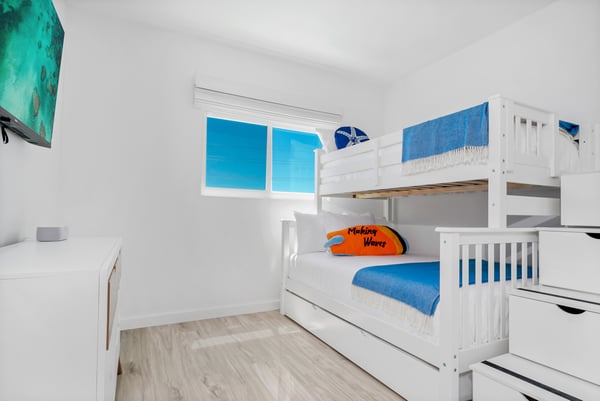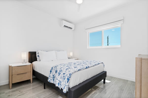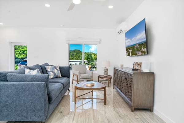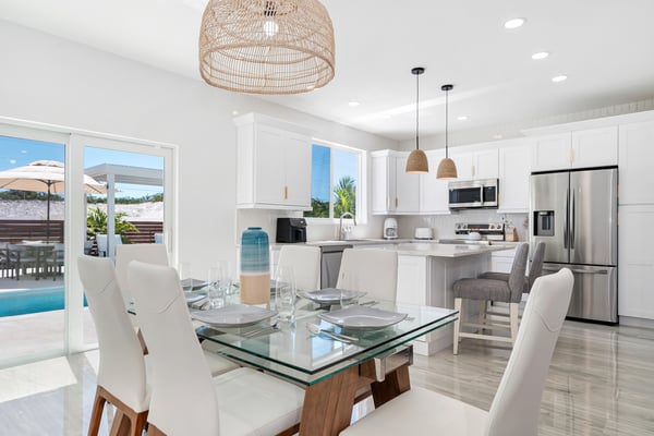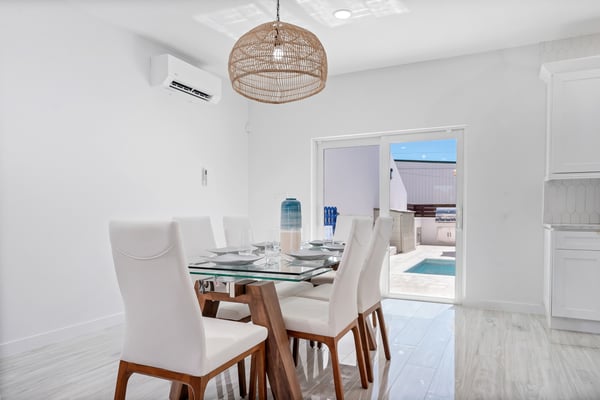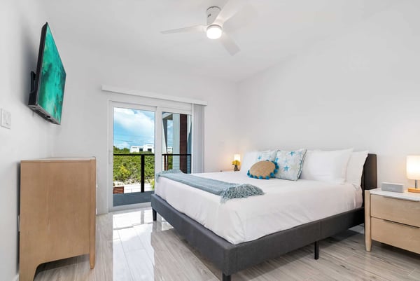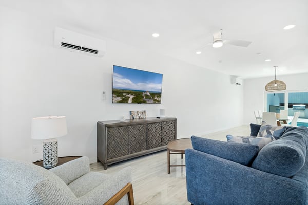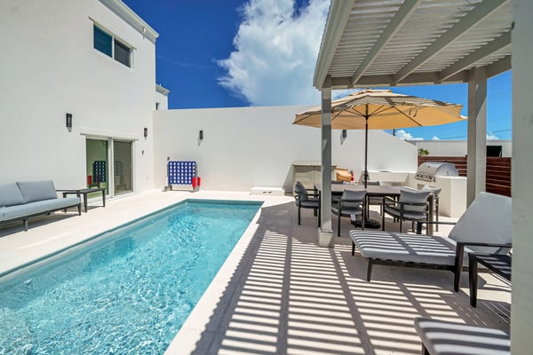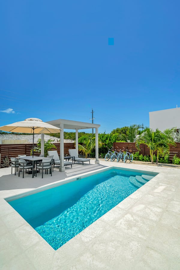 Villa Aria is a modern 3-bedroom, 2.5-bathroom villa located in the heart of Grace Bay, offering an ideal blend of luxury and convenience. This stunning villa is just a short walk from Grace Bay Beach, consistently ranked among the best in the world for its powdery white sand and crystal-clear water. Guests can easily explore nearby attractions, including popular restaurants, shopping plazas, and casinos. Use the provided bicycles to explore the vibrant Grace Bay Strip or pack the included beach chairs, umbrellas, cooler, and towels for a day at any of Providenciales’ breathtaking beaches. Villa Aria also offers exclusive discounts on E-bike rentals and car rentals through select local vendors, making it easy to get around the island. On the first floor, you’ll find a spacious, fully equipped kitchen with brand-new appliances, an island, and an intimate dining table for six—perfect for preparing and enjoying gourmet meals together. Adjacent to the kitchen is a large living room featuring a comfortable sectional sofa, a 55-inch flat-screen smart TV, and a Sonos sound system. Also on the first floor is a convenient half-bathroom and a washer/dryer combo for guest use. All three bedrooms are located on the second floor. At the top of the stairs, the master suite awaits with a king-sized bed, a 42-inch wall-mounted flat-screen TV, a spacious closet, and an en-suite bathroom featuring a walk-in glass shower and a vanity with a smart mirror. The primary bedroom is also equipped with a ceiling fan and a split-unit AC for maximum comfort. Across the landing, you’ll find two additional guest bedrooms. The first offers a bunk bed with a queen bed on the bottom and a single bed on top, along with a wall-mounted TV, ceiling fan, and split-unit AC. The second guest bedroom features a king bed, a spacious closet (with a safe), a wall-mounted flat-screen TV, a ceiling fan, and split-unit AC. Both guest bedrooms share a modern bathroom at the end of the hall. Outside, the villa’s beautifully landscaped exterior is just as impressive as the interior. The private deck boasts a pool with chaise loungers, a sectional outdoor sofa with a fire pit, and a state-of-the-art pavilion-covered BBQ area. An additional outdoor dining table makes it easy to enjoy dinner under the stars. Guests will also find bicycles, beach chairs, and umbrellas available for use. This vacation home is spacious, comfortable, and perfect for small families or groups of friends looking for a private escape while still being within walking distance of Grace Bay’s world-renowned amenities.
