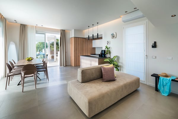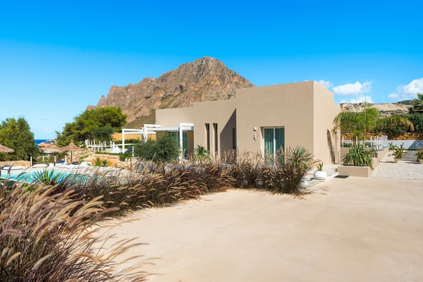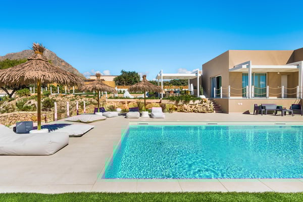 Castalia is a stunning villa with swimming pool and wellness area, located in Cornino, a renowned seaside resort near Trapani, Erice and San Vito Lo Capo. Located along one of the streets leading from Custonaci to the sea, this exclusive residence is surrounded by a sizeable and well-kept garden with eco-lawn, embellished by a stunning swimming pool with solarium, hot tub and panoramic terraces from which you can enjoy enchanting views of Mount Cofano and the sea. The villa, split over two levels, offers cosy and well-divided interiors, furnished with particular care and attention to materials and finishes. The raised ground floor includes a spacious living area with kitchen, a bathroom and two comfortable bedrooms with queen-size beds and bathroom with shower. On the lower floor are two additional bedrooms with bathroom-shower and the exclusive wellness area comprised of an indoor heated pool with waterfall and hydromassage area, sauna, Turkish bath, emotional shower, herbal tea station, relaxation area, massage room and two bathrooms. The residence is even equipped with air-conditioning in all rooms, Wi-Fi, 6 Smart TVs, washing machine, dryer, dishwasher, electric oven and microwave, espresso machine and American coffee maker, water purifier, ice machine, barbecue area and private parking. Ideal for savouring comfortable and relaxing holidays at any time of the year, Castalia is an excellent base for visiting interesting nearby towns such as Erice, Trapani, Marsala, the Egadi Islands, the Riserva dello Zingaro and the archaeological sites of Segesta, Mothia and Selinunte. CIN: IT081007C2R5IOHC75