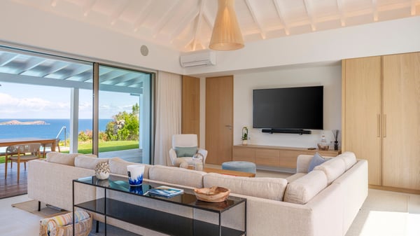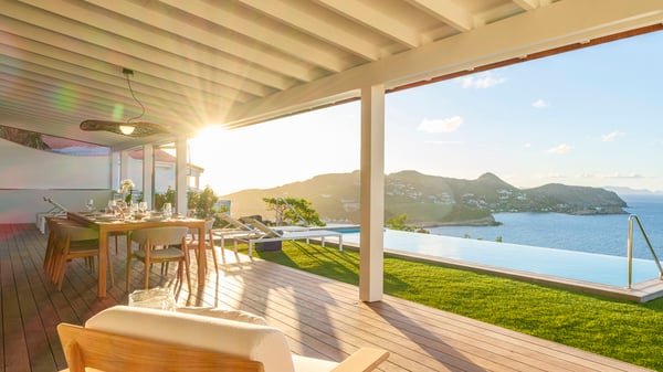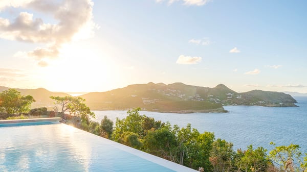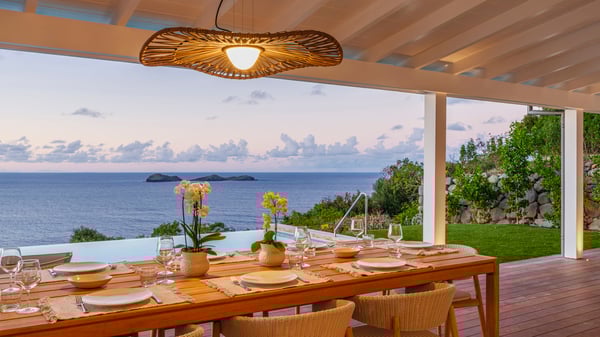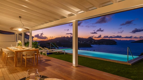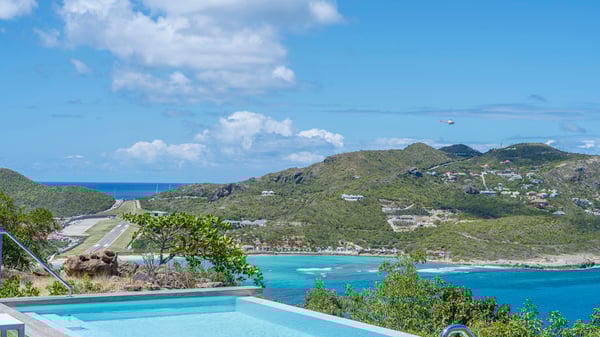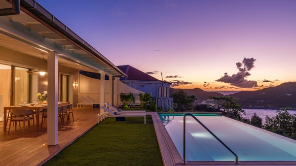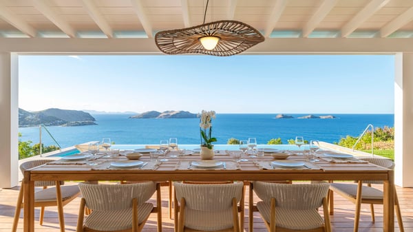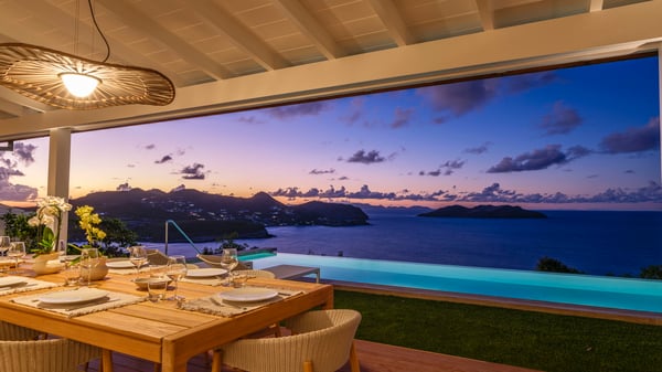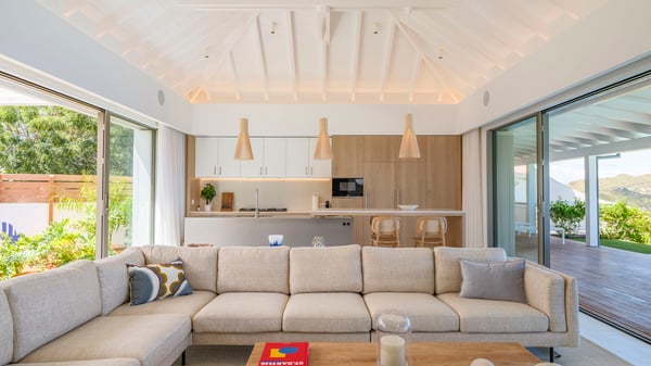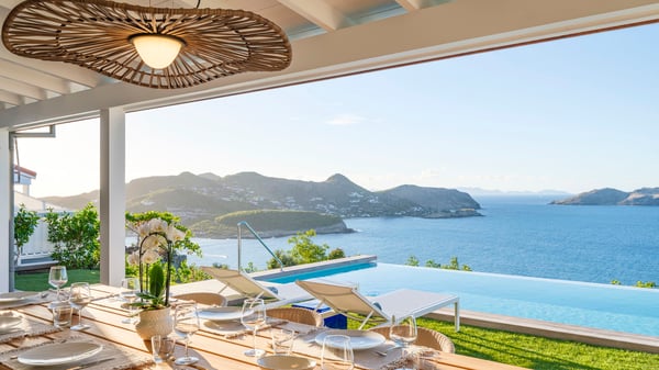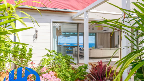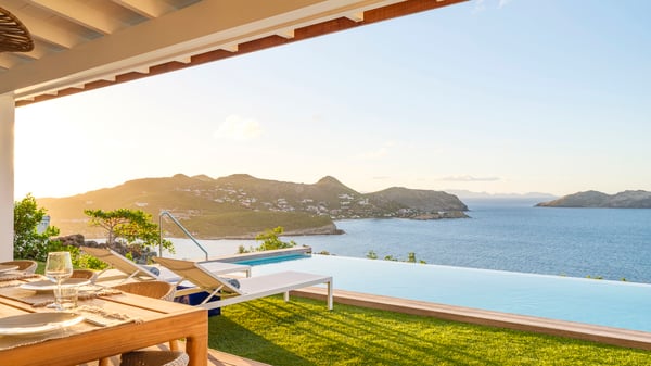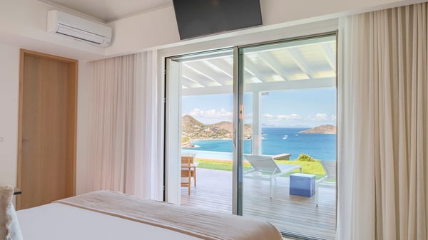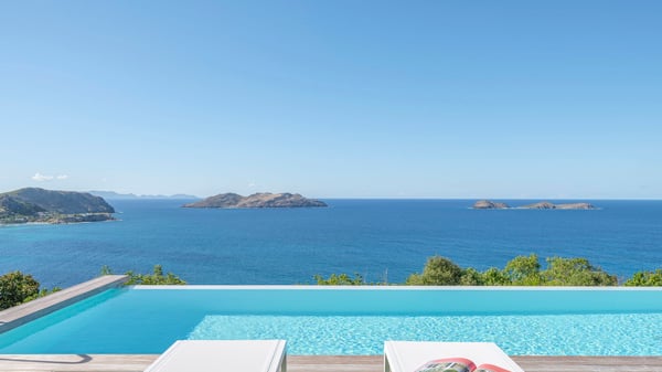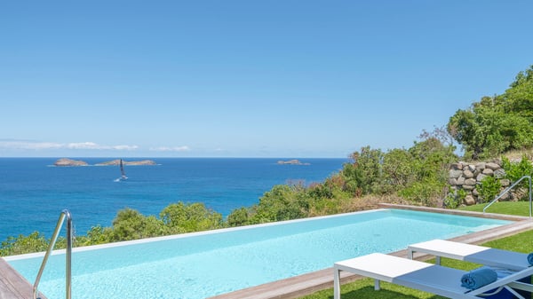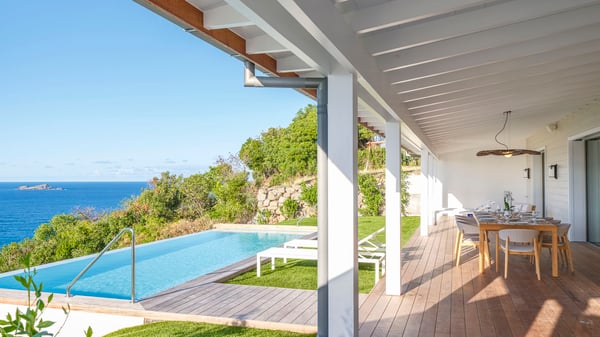 The vacation rental Indigo is a beautiful three-bedroom property with a pool, ideally located in St-Jean, facing a breathtakingly beautiful view over the ocean and Lorient Bay. Modern and bright, this holiday home provides luxurious amenities in utmost comfort. Elegant and refined, the villa rental Indigo is the perfect place for a fantastic stay for up to six guests in St-Barts. Designed on one level, Villa Indigo opens onto a magnificent panorama over the ocean, the sunset, the neighboring islets, St-Jean airport, and the rolling hills. Fully open onto the sunny terrace, the living room is comfortably furnished with a large L-shaped sofa under the vaulted ceiling, creating a cozy ambiance. Nearby, you’ll find the fully equipped kitchen, featuring a breakfast bar and stools to talk over a coffee. The lounge also opens onto the back, adorned with a lovely, fresh, romantic lawn and a pergola, an ideal spot to relax in St-Barts' soothing tranquillity. At the front, Villa Indigo's inviting terrace welcomes you around its splendid infinity swimming pool glistening under the island’s sun. There are lounge chairs facing the view, perfect for delightful moments of relaxation or sipping cocktails, marveling at the sunset in a very private atmosphere. You’ll also love dining al fresco under the covered part of the terrace around the table for eight guests, enjoying the gentle trade winds that softly blow on the island. Romantic and elegant, the terrace of Villa Indigo seamlessly combines modern design with soft, light hues, with a touch of Caribbean inspiration, featuring wood accents and fine weaving. The villa rental Indigo consists of three air-conditioned bedrooms with en-suite bathrooms. Two of them open onto the terrace with ocean views, while the third one is located at the back of the living room, accessible via the pergola leading to the lounge. Light wood, beige tones, TVs, and direct terrace access make these cozy bedrooms true havens of well-being to quietly unwind in Caribbean beauty. Nestled in the lush nature of St-Barts, villa Indigo, with its breathtaking ocean view, is the dream destination for a dream family or friends' getaway in the Caribbean.