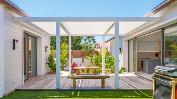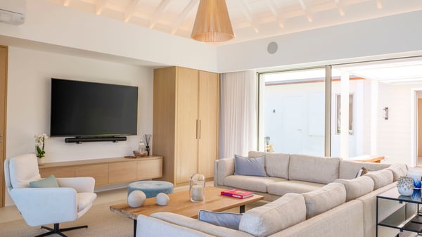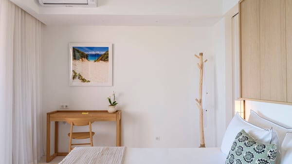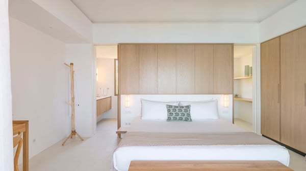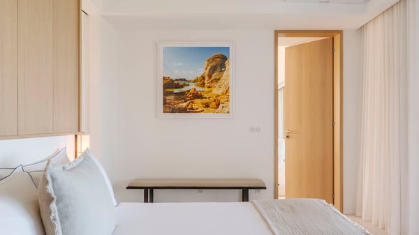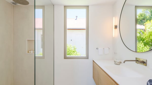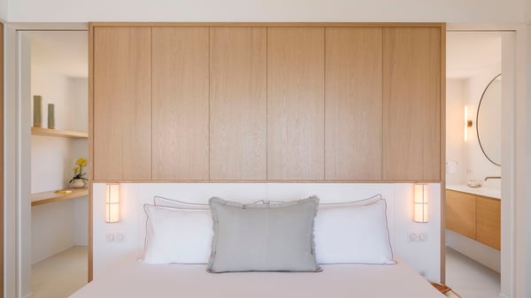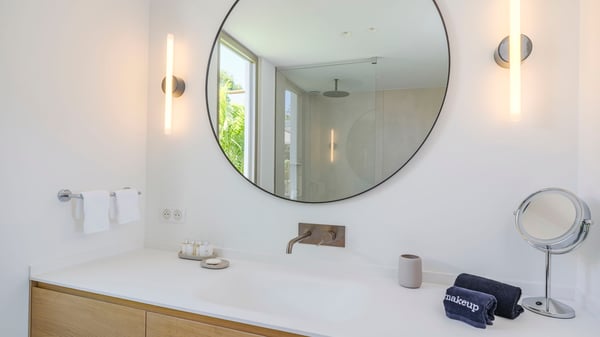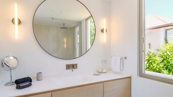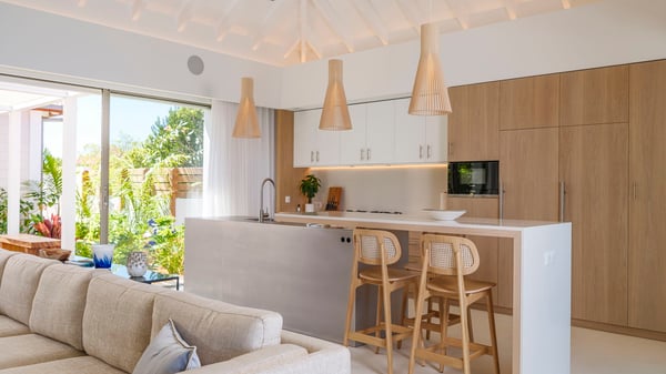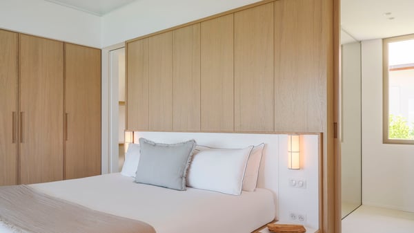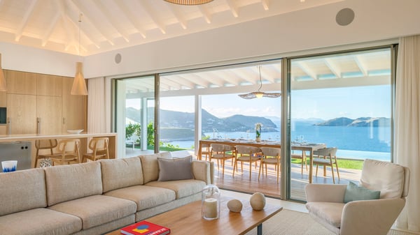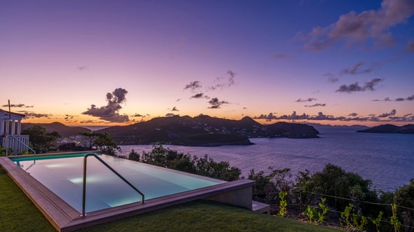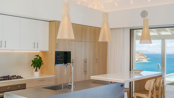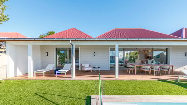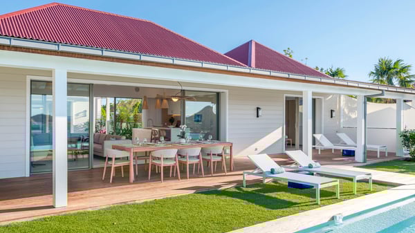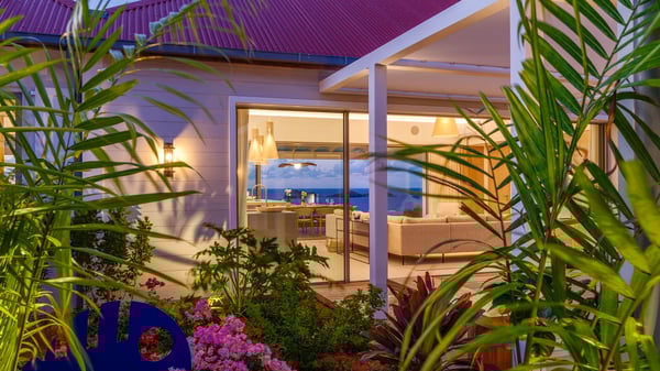 The vacation rental Indigo is a beautiful three-bedroom property with a pool, ideally located in St-Jean, facing a breathtakingly beautiful view over the ocean and Lorient Bay. Modern and bright, this holiday home provides luxurious amenities in utmost comfort. Elegant and refined, the villa rental Indigo is the perfect place for a fantastic stay for up to six guests in St-Barts. Designed on one level, Villa Indigo opens onto a magnificent panorama over the ocean, the sunset, the neighboring islets, St-Jean airport, and the rolling hills. Fully open onto the sunny terrace, the living room is comfortably furnished with a large L-shaped sofa under the vaulted ceiling, creating a cozy ambiance. Nearby, you’ll find the fully equipped kitchen, featuring a breakfast bar and stools to talk over a coffee. The lounge also opens onto the back, adorned with a lovely, fresh, romantic lawn and a pergola, an ideal spot to relax in St-Barts' soothing tranquillity. At the front, Villa Indigo's inviting terrace welcomes you around its splendid infinity swimming pool glistening under the island’s sun. There are lounge chairs facing the view, perfect for delightful moments of relaxation or sipping cocktails, marveling at the sunset in a very private atmosphere. You’ll also love dining al fresco under the covered part of the terrace around the table for eight guests, enjoying the gentle trade winds that softly blow on the island. Romantic and elegant, the terrace of Villa Indigo seamlessly combines modern design with soft, light hues, with a touch of Caribbean inspiration, featuring wood accents and fine weaving. The villa rental Indigo consists of three air-conditioned bedrooms with en-suite bathrooms. Two of them open onto the terrace with ocean views, while the third one is located at the back of the living room, accessible via the pergola leading to the lounge. Light wood, beige tones, TVs, and direct terrace access make these cozy bedrooms true havens of well-being to quietly unwind in Caribbean beauty. Nestled in the lush nature of St-Barts, villa Indigo, with its breathtaking ocean view, is the dream destination for a dream family or friends' getaway in the Caribbean.