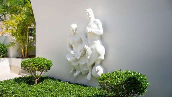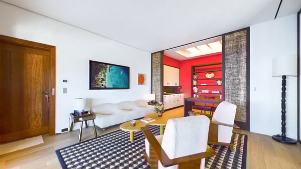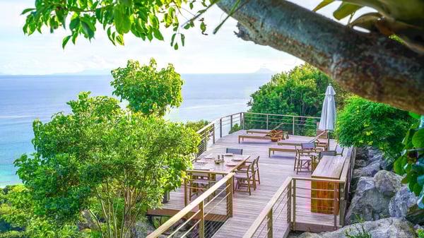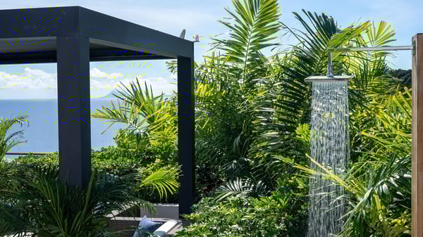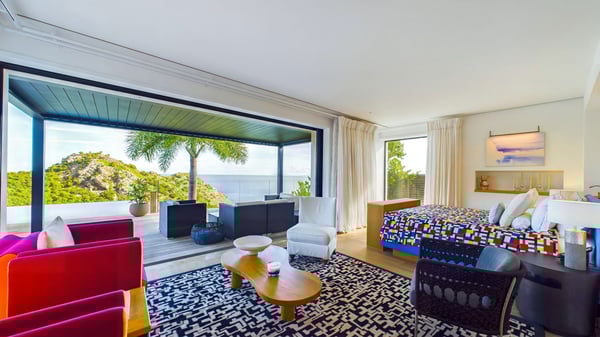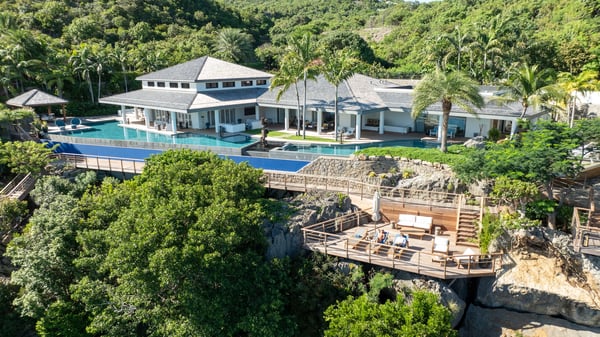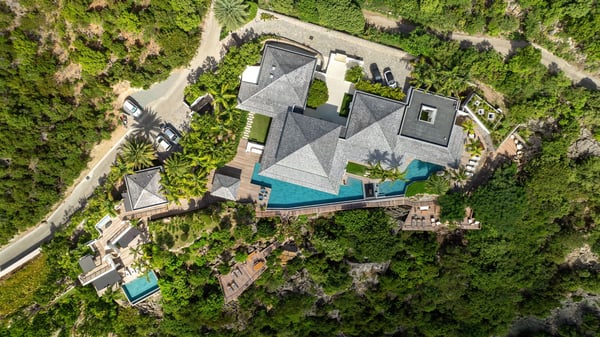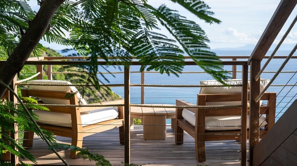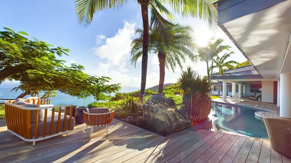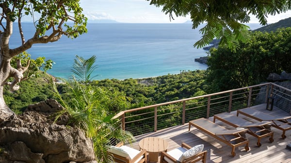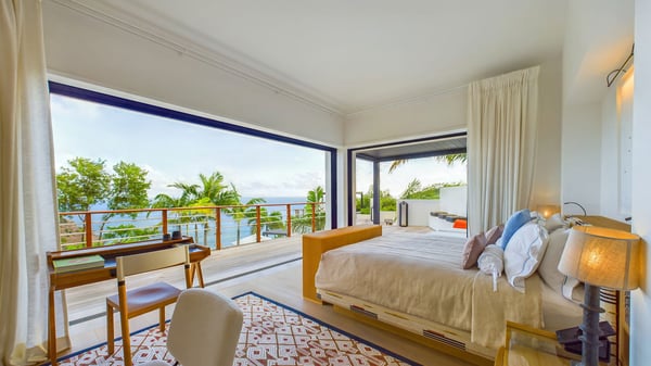 Villa St-Barths Amitie is a sumptuous property located in Gouverneur, facing a splendid view over the bay. Composed of five bedrooms, two swimming pools, a fitness room, and a massage space, this luxury villa offers high-end amenities in an exceptional setting. Ideally positioned facing the ocean, Villa Amitie is the perfect place for a dream stay in the Caribbean for up to ten guests. Designed across two buildings and several levels, the villa St-Barths Amitie provides a majestic setting for a unique vacation in a very private atmosphere. The spacious living room is furnished with comfortable cream-colored sofas accented in red, beneath the magnificent vaulted ceiling with exposed beams. The professional kitchen is spacious and fully equipped, ideal for welcoming the services of a private chef (please contact our concierge service). You’ll love enjoying your meals on the outdoor terrace beside the villa, in the gentle trade winds that blow across the island. Between beauty and serenity, villa Amitie opens onto a strikingly beautiful panorama. At the front of Villa Amitie, the vast terrace features a magnificent swimming pool that follows the lines of the villa’s architecture, running along the façade and offering a divine sensation of freshness and beauty. There are outdoor lounges, sunbeds and tall palm trees, creating a delightful ambiance under the St-Barths sun. Below, you’ll find a charming terrace offering a peaceful retreat, the perfect spot for admiring the island’s stunning landscapes. A shaded ajoupa with an al fresco dining table is also set up on the deck. The second pool is located in front of the other building, offering a serene haven where you’ll relax, marveling at the spectacular views. Villa Amitie consists of five superb air-conditioned bedrooms with televisions, en-suite bathrooms and king-size beds, two of which can be converted into twins. The two primary bedrooms are located in the main building, while the other three are in the second building, including one on the upper level. All bedrooms are ultra-luxurious, spacious, and they feature sitting areas with sofas, armchairs or desks. A fitness room and a comfy massage space are also available throughout your stay. Facing a stunningly beautiful ocean view, villa St-Barths Amitie welcomes guests into a fantastic setting for a dream ten-person stay in the heart of the Caribbean.