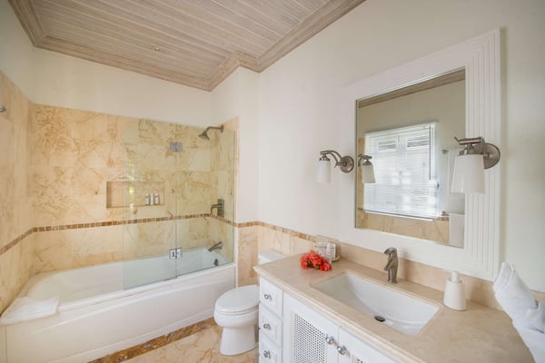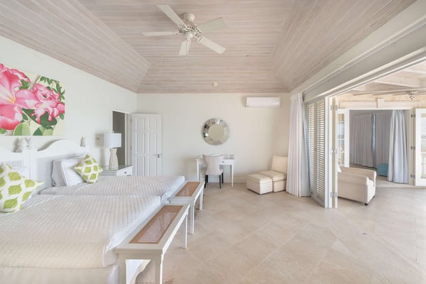 Please note the beach experiences seasonal fluctuations in its accessibility. Westhaven, a luxurious beachfront vacation rental, is gently lapped by calm waters from Gibbes Beach on the West Coast of Barbados. A mere 5 minutes away is the historic little town of Speightstown, with the most delightful and casual restaurants tempting visitors with their authentic Caribbean cuisine and sea vistas. Don’t forget to check out the Gallery of Caribbean Art and Arlington House, a'must-see' interactive museum with audio-visual features of 'Old Barbados'. Lush gardens usher you through a gateway opening onto the pool deck with a gorgeous view of the sea. The shimmering pool is surrounded by sun loungers with a trickling water feature in tune with the soothing sounds of washing waves. Loungers can be taken down to the seashore through the private direct access to the beach. Serene, crystal-clear waters beckon you to swim, snorkel, and take advantage of several water sports activities. Gibbes Beach meets Mullins Beach to the north, allowing for romantic strolls or brisk walks. For entertainment, the comfortable living room on the ground floor is outfitted with a flat-screen television, complete with cable. This area opens onto the expansive patio—just the spot for sipping cocktails while admiring a superb sunset. The kitchen’s large window opens outwards to the dining area, making it convenient to serve meals, snacks, and refreshing beverages throughout the day. Even partake of a scrumptious meal on the pool deck al fresco, prepared by the villa’s chef. The bedrooms, which have outdoor patios, air conditioning, and en suite bathrooms, are all located on the first floor, except for one situated on the ground level. The master, also equipped with cable television, and 2nd bedroom suite share a balcony overlooking a magnificent view of Gibbes Bay. The smaller balconies of the third and fourth bedrooms offer lovely views of the garden.