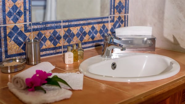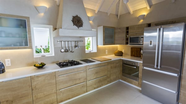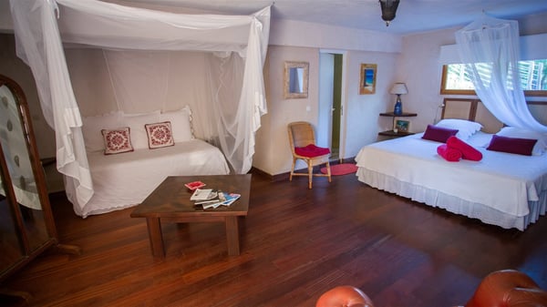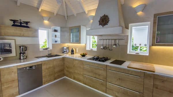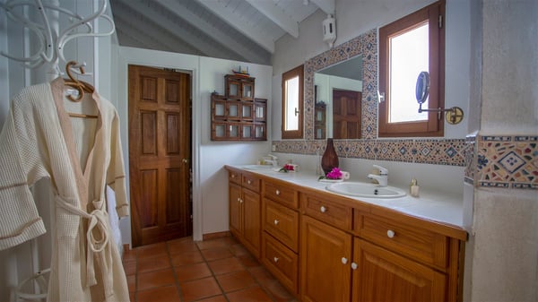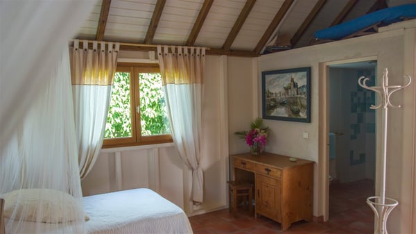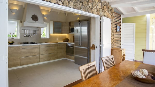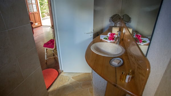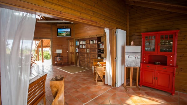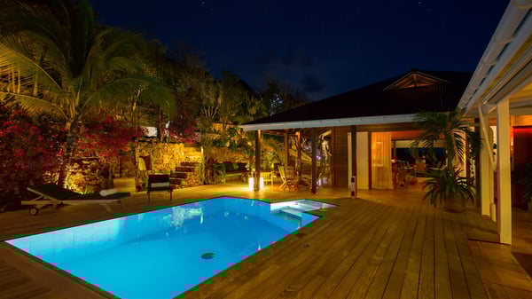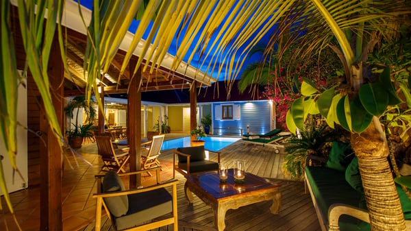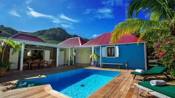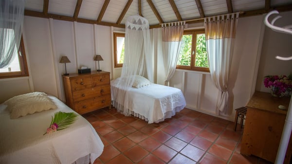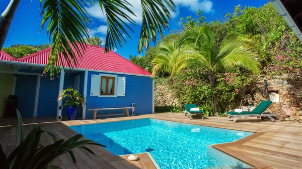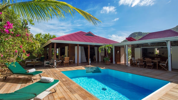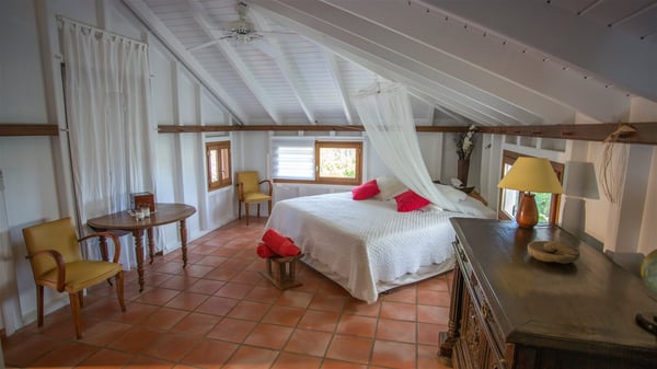 Nestled in the heights of Grand Fond, the charming rental villa Apiano is a four-bedroom property with a beautiful view over the Grand Fond valley and the sparkling ocean in the distance. Set in the heart of the lush tropical vegetation, villa Apiano is a true paradise for an unforgettable stay in St-Barths. The Caribbean-style villa Apiano is built on typical architecture with several bungalows and bright colours around a central terrace. The decor is warm and furnished with carved and sculpted wooden furniture. The comfortable living room welcomes guests around a majestic grand piano that music lovers will marvel at. Sofas, armchairs, cushions and silky fabrics dress this very cozy space coming with wainscotted walls. The terracotta-coloured tile floor brings a pleasant feeling of comfort. The kitchen is large and spacious, with all the necessary equipment to prepare delicious meals to be enjoyed around the large rectangular wooden table for eight guests under the covered terrace, which you can access through a large opening from the living room. Outside, the Caribbean-style terrace is a true haven of peace and beauty: comfortable seating, a stone garden setting, nice shrubs, palm trees, lounge chairs under the covered terrace, an oval-shaped coffee table, a pleasant hammock, and dark green cushions in the vegetal environment. There is a lovely swimming pool located in the center of the terrace, for delightful moments of relaxation under St-Barths’ sun in this very private and idyllic scenery. The view over the green hills and the deep blue ocean is breathtakingly beautiful, and you will feel as if you were alone in the world in this green setting, gently lulled by the charm of the Caribbean. Villa Apiano welcomes you and your guests in four beautiful air-conditioned rooms all over the property. Three of them are furnished with king-size beds, and the fourth one has twin beds that can be converted into a king. All bedrooms are en-suite and are decorated with soft sheers and characterful Caribbean-style furniture. The lovely views over the green garden make the dream of an unforgettable stay in a beautiful haven come true.