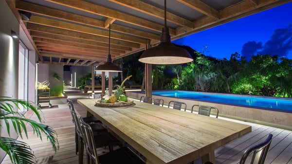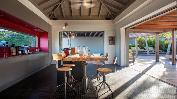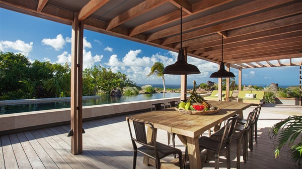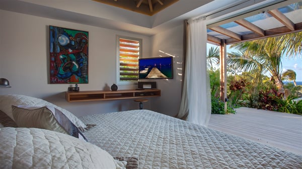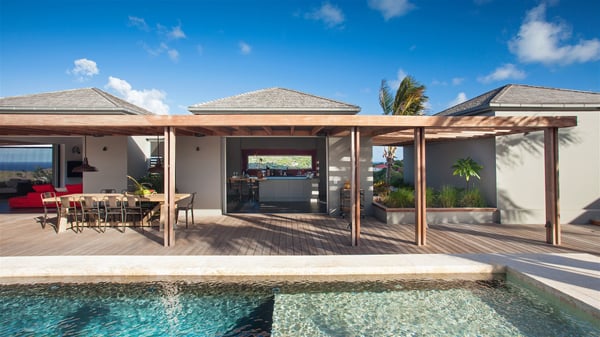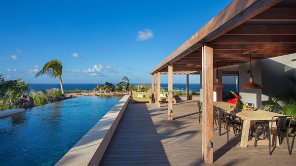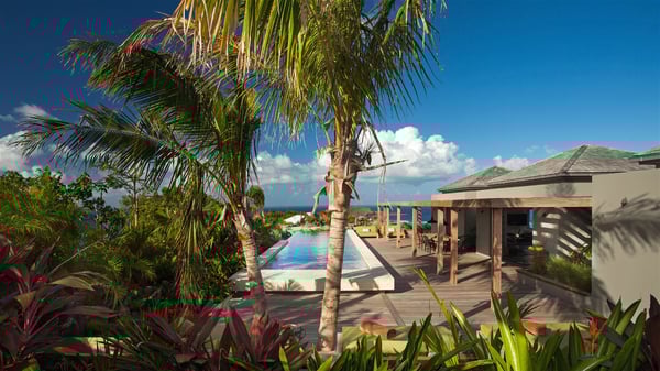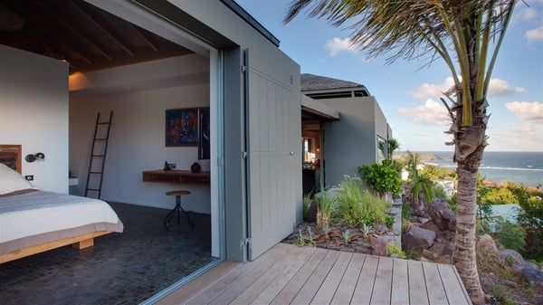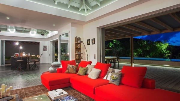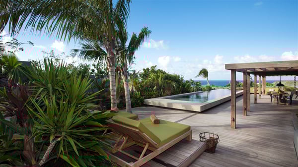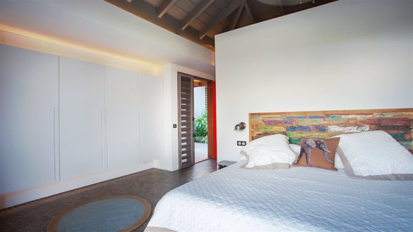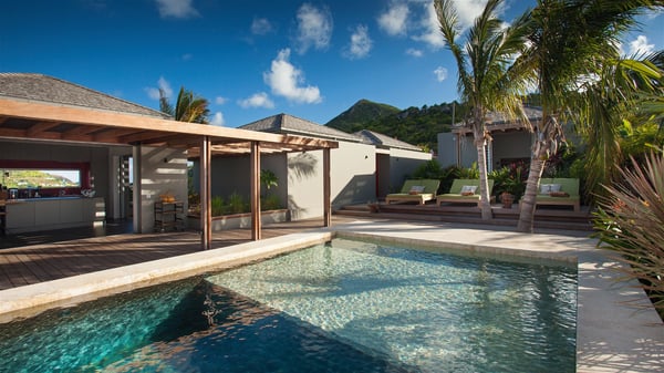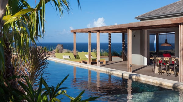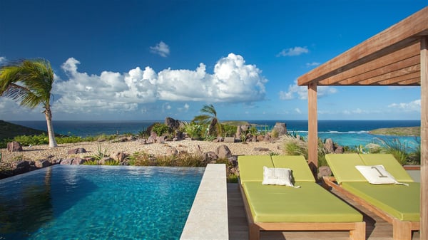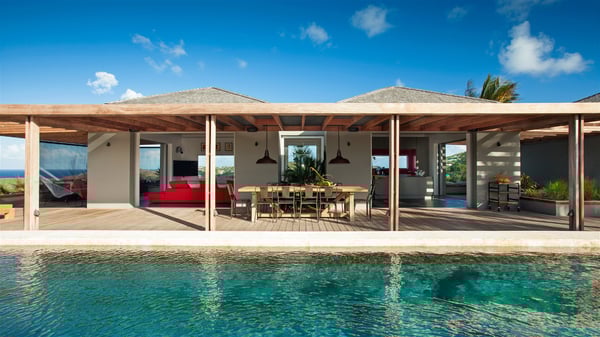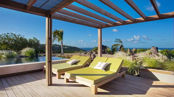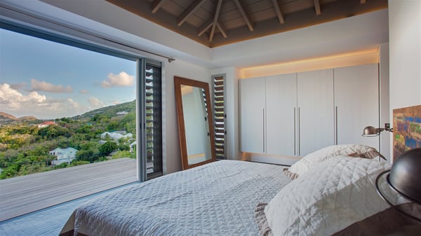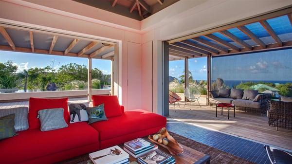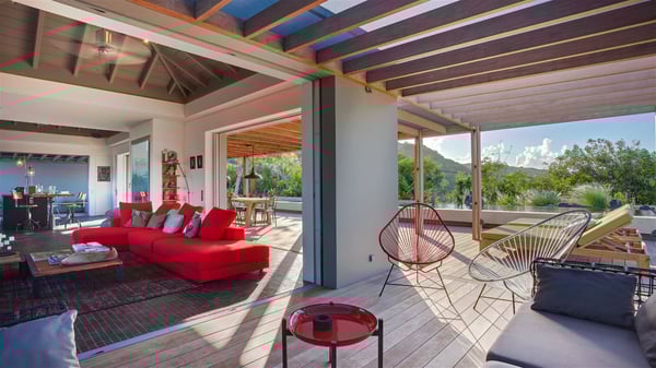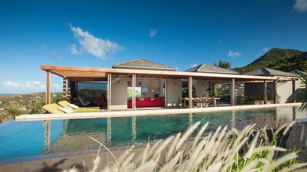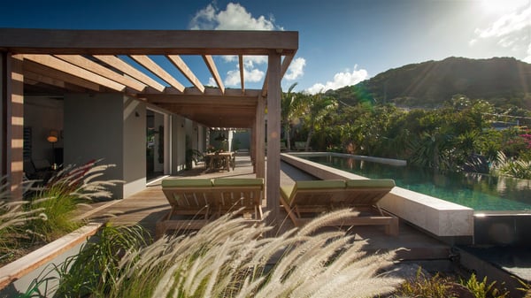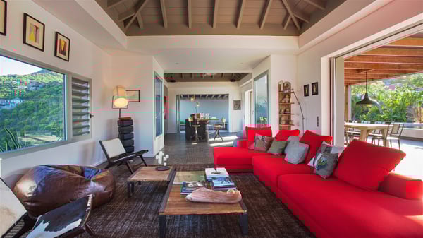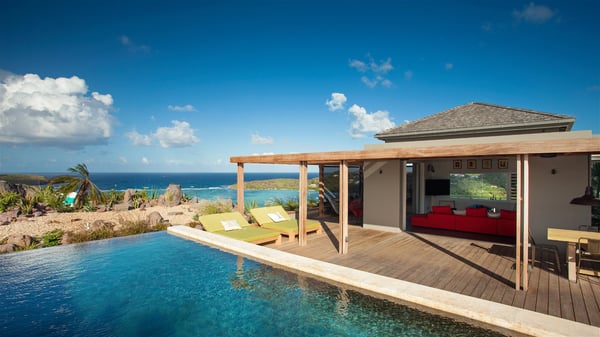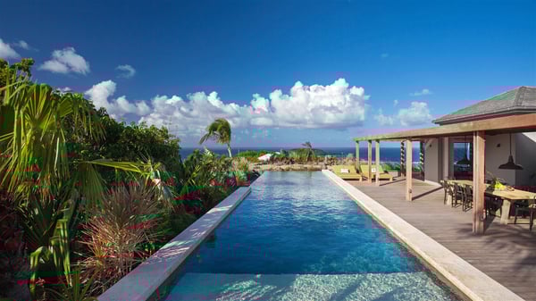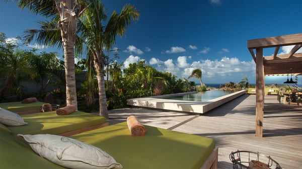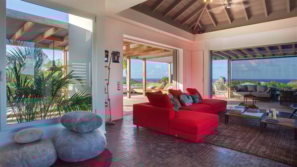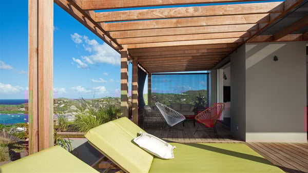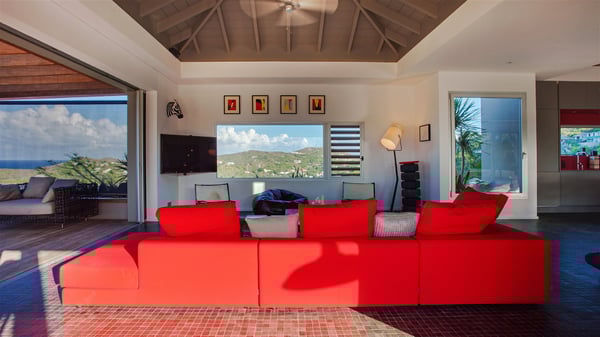 Villa Imagine is a luxurious three-bedroom property located on the heights of Marigot, with a splendid view over the Grand-Cul-de-Sac lagoon. It features a long swimming pool and a sunny deck surrounded by lush vegetation, the best place to welcome groups of up to six people in the tropical beauty of the Caribbean hills. Built on one level over three buildings, villa Imagine offers a stunning view over the turquoise waters of Grand-Cul-de-Sac lagoon. Its spacious living room is furnished with red sofas and armchairs and opens onto the terrace with pool. The fully-equipped kitchen with breakfast bar overlooks this bright indoor space, the right place to call upon a private chef for your events. This comfy main room also opens onto the back of the villa with a beautiful view over the Caribbean vegetation. There are local shrubs in the tropical garden, the perfect place to relax and breathe in the mild air of Saint-Barths. The vacation rental villa Imagine welcomes guests on beautiful terraces that surround the living areas and the bedrooms. The main outdoor space is built around a long swimming pool bordered by lush vegetation in front of the ocean. Comfy outdoor lounges with green soft cushions are at your disposal to sip a cocktail or chat at any time. The lovely wooden pergola filters the gentle breeze and the sun, making a very private place. Finally, at the villa front, you’ll find the dining room which can accommodate up to ten guests under the covered area, for delicious al fresco dinners watching the amazing view over the sparkling ocean reflections. Villa Imagine consists of three air-conditioned bedrooms with en-suite bathrooms, two of which are close to the main building with views over the hills, and the third one located at the end of the pool in a separate bungalow, with views over the pool and the ocean. The vaulted ceilings and colourful artwork create a most refined tropical ambiance, perfect to relax after days enjoying the lagoon waters. Ideally located on the hills of St-Barths in front of the lagoon, villa Imagine is the perfect place for a getaway with friends in the heart of the Caribbean.