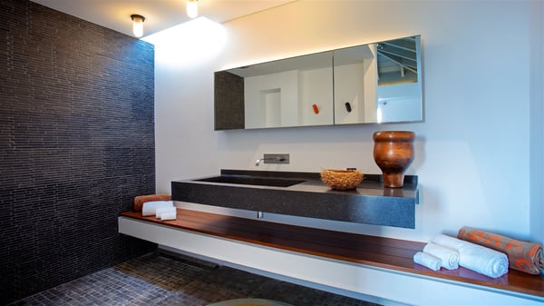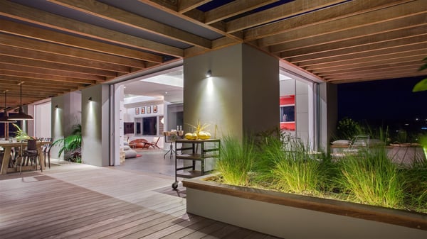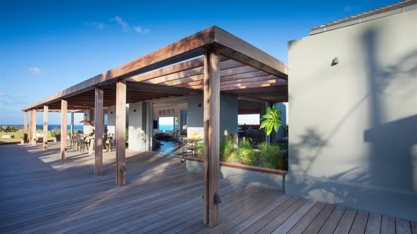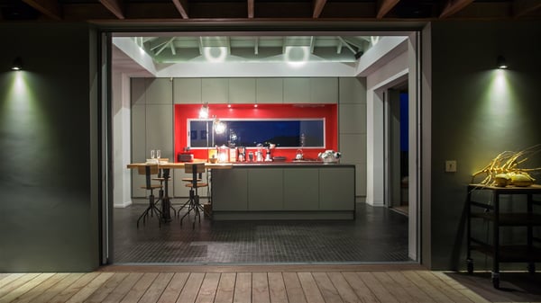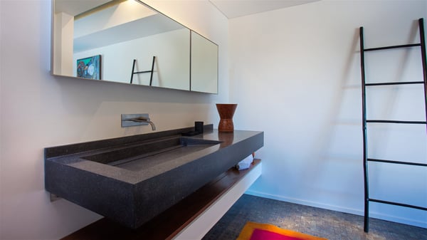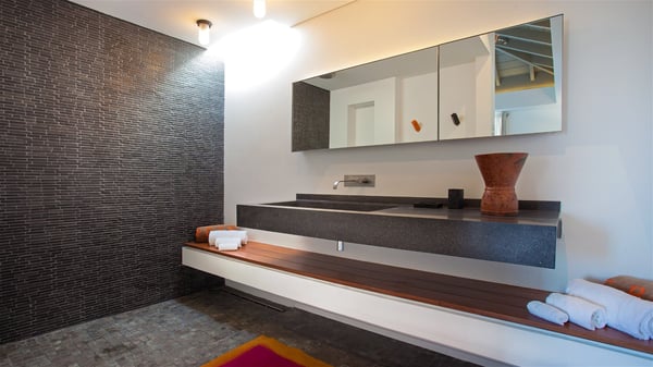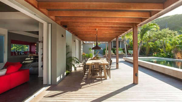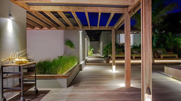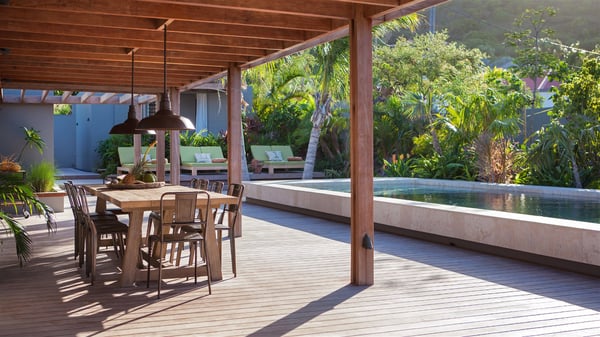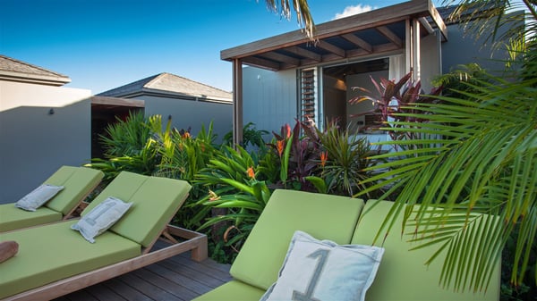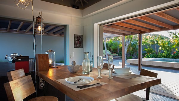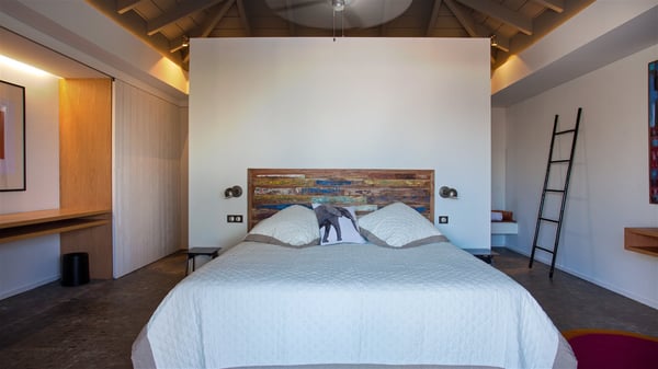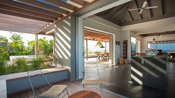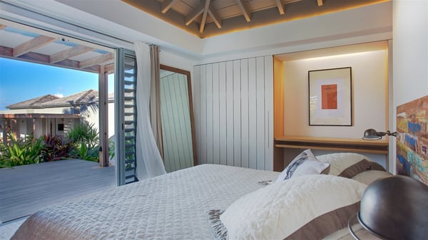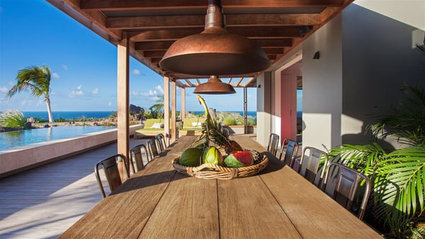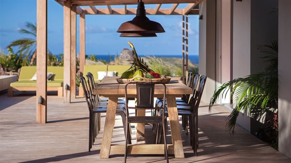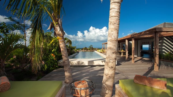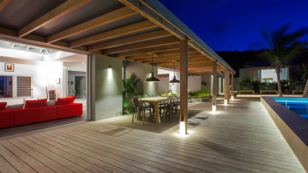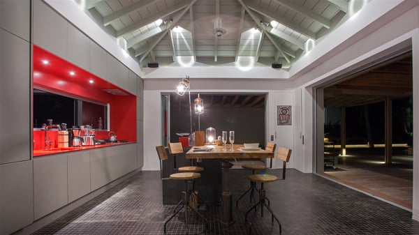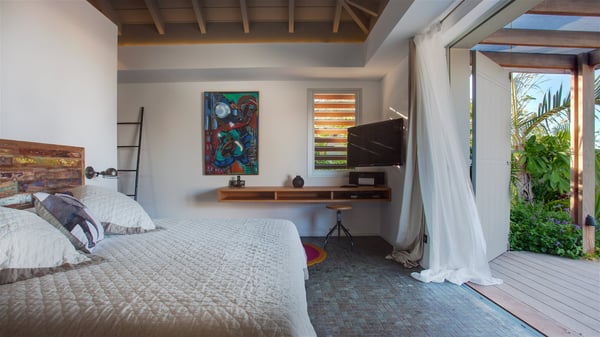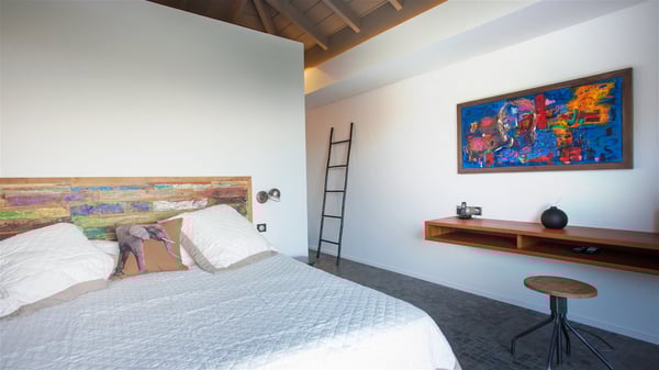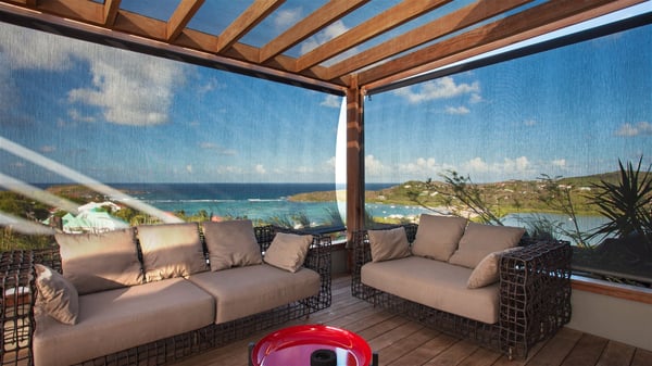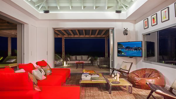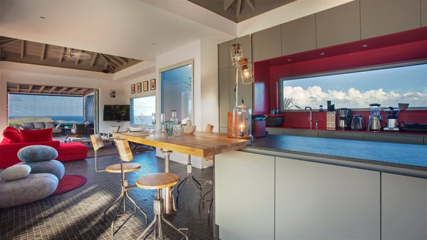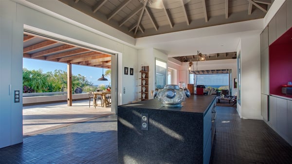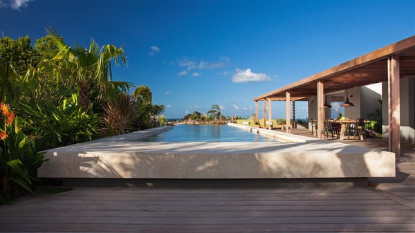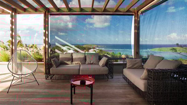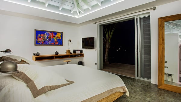 Villa Imagine is a luxurious three-bedroom property located on the heights of Marigot, with a splendid view over the Grand-Cul-de-Sac lagoon. It features a long swimming pool and a sunny deck surrounded by lush vegetation, the best place to welcome groups of up to six people in the tropical beauty of the Caribbean hills. Built on one level over three buildings, villa Imagine offers a stunning view over the turquoise waters of Grand-Cul-de-Sac lagoon. Its spacious living room is furnished with red sofas and armchairs and opens onto the terrace with pool. The fully-equipped kitchen with breakfast bar overlooks this bright indoor space, the right place to call upon a private chef for your events. This comfy main room also opens onto the back of the villa with a beautiful view over the Caribbean vegetation. There are local shrubs in the tropical garden, the perfect place to relax and breathe in the mild air of Saint-Barths. The vacation rental villa Imagine welcomes guests on beautiful terraces that surround the living areas and the bedrooms. The main outdoor space is built around a long swimming pool bordered by lush vegetation in front of the ocean. Comfy outdoor lounges with green soft cushions are at your disposal to sip a cocktail or chat at any time. The lovely wooden pergola filters the gentle breeze and the sun, making a very private place. Finally, at the villa front, you’ll find the dining room which can accommodate up to ten guests under the covered area, for delicious al fresco dinners watching the amazing view over the sparkling ocean reflections. Villa Imagine consists of three air-conditioned bedrooms with en-suite bathrooms, two of which are close to the main building with views over the hills, and the third one located at the end of the pool in a separate bungalow, with views over the pool and the ocean. The vaulted ceilings and colourful artwork create a most refined tropical ambiance, perfect to relax after days enjoying the lagoon waters. Ideally located on the hills of St-Barths in front of the lagoon, villa Imagine is the perfect place for a getaway with friends in the heart of the Caribbean.
