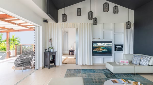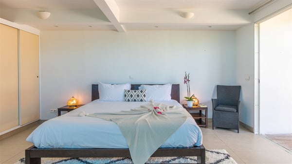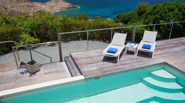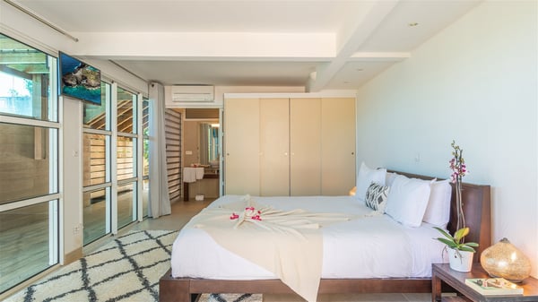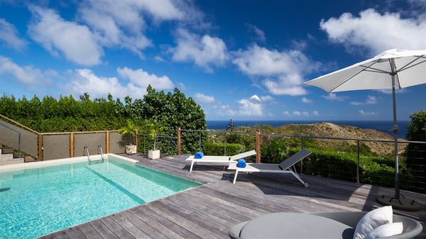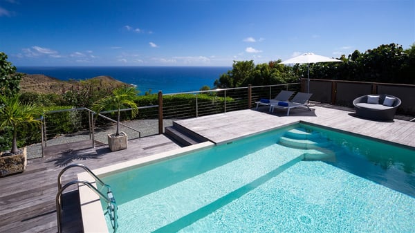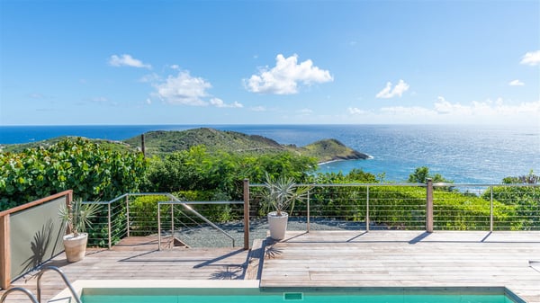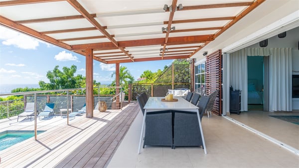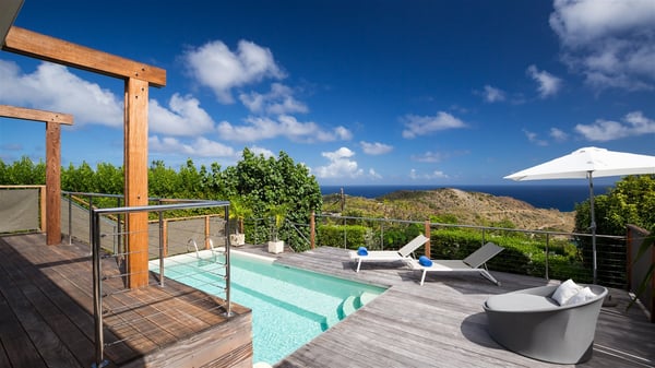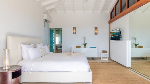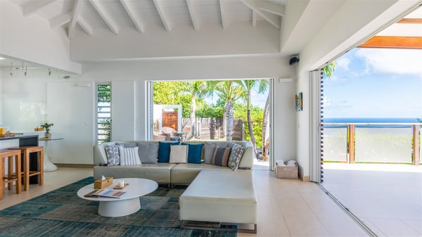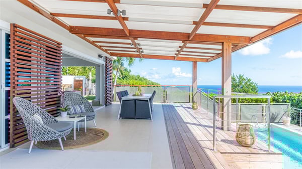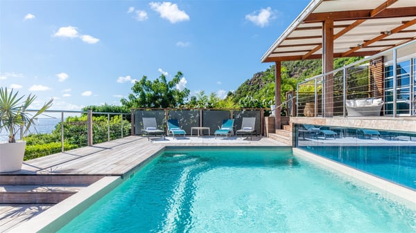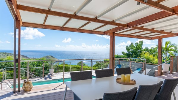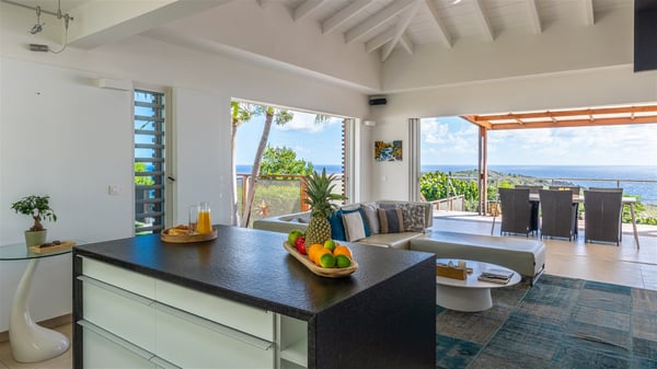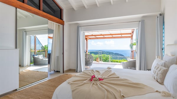 Nestled on a hillside in Dévé quiet area, the charming rental villa La Magnifica is a high-standard home facing the splendid ocean view and the sparkling sunrises. This two-bedroom vacation home is the ideal spot for a family or two couples of friends travelling together to St. Barths. This airy and cozy rental property is an idyllic place to enjoy the spectacular views and the quiet island. The airy and spacious living room is furnished with elegant, comfy sofas and opens onto the ocean-view terrace. The bright decor with a white high vaulted ceiling, and deep black hints, is both modern and sleek. It brings a refined touch to this open-plan living room where the mild air flows through the sliding windows. The well-equipped kitchen has a breakfast bar where guests can enjoy snacks and talk over a coffee. Outside, the terrace offers a breathtaking view over the ocean. Each morning, the rising sun offers a brand new fairytale decor to the villa. A dining table is set up under the covered terrace near the outdoor lounge, an ideal spot to enjoy a cocktail or read in the gentle St-Barths breeze. Further down, you'll enjoy relaxing in the lovely glistening swimming pool surrounded by lounge chairs for sunbathing sessions, while enjoying the view over Toiny Bay. At the side of the house, a pretty green lawn brings freshness to the tropical garden planted with palm and banana trees; there is a round table for three guests, a perfect place for a coffee break. Wherever you look, you'll be astonished by the beauty of the panorama. The holiday rental villa La Magnifica has two beautiful air-conditioned bedrooms with king-size beds, modern amenities and en-suite bathrooms. One bedroom is on the main level and opens onto the terrace with stunning ocean views, while the second one is on the lower level with a tropical garden view. The peaceful atmosphere brought by the light tones and comfortable fabrics makes these two rooms a haven of peace you’ll love to enjoy every evening under the Caribbean starry sky.