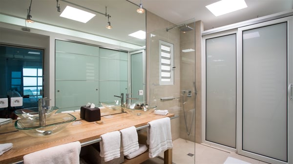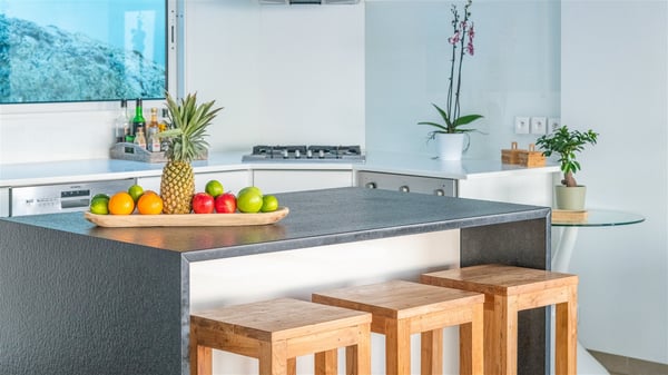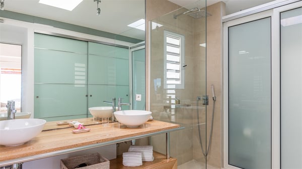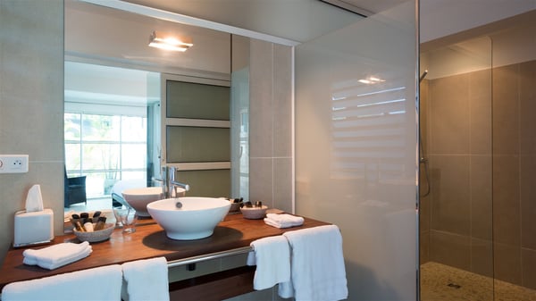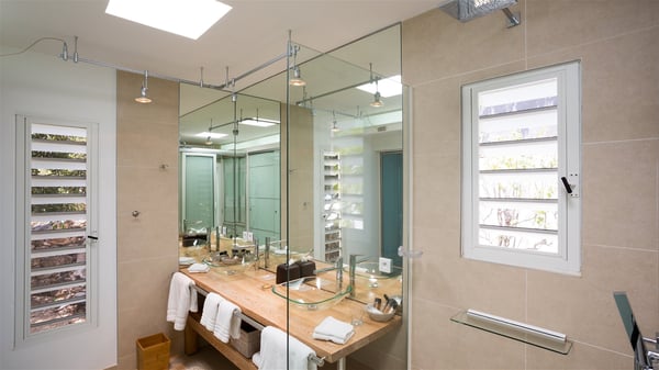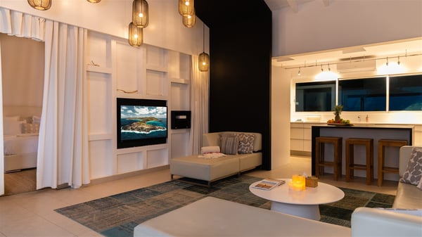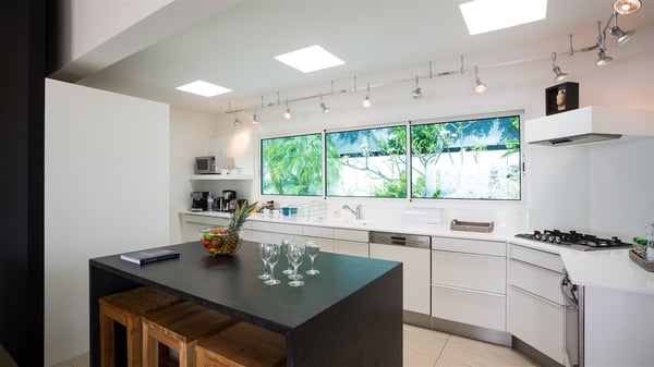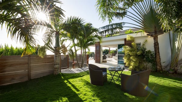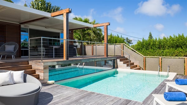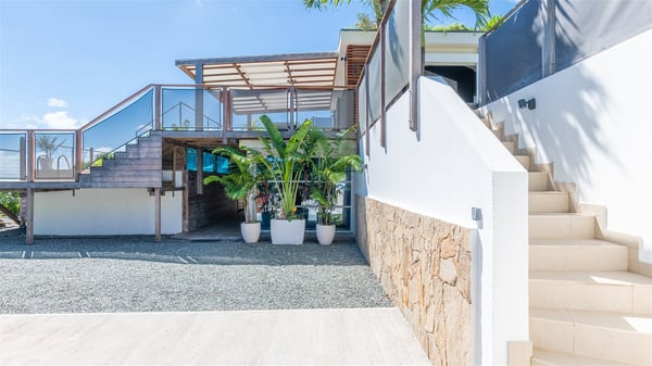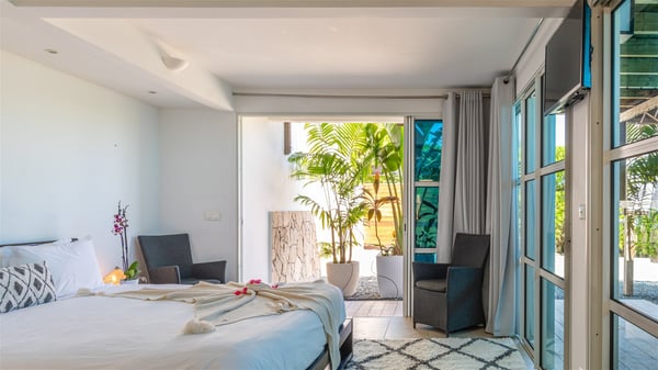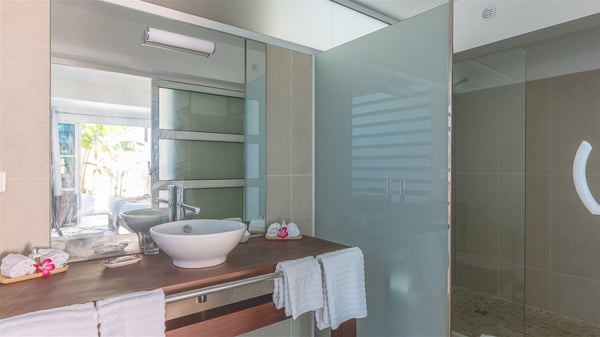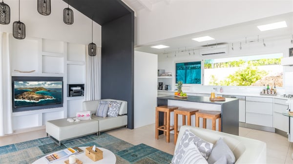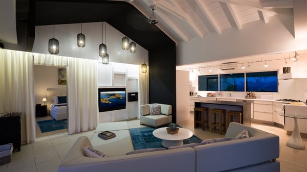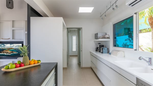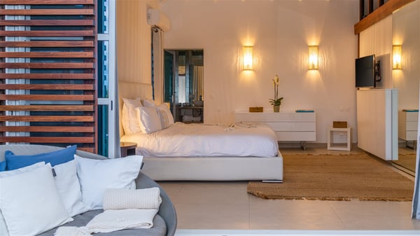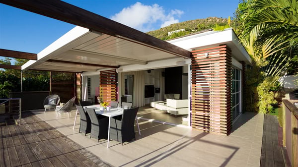 Nestled on a hillside in Dévé quiet area, the charming rental villa La Magnifica is a high-standard home facing the splendid ocean view and the sparkling sunrises. This two-bedroom vacation home is the ideal spot for a family or two couples of friends travelling together to St. Barths. This airy and cozy rental property is an idyllic place to enjoy the spectacular views and the quiet island. The airy and spacious living room is furnished with elegant, comfy sofas and opens onto the ocean-view terrace. The bright decor with a white high vaulted ceiling, and deep black hints, is both modern and sleek. It brings a refined touch to this open-plan living room where the mild air flows through the sliding windows. The well-equipped kitchen has a breakfast bar where guests can enjoy snacks and talk over a coffee. Outside, the terrace offers a breathtaking view over the ocean. Each morning, the rising sun offers a brand new fairytale decor to the villa. A dining table is set up under the covered terrace near the outdoor lounge, an ideal spot to enjoy a cocktail or read in the gentle St-Barths breeze. Further down, you'll enjoy relaxing in the lovely glistening swimming pool surrounded by lounge chairs for sunbathing sessions, while enjoying the view over Toiny Bay. At the side of the house, a pretty green lawn brings freshness to the tropical garden planted with palm and banana trees; there is a round table for three guests, a perfect place for a coffee break. Wherever you look, you'll be astonished by the beauty of the panorama. The holiday rental villa La Magnifica has two beautiful air-conditioned bedrooms with king-size beds, modern amenities and en-suite bathrooms. One bedroom is on the main level and opens onto the terrace with stunning ocean views, while the second one is on the lower level with a tropical garden view. The peaceful atmosphere brought by the light tones and comfortable fabrics makes these two rooms a haven of peace you’ll love to enjoy every evening under the Caribbean starry sky.