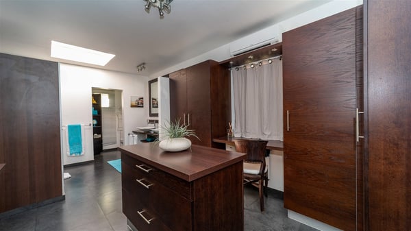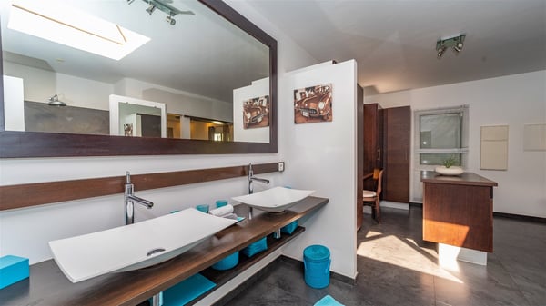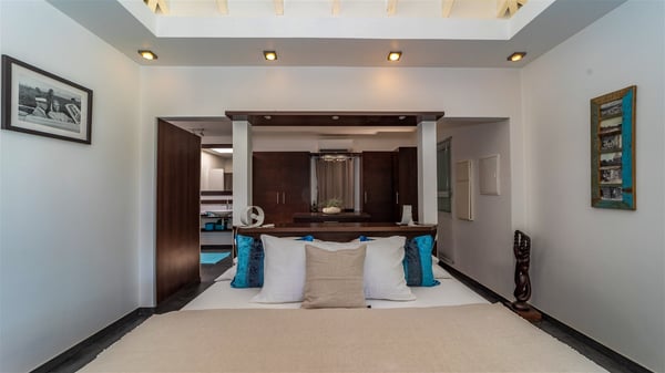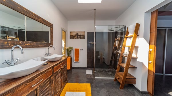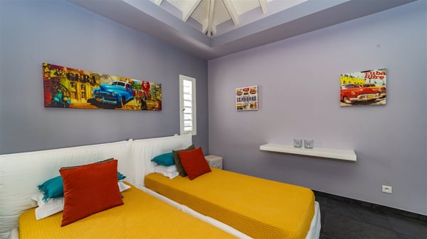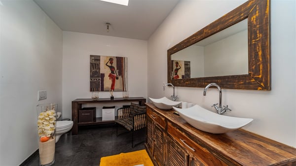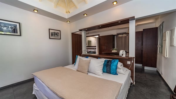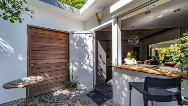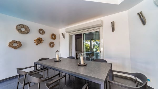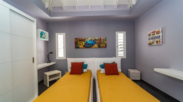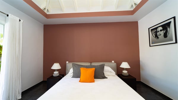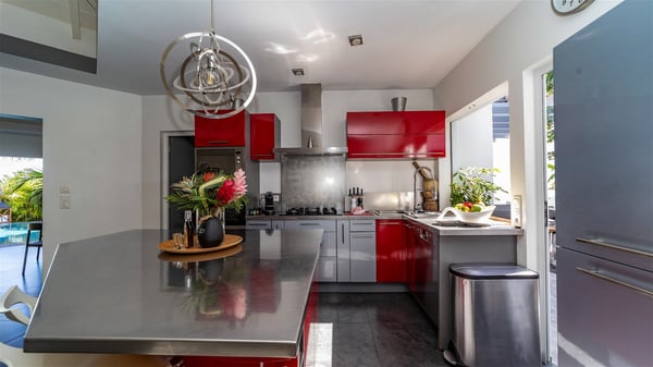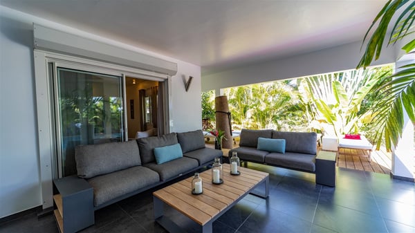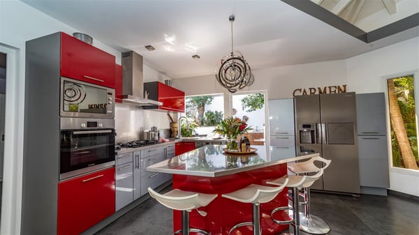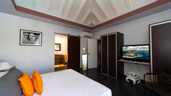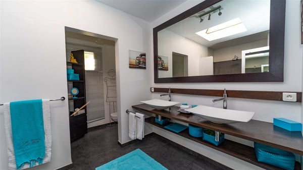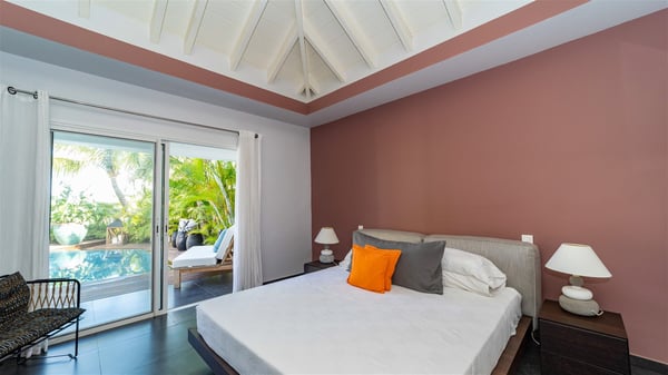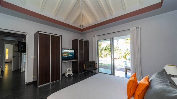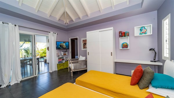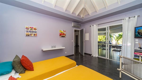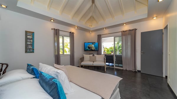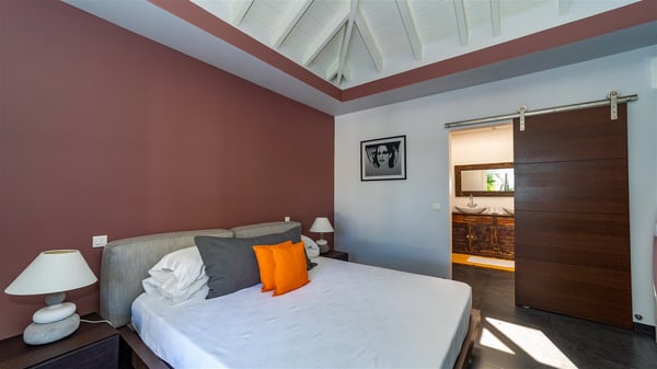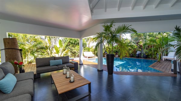 Located on the heights of Vitet, the sumptuous villa Carmen welcomes guests in the heart of the island of St-Barths. In a lush tropical vegetation setting with palm and banana trees, this vacation rental is the perfect spot for an unforgettable family stay in the Caribbean. The indoor and outdoor spaces merge to form a single unit in utmost comfort. Inside, you will enjoy the beautiful living room furnished with white sofas and armchairs covered with purple cushions, under high mansard ceilings which provide a pleasant sense of volume. There is a very nice kitchen with a red breakfast bar, well equipped to cook your meals with all the best appliances. It opens onto a terrace with a gas barbecue at the back of the house. At the front of the living room, the large covered terrace can be accessed through a large opening. It features an outdoor living room with a glass coffee table and a dining room that can accommodate up to eight guests in a driftwood decor. All is warm and cozy, with some pretty hints bringing both modernity and originality to the setup. On the large wooden deck, there is a beautiful heated hexagonal swimming pool nestled in the lush vegetation of St. Barts. You will love relaxing on the loungers and sunbeds, watching the splendid panorama over the deep blue ocean horizon in the background. Villa Carmen consists of three comfortable bedrooms opening onto the terrace and the view over the swimming pool. Two of them are communicating and share the same bathroom, making them perfect for a family with children. The bathrooms are spacious, and one of them even has a mansard roof window that brings in the pleasant light of the sun's rays. The charming villa Carmen offers the pleasant serenity you were searching for, for an idyllic vacation in the Caribbean.