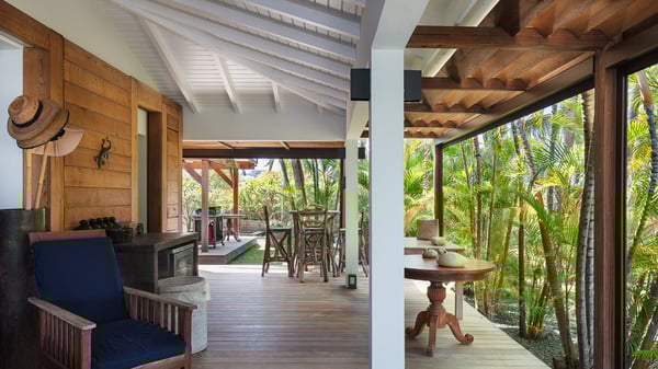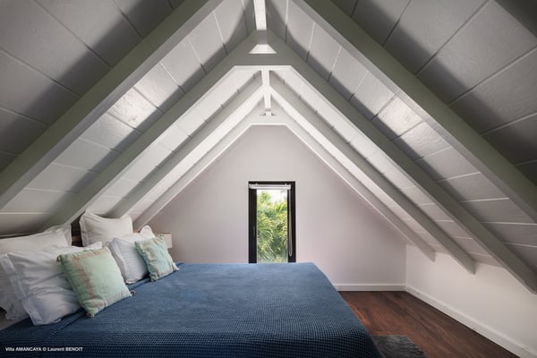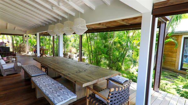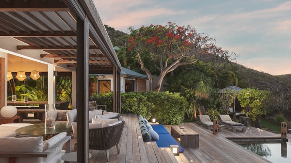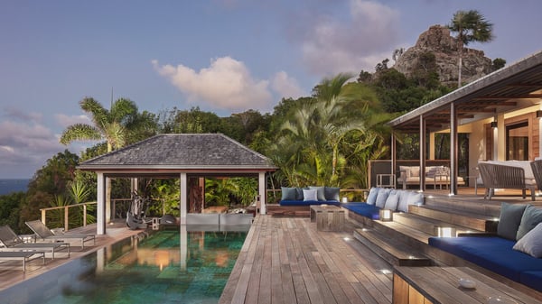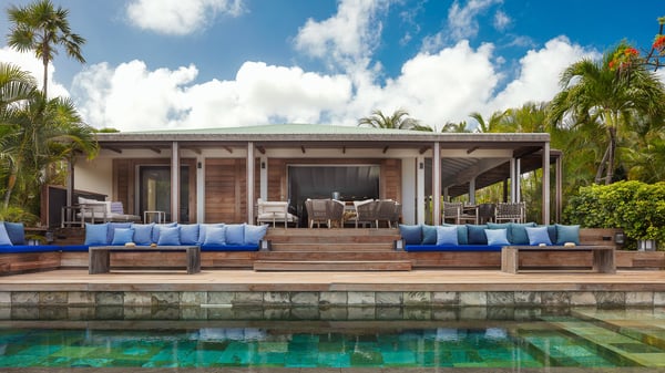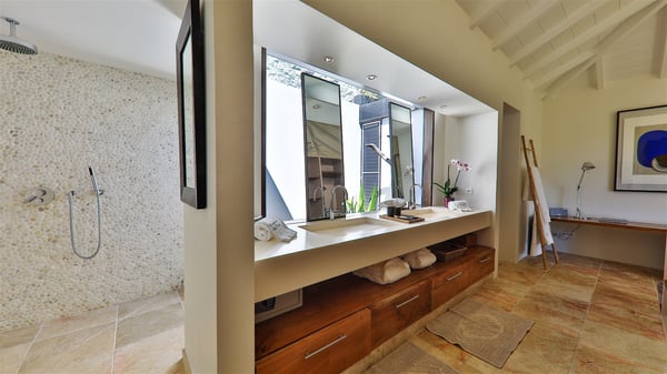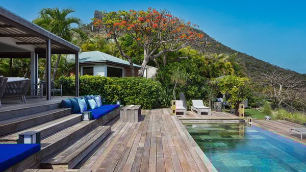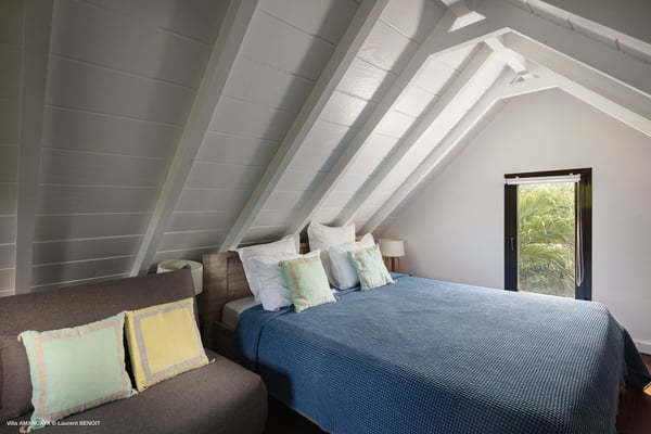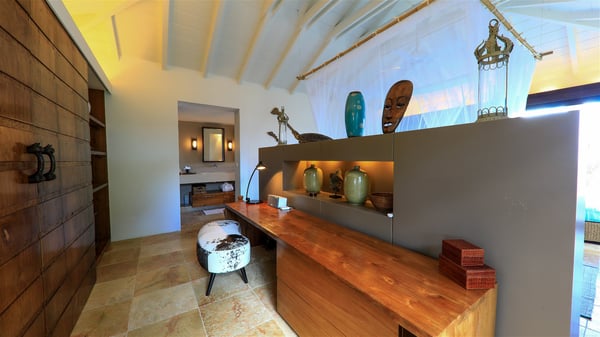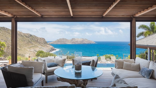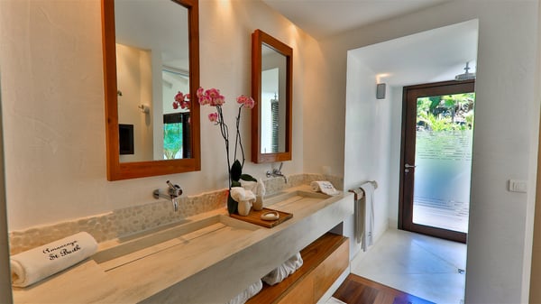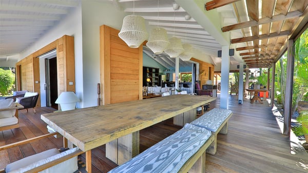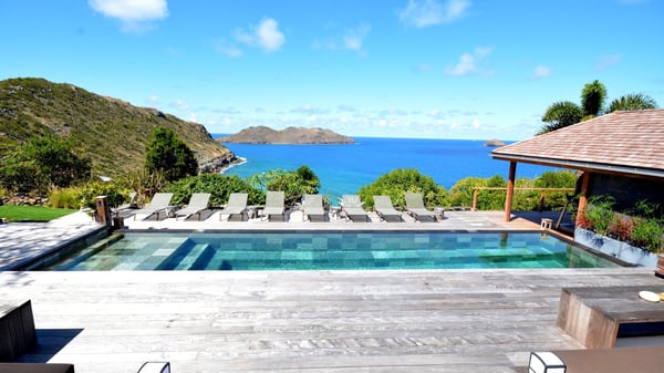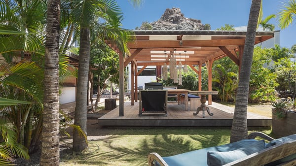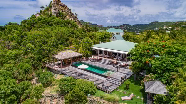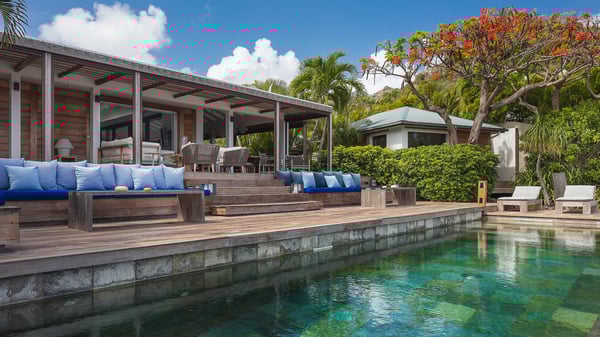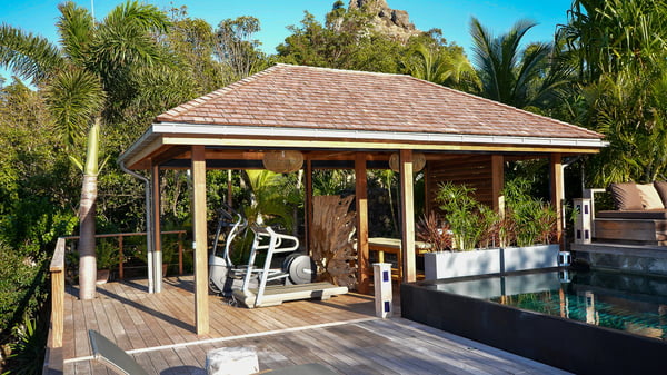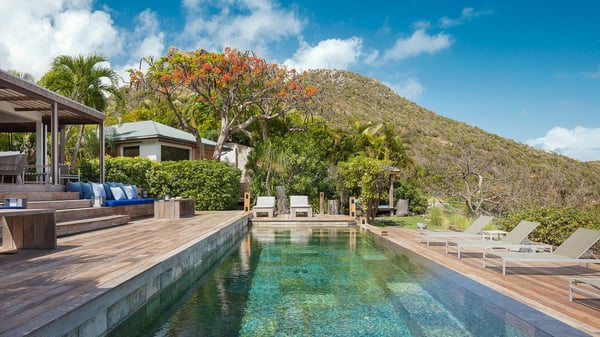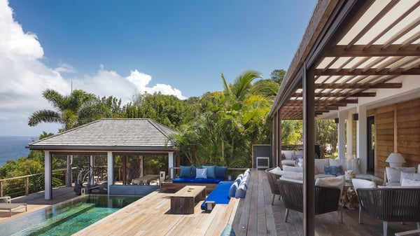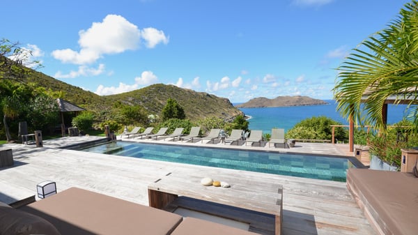 Nestled in a large tropical garden on the heights of Anse des Cayes, the luxurious vacation rental Amancaya is a haven of peace and serenity, the perfect place for a vacation with family or friends in St. Barthelemy. In a Balinese-inspired decoration, villa Amancaya is elegant and warm, in the zen atmosphere of the lush vegetation of Saint-Barths. Built in traditional architecture on one level, villa Amancaya extends over several bungalows around a central building facing the view. It is composed of a large living room furnished with a comfortable L-shaped sofa around a wooden table, for delightful moments facing the magnificent ocean view. There are carpets and cushions enhancing the warm tones of the furniture. Under a mansard ceiling, the dining area located under the covered terrace is composed of a large table, chairs and soft benches. The well-equipped kitchen is the perfect place to cook delicious meals or to call upon a private chef as you wish. An outdoor living room is located under the covered terrace which opens onto the large and beautiful heated swimming pool surrounded by a wooden deck with many loungers, perfect for relaxing and lazing around under the St. Barths sun. The panoramic ocean view is outstanding, as you watch it in the gentle trade wind. The vacation home Amancaya is composed of five large air-conditioned bedrooms furnished in a fine Balinese style. Two of them are located in the main building and have a king-size bed, an en-suite bathroom and direct access to the swimming pool and to the garden. Two other bedrooms are located in a separate bungalow, with king-size beds and private bathrooms. The fifth bedroom is located at the back of the villa with a garden view and an en-suite bathroom. It is composed of two twin beds and two single beds on the mezzanine. Finally, under an ajoupa close to the swimming pool, you can enjoy the fitness room equipped with a massage table, elliptical trainer and treadmill. The vacation villa Amancaya is an ideal choice for a wonderful vacation on the island of Saint Barthelemy.
