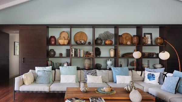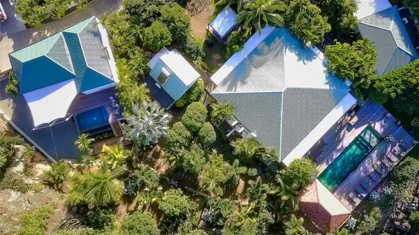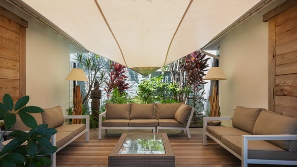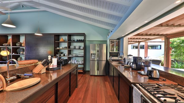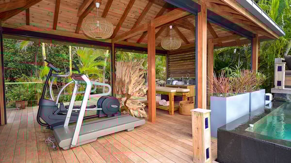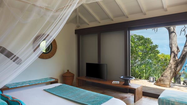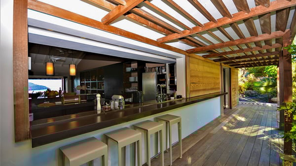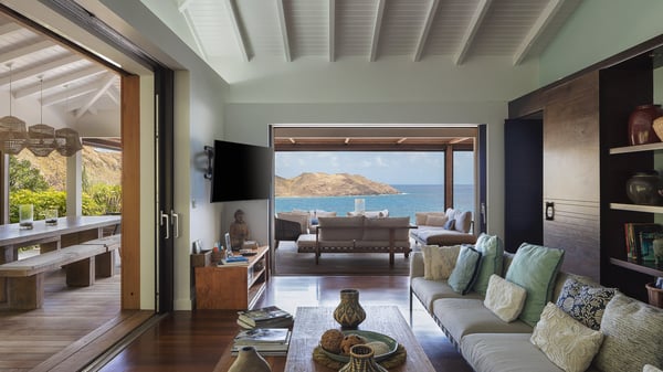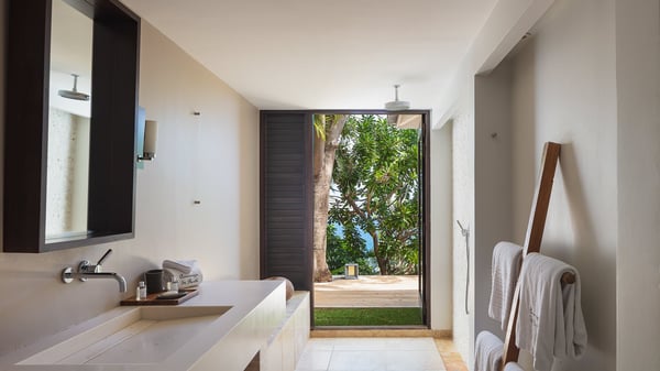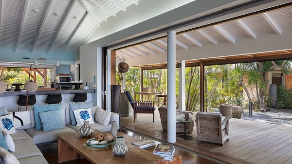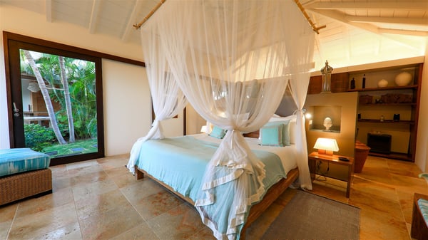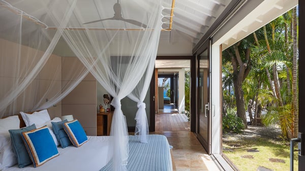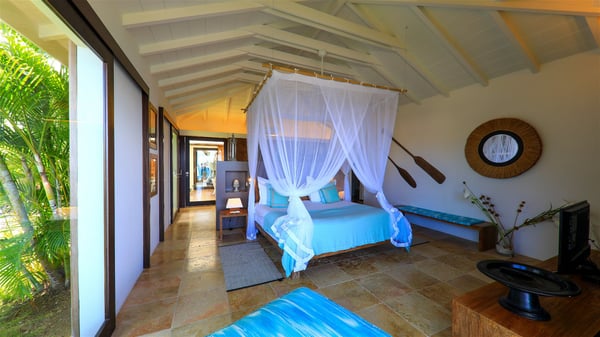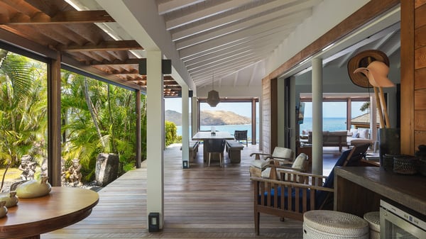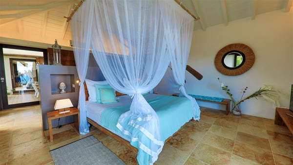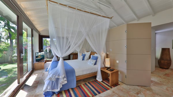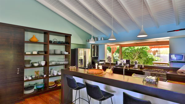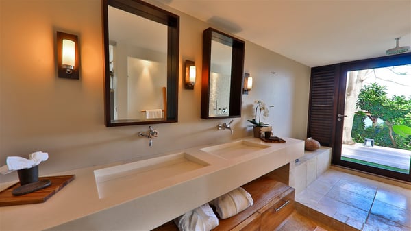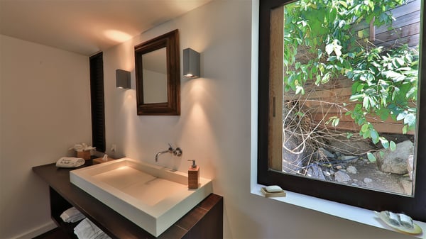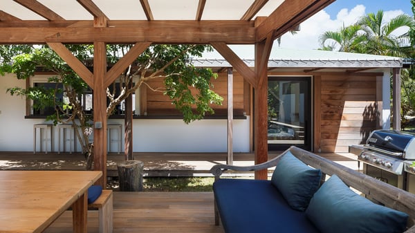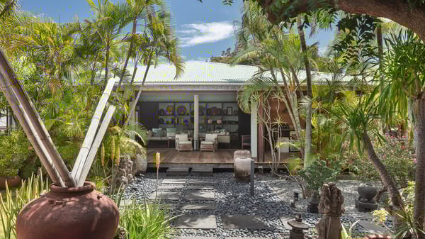 Nestled in a large tropical garden on the heights of Anse des Cayes, the luxurious vacation rental Amancaya is a haven of peace and serenity, the perfect place for a vacation with family or friends in St. Barthelemy. In a Balinese-inspired decoration, villa Amancaya is elegant and warm, in the zen atmosphere of the lush vegetation of Saint-Barths. Built in traditional architecture on one level, villa Amancaya extends over several bungalows around a central building facing the view. It is composed of a large living room furnished with a comfortable L-shaped sofa around a wooden table, for delightful moments facing the magnificent ocean view. There are carpets and cushions enhancing the warm tones of the furniture. Under a mansard ceiling, the dining area located under the covered terrace is composed of a large table, chairs and soft benches. The well-equipped kitchen is the perfect place to cook delicious meals or to call upon a private chef as you wish. An outdoor living room is located under the covered terrace which opens onto the large and beautiful heated swimming pool surrounded by a wooden deck with many loungers, perfect for relaxing and lazing around under the St. Barths sun. The panoramic ocean view is outstanding, as you watch it in the gentle trade wind. The vacation home Amancaya is composed of five large air-conditioned bedrooms furnished in a fine Balinese style. Two of them are located in the main building and have a king-size bed, an en-suite bathroom and direct access to the swimming pool and to the garden. Two other bedrooms are located in a separate bungalow, with king-size beds and private bathrooms. The fifth bedroom is located at the back of the villa with a garden view and an en-suite bathroom. It is composed of two twin beds and two single beds on the mezzanine. Finally, under an ajoupa close to the swimming pool, you can enjoy the fitness room equipped with a massage table, elliptical trainer and treadmill. The vacation villa Amancaya is an ideal choice for a wonderful vacation on the island of Saint Barthelemy.