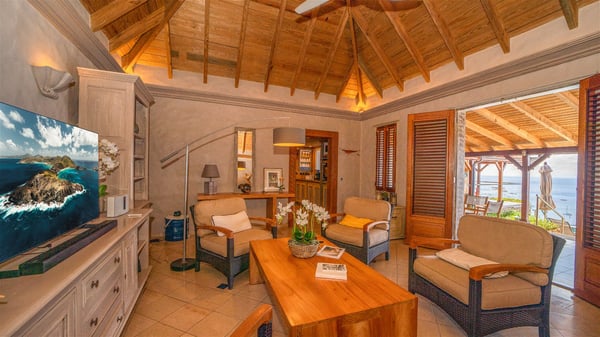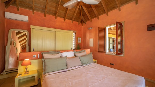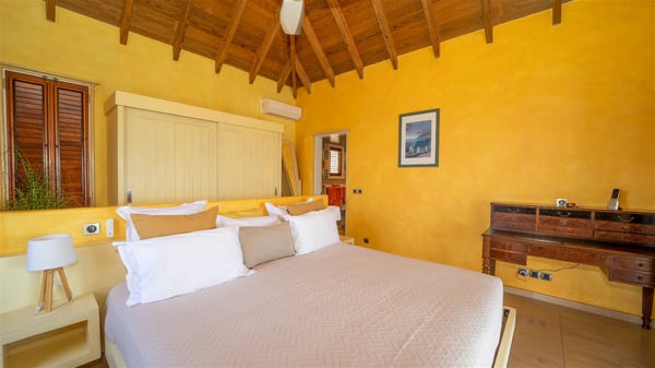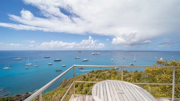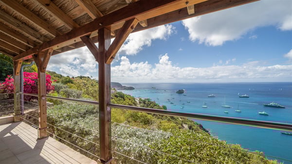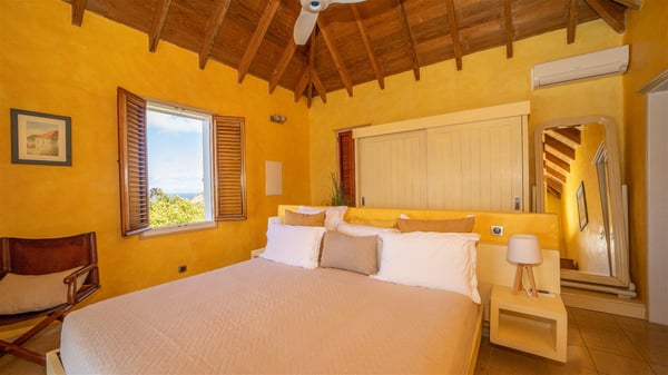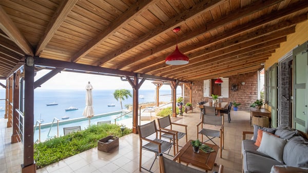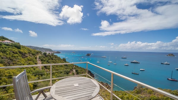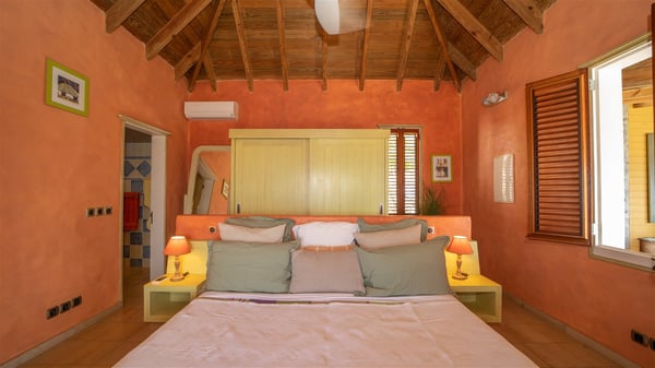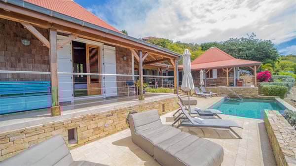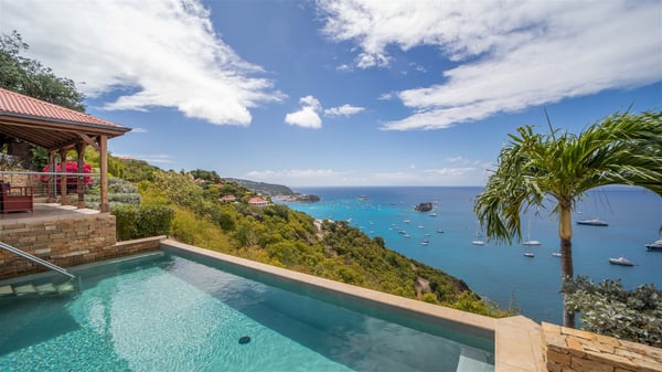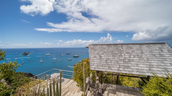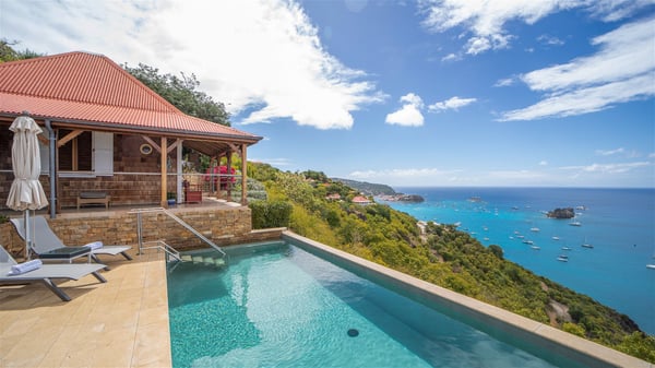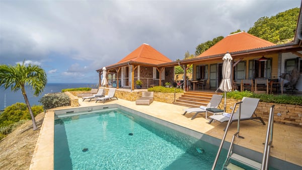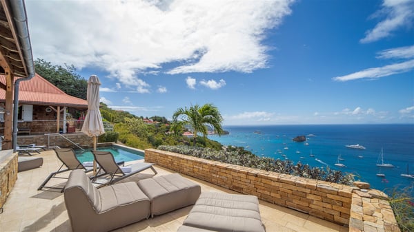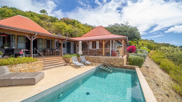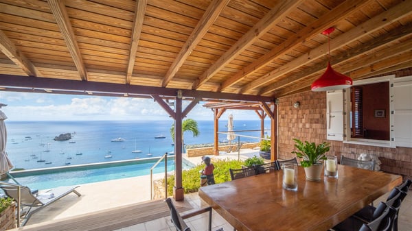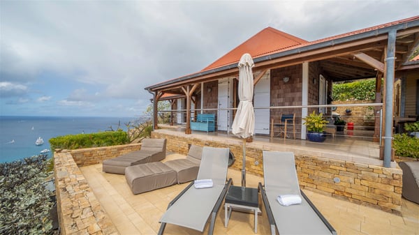 The vacation villa rental Hurakan is a charming property located in Colombier’s tropical beauty. Ideally facing west, this holiday home with a swimming pool is the perfect place to enjoy the glorious sunsets over the ocean. Comfortable and very private, villa Hurakan welcomes up to six guests in an elegant setting for an unforgettable stay in the Caribbean. Built on one level over two buildings connected by a shaded terrace, the vacation villa Hurakan is a Caribbean-style property ideally located in Colombier in front of the ocean. Its outstanding location makes it the perfect place to enjoy the sun all day long, until the evening when its glowing light shines in the golden sky. As soon as you come into the living room, you’ll love the serene and refined atmosphere in the spaces open onto both the front and back. The lounge is furnished with a sofa, armchairs and ceruse furniture under a vaulted ceiling with a beautiful honey-coloured woodwork. Close to it, the kitchen offers all the best appliances to cook meals and prepare cocktails. At the front, facing the sparkling ocean, the covered terrace shelters the al fresco dining room for eight guests, in a warm and private atmosphere protected by the building's side facades. There is also an outdoor lounge in this cozy space, perfect to sip a cocktail in front of the sunset over the ocean. A few steps ahead, you’ll enjoy the swimming pool with sunbeds on the large sunny terrace, above the deep-blue ocean and the breathtaking view over the horizon. In an idyllic scenery, umbrellas create a heavenly atmosphere, a best place to rest in a relaxing and very private ambience. The vacation rental villa Hurakan consists of three comfortable bedrooms with queen-sized beds and en-suite bathrooms spread throughout the property. In a warm decor with soft colours and silky fabrics, all three bedrooms open onto a stunning ocean view, and onto the terrace where you’ll love chilling and unwinding in a quiet and soothing atmosphere. In the heart of St-Barths’ beauty, villa Hurakan welcomes you for an idyllic stay with family or friends in the Caribbean.